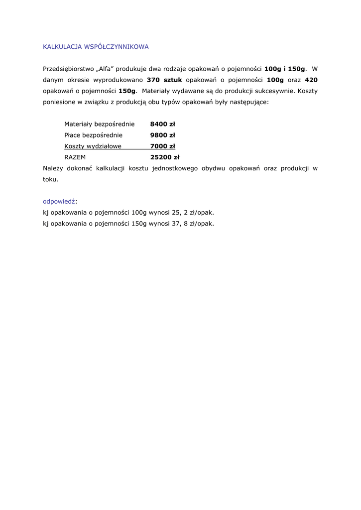 KALKULACJA WSPÓŁCZYNNIKOWA Przedsiębiorstwo „Alfa” produkuje dwa rodzaje opakowań o pojemności 100g i 150g. W danym okresie wyprodukowano 370 sztuk opakowań o pojemności 100g oraz 420 opakowań o pojemności 150g. Materiały wydawane są do produkcji sukcesywnie. Koszty poniesione w związku z produkcją obu typów opakowań były następujące: Materiały bezpośrednie 8400 zł Płace bezpośrednie 9800 zł Koszty wydziałowe 7000 zł RAZEM 25200 zł Należy dokonać kalkulacji kosztu jednostkowego obydwu opakowań oraz produkcji w toku. odpowiedź: kj opakowania o pojemności 100g wynosi 25, 2 zł/opak. kj opakowania o pojemności 150g wynosi 37, 8 zł/opak.