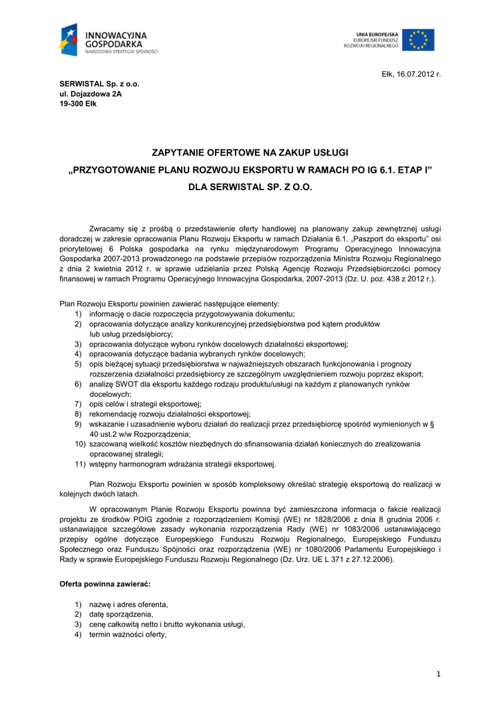 Ełk, 16.07.2012 r. SERWISTAL Sp. z o.o. ul. Dojazdowa 2A 19-300 Ełk ZAPYTANIE OFERTOWE NA ZAKUP USŁUGI „PRZYGOTOWANIE PLANU ROZWOJU EKSPORTU W RAMACH PO IG 6.1. ETAP I” DLA SERWISTAL SP. Z O.O. Zwracamy się z prośbą o przedstawienie oferty handlowej na planowany zakup zewnętrznej usługi doradczej w zakresie opracowania Planu Rozwoju Eksportu w ramach Działania 6.1. „Paszport do eksportu” osi priorytetowej 6 Polska gospodarka na rynku międzynarodowym Programu Operacyjnego Innowacyjna Gospodarka 2007-2013 prowadzonego na podstawie przepisów rozporządzenia Ministra Rozwoju Regionalnego z dnia 2 kwietnia 2012 r. w sprawie udzielania przez Polską Agencję Rozwoju Przedsiębiorczości pomocy finansowej w ramach Programu Operacyjnego Innowacyjna Gospodarka, 2007-2013 (Dz. U. poz. 438 z 2012 r.). Plan Rozwoju Eksportu powinien zawierać następujące elementy: 1) informację o dacie rozpoczęcia przygotowywania dokumentu; 2) opracowania dotyczące analizy konkurencyjnej przedsiębiorstwa pod kątem produktów lub usług przedsiębiorcy; 3) opracowania dotyczące wyboru rynków docelowych działalności eksportowej; 4) opracowania dotyczące badania wybranych rynków docelowych; 5) opis bieżącej sytuacji przedsiębiorstwa w najważniejszych obszarach funkcjonowania i prognozy rozszerzenia działalności przedsiębiorcy ze szczególnym uwzględnieniem rozwoju poprzez eksport; 6) analizę SWOT dla eksportu każdego rodzaju produktu/usługi na każdym z planowanych rynków docelowych; 7) opis celów i strategii eksportowej; 8) rekomendację rozwoju działalności eksportowej; 9) wskazanie i uzasadnienie wyboru działań do realizacji przez przedsiębiorcę spośród wymienionych w § 40 ust.2 w/w Rozporządzenia; 10) szacowaną wielkość kosztów niezbędnych do sfinansowania działań koniecznych do zrealizowania opracowanej strategii; 11) wstępny harmonogram wdrażania strategii eksportowej. Plan Rozwoju Eksportu powinien w sposób kompleksowy określać strategię eksportową do realizacji w kolejnych dwóch latach. W opracowanym Planie Rozwoju Eksportu powinna być zamieszczona informacja o fakcie realizacji projektu ze środków POIG zgodnie z rozporządzeniem Komisji (WE) nr 1828/2006 z dnia 8 grudnia 2006 r. ustanawiające szczegółowe zasady wykonania rozporządzenia Rady (WE) nr 1083/2006 ustanawiającego przepisy ogólne dotyczące Europejskiego Funduszu Rozwoju Regionalnego, Europejskiego Funduszu Społecznego oraz Funduszu Spójności oraz rozporządzenia (WE) nr 1080/2006 Parlamentu Europejskiego i Rady w sprawie Europejskiego Funduszu Rozwoju Regionalnego (Dz. Urz. UE L 371 z 27.12.2006). Oferta powinna zawierać: 1) 2) 3) 4) nazwę i adres oferenta, datę sporządzenia, cenę całkowitą netto i brutto wykonania usługi, termin ważności oferty, 1 warunki i termin płatności, maksymalny czas realizacji opracowania Planu Rozwoju Eksportu, informacje nt. wykonanych PRE wraz ze wskazaniem Zleceniodawców (osoba do kontaktu, nr tel.), informacje nt. wniosków w ramach Działania 6.1 PO IG wraz ze wskazaniem Zleceniodawców (osoba do kontaktu, nr tel.), 9) informacje nt. doświadczenia w zakresie kompleksowej organizacji wyjazdów na zagraniczne imprezy targowo-wystawiennicze, 10) podpis wykonawcy wraz z pieczątką imienną i firmową. 5) 6) 7) 8) Oferta powinna być ważna do: 31 sierpnia 2012 r. Oferta powinna być sporządzona na papierze firmowym oferenta, posiadać datę sporządzenia oraz powinna być podpisana. Oferta może być przekazana: 1) za pośrednictwem poczty elektronicznej na adres: [email protected], 2) za pośrednictwem poczty na adres: SERWISTAL Sp. z o.o. ul. Dojazdowa 2A, 19-300 Ełk, 3) osobiście do siedziby firmy. Zapytanie ofertowe zamieszczone zostało na stronie: www.serwistal.pl oraz w siedzibie firmy. Termin składania ofert upływa w dniu: 20.07.2012 r. Planowany termin rozstrzygnięcia postępowania ofertowego i wyłonienie oferenta nie później niż do dnia 23.07.2012 r. włącznie. Wybór najkorzystniejszej oferty nastąpi w oparciu o następujące kryteria: Lp. 1 Nazwa Cena całkowita za usługę 2 Warunki płatności 3 Termin realizacji zlecenia 3 Ubezpieczenie realizacji projektu 4 Doświadczenie w zakresie sporządzenia pozytywnie zweryfikowanych PRE 5 Doświadczenie w zakresie sporządzenia wniosków do I i II etapu – projekty Sposób oceny Do 12 500 zł netto – 20 pkt. Powyżej 12 500 zł netto – 0 pkt. Oferta zawiera klauzulę o braku obowiązku dokonania zapłaty w przypadku negatywnej weryfikacji PRE – 10 pkt. Oferta nie zawiera klauzuli o braku obowiązku dokonania zapłaty w przypadku negatywnej weryfikacji PRE – 0 pkt. do 22 sierpnia 2012 r. włącznie – 10 pkt. termin realizacji wykraczający poza datę 22 sierpnia 2012 r. – 0 pkt. Oferent posiada ubezpieczenie odpowiedzialności cywilnej od niewykonania lub nienależytego wykonania przedmiotu umowy na kwotę minimum 500 000 zł − 10 pkt. Oferent nie posiada ubezpieczenia odpowiedzialności cywilnej od niewykonania lub nienależytego wykonania przedmiotu umowy na kwotę minimum 500 000 zł − 0 pkt. Zleceniobiorca wykonał 50 lub więcej PRE – 20 pkt. Zleceniobiorca wykonał 25-49 PRE – 10 pkt. Zleceniobiorca wykonał poniżej 25 PRE – 0 pkt. Zleceniobiorca opracował 50 lub więcej wniosków do I i II etapu – 20 pkt. Max l. punktów 20 10 10 10 20 20 Zleceniobiorca wykonał 25-49 wniosków do I i II etapu – 10 pkt. 2 pozytywnie ocenione 6 Doświadczenie w zakresie kompleksowego organizowania wyjazdów na zagraniczne imprezy targowo- wystawiennicze Zleceniobiorca wykonał poniżej 25 wniosków do I i II etapu – 0 pkt. Zleceniobiorca zorganizował wyjazdy na targi zagraniczne – w liczbie 50 i więcej – 10 pkt. Zleceniobiorca zorganizował wyjazdy na targi zagraniczne – w liczbie 25-49 – 8 pkt. Zleceniobiorca zorganizował wyjazdy na targi zagraniczne – w liczbie 10-24 – 5 pkt. Zleceniobiorca zorganizował wyjazdy na targi za