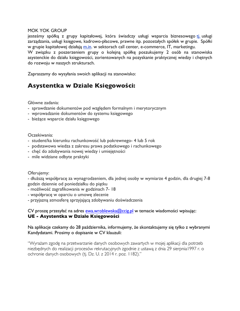 MOK YOK GROUP jesteśmy spółką z grupy kapitałowej, która świadczy usługi wsparcia biznesowego tj. usługi zarządzania, usługi księgowe, kadrowo-płacowe, prawne itp. pozostałych spółek w grupie. Spółki w grupie kapitałowej działają m.in. w sektorach call center, e-commerce, IT, marketingu. W związku z poszerzeniem grupy o kolejną spółkę poszukujemy 2 osób na stanowiska asystenckie do działu księgowości, zorientowanych na pozyskanie praktycznej wiedzy i chętnych do rozwoju w naszych strukturach. Zapraszamy do wysyłania swoich aplikacji na stanowisko: Asystentka w Dziale Księgowości: Główne zadania: - sprawdzanie dokumentów pod względem formalnym i merytorycznym - wprowadzanie dokumentów do systemu księgowego - bieżące wsparcie działu księgowego Oczekiwania: - student/ka kierunku rachunkowość lub pokrewnego- 4 lub 5 rok - podstawowa wiedza z zakresu prawa podatkowego i rachunkowego - chęć do zdobywania nowej wiedzy i umiejętności - mile widziane odbyte praktyki Oferujemy: - dłuższą współpracę za wynagrodzeniem, dla jednej osoby w wymiarze 4 godzin, dla drugiej 7-8 godzin dziennie od poniedziałku do piątku - możliwość zagrafikowania w godzinach 7- 18 - współpracę w oparciu o umowę zlecenie - przyjazną atmosferę sprzyjającą zdobywaniu doświadczenia CV proszę przesyłać na adres [email protected] w temacie wiadomości wpisując: UE - Asystentka w Dziale Księgowości Na aplikacje czekamy do 28 października, informujemy, że skontaktujemy się tylko z wybranymi Kandydatami. Prosimy o dopisanie w CV klauzuli: “Wyrażam zgodę̨ na przetwarzanie danych osobowych zawartych w mojej aplikacji dla potrzeb niezbędnych do realizacji procesów rekrutacyjnych zgodnie z ustawą z dnia 29 sierpnia1997 r. o ochronie danych osobowych (tj. Dz. U. z 2014 r. poz. 1182).”