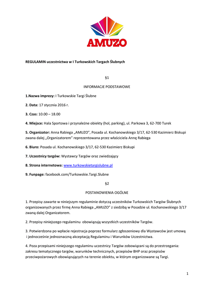 REGULAMIN uczestnictwa w I Turkowskich Targach Ślubnych §1 INFORMACJE PODSTAWOWE 1.Nazwa imprezy: I Turkowskie Targi Ślubne 2. Data: 17 stycznia 2016 r. 3. Czas: 10.00 – 18.00 4. Miejsce: Hala Sportowa i przynależne obiekty (hol, parking), ul. Parkowa 3, 62-700 Turek 5. Organizator: Anna Rabiega „AMUZO”, Posada ul. Kochanowskiego 3/17, 62-530 Kazimierz Biskupi zwana dalej „Organizatorem” reprezentowana przez właściciela Annę Rabiega 6. Biuro: Posada ul. Kochanowskiego 3/17, 62-530 Kazimierz Biskupi 7. Uczestnicy targów: Wystawcy Targów oraz zwiedzający 8. Strona internetowa: www.turkowskietargislubne.pl 9. Funpage: facebook.com/Turkowskie.Targi.Slubne §2 POSTANOWIENIA OGÓLNE 1. Przepisy zawarte w niniejszym regulaminie dotyczą uczestników Turkowskich Targów Ślubnych organizowanych przez firmę Anna Rabiega „AMUZO” z siedzibą w Posadzie ul. Kochanowskiego 3/17 zwaną dalej Organizatorem. 2. Przepisy niniejszego regulaminu obowiązują wszystkich uczestników Targów. 3. Potwierdzona po wpłacie rejestracja poprzez formularz zgłoszeniowy dla Wystawców jest umową i jednocześnie jednoznaczną akceptacją Regulaminu i Warunków Uczestnictwa. 4. Poza przepisami niniejszego regulaminu uczestnicy Targów zobowiązani są do przestrzegania: zakresu tematycznego targów, warunków technicznych, przepisów BHP oraz przepisów przeciwpożarowych obowiązujących na terenie obiektu, w którym organizowane są Targi. 1 5. Zakres Turkowskich Targów Ślubnych obejmuje następujące zagadnienia: suknie, garnitury oraz dodatki ślubne, odzież damska, męska, galanteria odzieżowa, bielizna, obuwie, studia fotografii, usługi wideo, kwiaciarnie, pracownie florystyczne salony jubilerskie, studia dekoracji ślubnej, firmy zajmujące się kompleksową obsługą ślubów i wesel, restauracje, hotele i lokale organizujące przyjęcia weselne, firmy gastronomiczne i cateringowe, cukiernie firmy wynajmujące samochody i limuzyny ślubne, transport dla gości weselnych firmy poligraficzne (karty okolicznościowe, zaproszenia), sklepy z artykułami ślubnymi salony fryzjerskie, kosmetyczne, wizażu i stylizacji, zespoły muzyczne, firmy oferujące prezenty ślubne, biura podróży, wydawnictwa branżowe, oferty specjalne dla młodych małżeństw: finansowe, mieszkaniowe, ubezpieczeniowe. §3 FORMA UDZIAŁU 1. Wystawca bierze udział w Targach wyłącznie we własnym imieniu. 2. Prezentowanie się na Targach jest odpłatne. 2. Wystawca może prezentować się uczestnikom Targów poprzez: wykupioną powierzchnię wystawienniczą, sponsoring, prezentacje na scenie (pokazy, występy), kolportaż ulotek – zgodnie z Warunkami Uczestnictwa. 2. Wystawca nie jest uprawniony do podnajmowania lub do oddawania w bezpłatne użytkowanie całości, względnie części powierzchni wystawienniczej innym podmiotom, bez uprzedniej pisemnej zgody Organizatora. W przypadku naruszenia powyższego zakazu Organizator będzie mógł nałożyć na Wystawcę karę umowną w wysokości 100% wartości wynikającej z Formularza Rejestracyjnego. §4 ODWOŁANIE UCZESTNICTWA 1. Wystawca ma prawo zrezygnować z uczestnictwa w Targach pod warunkiem pisemnego zawiadomienia Organizatora do dnia 8 stycznia 2016 r. 2. W razie rezygnacji Wystawcy Organizator pobiera 50% opłat wynikających z umowy uczestnictwa. 3. Nie wzięcie udziału w Tragach tj. nie wystawienie się Wystawcy nie wyłącza obowiązku uiszczenia Organizatorowi opłat wynikających z zawartej umowy, co oznacza, iż mogą być one dochodzone przez Organizatora w pełnej wysokości. 2 §5 WSPÓŁWYSTAWCY 1. Wystawca zobowiązany jest do poinformowania Organizatorów na piśmie, pod rygorem nieważności, o współwystawcy korzystającym z części stoiska wystawcy i prezentującego własne produkty lub/i usługi. 2. Organizatorzy informują o wyrażeniu lub nie wyrażeniu zgody na udział w targach współwystawcy na piśmie. 3. Współwystawcy zobowiązani są do przestrzegania regulaminu uczestnictwa w Targach. §6 STANOWISKA WYSTAWIENNICZE I INNE USŁUGI 1. Przedmiotem wynajmu jest powierzchnia wynajmu, a nie konkretne stoisko/stoiska. 2. Prezentowany na stronie plan rozmieszczenia stoisk ma charakter poglądowy. 3. Ostateczny plan rozmieszczenia stoisk ustala Organizator. Na podstawie kolejności zgłoszeń Wystawców oraz wielkości zamówionej powierzchni wystawienniczej Organizator zastrzega sobie prawo do modyfikacji planu rozmieszczenia stoisk, o którym mowa w § 6 pkt 2. 4. Podstawowa powierzchnia stoiska wynosi 4 m2 (2m x 2m). Istnieje możliwość łączenia. 5. Potwierdzona rezerwacja powierzchni wystawienniczej następuje po wysłaniu Formularza Zgłoszeniowego zamieszczonego na stronie internetowej www.turkowskietargislubne.pl i profilu facebook.com/Turkowskie.Targi.Slubne oraz po dokonaniu wpłaty 100% wartości zamówionego stanowiska na podstawie Warunków Uczestnictwa na konto 30 2490 0005 0000 4000 6078 1059 w terminie 7 dni roboczych od dnia zgłoszenia. 6. W przypadku nie dokonania wpłaty wstępna rezerwacja zostanie anulowana 8 dnia od daty zgłoszenia. 7. Zamówienie dodatkowych usług ujętych w Warunkach Uczestnictwa następuje po wysłaniu Formularza Zgłoszeniowego zamieszczonego na stronie internetowej www.turkowskietargislubne.pl i profilu facebook.com/Turkowskie.Targi.Slubne oraz po dokonaniu wpłaty 100% wartości zamówionego stanowiska na podstawie Warunków Uczestnictwa na konto 30 2490 0005 0000 4000 6078 1059 najpóźniej do 11 stycznia 2016 roku. 3 §7 OBOWIĄZKI ORGANIZATORA 1. Organizator zapewni odpowiednią powierzchnię wystawienniczą oraz pozostałe usługi w dniu Targów tj. 17 stycznia 2016r. 2. Organizator zapewni czas potrzebny do przygotowania stoiska od 14:00 - 20:00 16 stycznia 2016 r. 3. Organizator zapewni dostęp do prądu. 4. Organizator zapewni odpowiednią oprawę Targów (scena, nagłośnienie, konferansjer) oraz prezentację wystawców. 5. Organizator bierze na siebie opłaty należne o
