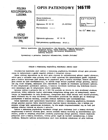 POLSKA RZECZPOSPOLITA OPIS PATENTOWY 146110 LUDOWA Patent dodatkowy mm. IBP siflb czyiclnia! do patentu nr Zgłoszono: 86 02 03 /P.257762/ Urzędu flj»*w»*#,-ył 1 MlNł •* •' Pierwszeństwo Int. Cl.4 B04C 5/12 URZĄD PATENTOWY PRL Zgłoszenie ogłoszono: 87 10 19 Opis patentowy opublikowano: 89 05 31 Twórcy wynalazku: Jan Grzywnowicz, Jan Harpula, Zbigniew Maniowskit Zbigniew Górny, Józef Tokarski, Andrzej Heryan, Stanisław Burda, Bartłomiej Grzywnowicz, Andrzej Harpula Uprawniony z patentus Instytut Odlewnictwa, Kraków /Polska/ CYKLON Z WYMUSZ0N4 PRCDK0&CI4 WIROWANIA STRUGI GAZU Przedmiotem wynalazku jest cyklon z wymuszoną prędkością wirowania strugi gazu przezna¬ czony do wydzielania z gazów cząstek stałych i kropelek cieczy. Znane cyklony wyposażone są we wlot gazu styczny do cylindrycznej górnej części płaszcza, odlot gazu z cylindra rurą pionową oraz w otwór spustowy dla wydzielanych pyłów* Prędkość gazu w króćcu wylotowym jest zbliżona do prędkości gazu w króócu wlotowym* Komora wirowania gazu stawia mu opór aerodynamiczny, na skutek czego maleje prędkość strugi gazowej, zmniej¬ sza się ilość okrążeń, zmniejsza siła odśrodkowa co wpływa na obniżenie sprawności oyklomu W celu zwiększenia sprawności cyklonu, w komorze wirowania instaluje się dodatkowe kierow¬ nice zmuszające gaz do zwiększenia iłości zawirowań* Opisany cyklon w patencie USA nr 3 960 734 posiada na wlocie do rury środkowej stożkowy pierścień, który oddziela lepiej odwirowaną wewnętrzną strugę gazu od zewnętrznej, wpusz¬ czając ją bezpośrednio do rury środkowej, zewnętrzna musi odbyć dalszy ruch wirowo-po osiowy, zanim dostanie się do rury środkowej* Jednocześnie pierścień ten zmusza gaz do dłuższego przebywania w komorze wirowej, ponieważ stwarza dpdatkowy opór aerodynamiczny* Celem wynalazku jest opracowanie konstrukcji cyklonu z wymuszoną prędkością wirowania strugi gazowej poprzez takie ukształtowanie wnętrza komory wirowania, aby w każdym jej miejscu struga była ograniczona ściankami, by nie mogła rozprzestrzeniać się na boki pod wpływem różnicy olśnień na wlocie i wylocie* Cyklon z wymuszoną prędkością wirowania strugi gazu zbudowany jest z komory wlotowej zaopatrzonej w króciec wlotowy gazu* Boczne ścianki komory wlotowej są ukształtowane spi¬ ralnie, przez oo zawężają stopniowo przekrój/ poprzeczny strugi gazowej« Komora wejściowa połączona jest z komorą wirowania, której górna część ma kształt cylindryczny, a dolna stożkowy* Wewnątrz cyklonu zainstalowana jest rura środkowa zakończona od góry króćcem 2 146 110 gazu wylotowego, umieszczonym na komorze wejściowej. Wnętrze cylindrycznej części komory wirowania wypełnione jest ślimacznicą, która ogranicza przekrój strugi gazowej. Wielkość* skoku ślimacznicy jest tak dobrana, aby przepływający gaz w każdym miejscu miał prędkość równą prędkości w króócu wlotowym. Pomiędzy krawędzią ślimaoznlcy a płaszczem komory wi¬ rowania jest wąska szczelina dla pyłów. Dolna część rury środkowej zbudowana jest z sze¬ regu cylindrów o coraz mniejszej średnicy, częściowo na siebie koncentrycznie nałożonych tworzących stożek skierowany wierzchołkiem ku dołowi* Cylindry zaopatrzone są w skośne łopatki, które wymuszają ruch wirowy gazu ze stałą prędkością. W prześwitach między kolej¬ nymi cylindrami zamocowane są łopatki równolegle do osi rury. Łopatki te zamieniają ruch wirowy gazu w ruch prostoliniowy skierowany wzdłuż rury środkowej• Komora wirowa zakończona jest króćcem spustowym dla wydzielonego pyłu. Wewnątrz cyklonu według wynalazku dzięki spiralnej obudowie komory wlotowej, ślimacznicy nawiniętej na rurze środkowej oraz ukośnym łopatkom przymocowanym od zewnątrz do cylindrów tworzy się kanał, przez co zapylony gaz wchodzący króćcem ma stałą prędkość obwodową. Zaletą cyklonu według wynalazku jest jego wysoka sprawność przy prostej konstrukcji. Przedmiot wynalazku przedstawiony jest na rysunku, na którym fig. 1 przedstawia cyklon częściowo w widoku a częściowo w przekroju podłużnym, fig. 2 przedstawia przekrój poprzecz¬ ny wzdłuż linii d-dt fig. 3 przekrój poziomy przez część stożkową komory wirowania. Cyklon według wynalazku zbudowany jest z komory wlotowej 1 zaopatrzonej w króciec wloto¬ wy 7* Komora wejściowa 1 połączona jest z komorą wirowania, której górna część ma kształt cylindryczny 2, a dolna stożkowy 3. Wewnątrz cyklonu zamocowana jest rura środkowa 4, od góry połączona z króćcem odlotowym 8. Dolna część rury 4 zbudowana jest z szeregu pierś¬ cieni 6 o coraz mniejszych średnicach, częściowo na siebie koncentrycznie zachodzących. Do cylindrów 6 przymocowane są skośne łopatki 10. W prześwitach między kolejnymi pierście¬ niami 6 zamocowane są łopatki 11 równolegle do osi rury 4* Wnętrze cylindrycznej 2 części komory wirowania wypełnia ślimacznica 3* Dolna stożkowa 3 część komory wirowania zakoń¬ czona jest króćcem spustowym 9. Cyklon według wynalazku może być wykorzystany do odpylania gazów w cementowniach, odlewniach i kotłowniaoh. Zastrzeżenia patentowe 1. Cyklon z wymuszoną prędkością wirowania strugi gazu zbudowany z komory wlotowej zaopatrzonej w króciec wlotowy i wylotowy połączonej z komorą wirowania zakończonej kró㬠cem spustowym oraz wewnętrznej rury środkowej z nawiniętą ślimacznicą, znamienny tym, że komora wlotowa /1/ ma spiralnie ukształtowane ściany boczne, a dolna część rury środkowej /4/ zbudowana jest z szeregu cylindrów /6/ o coraz mniejszej średnicy, częściowo na siebie koncentrycznie nałożonych, tworząc stożek skierowany wierzchołkiem ku dołowi, przy czym cylindry /6/ zaopatrzone są od zewnątrz w ukośne łopatki sterujące /10/ a od wewnątrz w łopatki /11/ równoległe do osi rury środkowej /4/. . .
