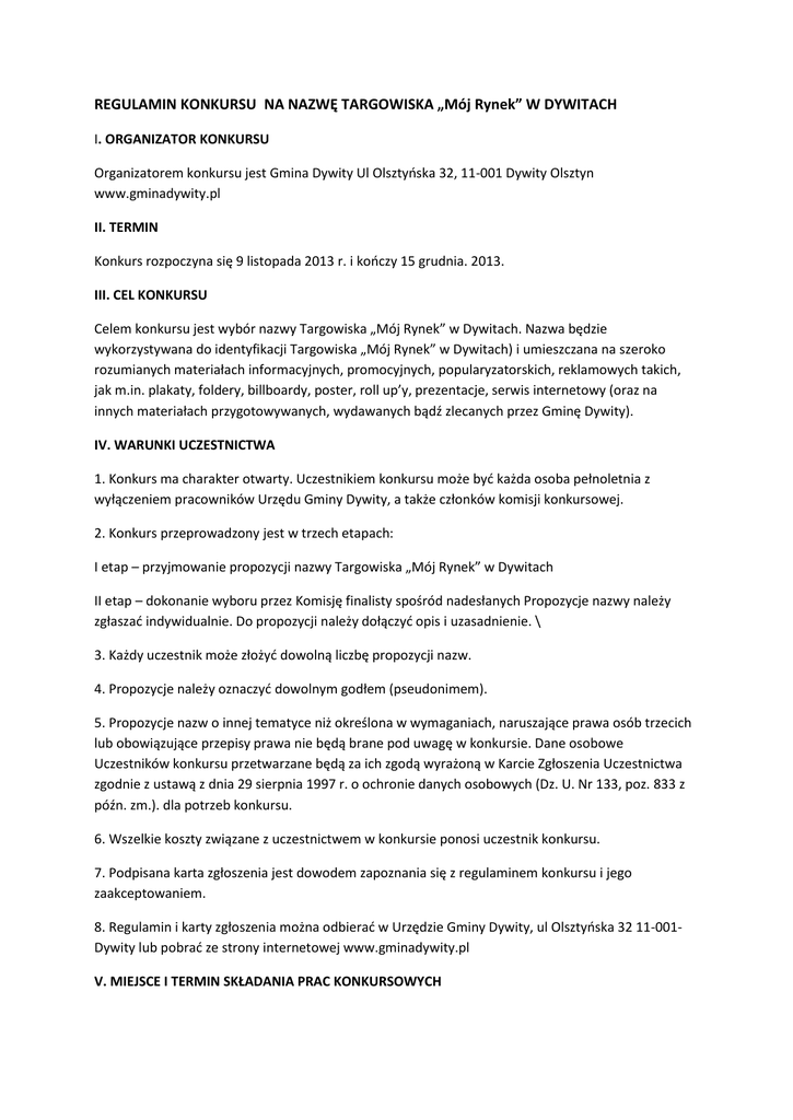 REGULAMIN KONKURSU NA NAZWĘ TARGOWISKA „Mój Rynek” W DYWITACH I. ORGANIZATOR KONKURSU Organizatorem konkursu jest Gmina Dywity Ul Olsztyńska 32, 11-001 Dywity Olsztyn www.gminadywity.pl II. TERMIN Konkurs rozpoczyna się 9 listopada 2013 r. i kończy 15 grudnia. 2013. III. CEL KONKURSU Celem konkursu jest wybór nazwy Targowiska „Mój Rynek” w Dywitach. Nazwa będzie wykorzystywana do identyfikacji Targowiska „Mój Rynek” w Dywitach) i umieszczana na szeroko rozumianych materiałach informacyjnych, promocyjnych, popularyzatorskich, reklamowych takich, jak m.in. plakaty, foldery, billboardy, poster, roll up’y, prezentacje, serwis internetowy (oraz na innych materiałach przygotowywanych, wydawanych bądź zlecanych przez Gminę Dywity). IV. WARUNKI UCZESTNICTWA 1. Konkurs ma charakter otwarty. Uczestnikiem konkursu może być każda osoba pełnoletnia z wyłączeniem pracowników Urzędu Gminy Dywity, a także członków komisji konkursowej. 2. Konkurs przeprowadzony jest w trzech etapach: I etap – przyjmowanie propozycji nazwy Targowiska „Mój Rynek” w Dywitach II etap – dokonanie wyboru przez Komisję finalisty spośród nadesłanych Propozycje nazwy należy zgłaszać indywidualnie. Do propozycji należy dołączyć opis i uzasadnienie. \ 3. Każdy uczestnik może złożyć dowolną liczbę propozycji nazw. 4. Propozycje należy oznaczyć dowolnym godłem (pseudonimem). 5. Propozycje nazw o innej tematyce niż określona w wymaganiach, naruszające prawa osób trzecich lub obowiązujące przepisy prawa nie będą brane pod uwagę w konkursie. Dane osobowe Uczestników konkursu przetwarzane będą za ich zgodą wyrażoną w Karcie Zgłoszenia Uczestnictwa zgodnie z ustawą z dnia 29 sierpnia 1997 r. o ochronie danych osobowych (Dz. U. Nr 133, poz. 833 z późn. zm.). dla potrzeb konkursu. 6. Wszelkie koszty związane z uczestnictwem w konkursie ponosi uczestnik konkursu. 7. Podpisana karta zgłoszenia jest dowodem zapoznania się z regulaminem konkursu i jego zaakceptowaniem. 8. Regulamin i karty zgłoszenia można odbierać w Urzędzie Gminy Dywity, ul Olsztyńska 32 11-001Dywity lub pobrać ze strony internetowej www.gminadywity.pl V. MIEJSCE I TERMIN SKŁADANIA PRAC KONKURSOWYCH 1. Przystąpienie do konkursu polega na przesłaniu propozycji nazwy, na adres: Urzędzie Gminy Dywity, ul Olsztyńska 32 11-001 Dywity z dopiskiem „Konkurs na nazwę Targowiska „Mój Rynek” w Dywitach w terminie do 9 grudnia do godz. 15:00. Decyduje data przyjęcia pracy konkursowej przez adresata. UWAGA: projekty przesłane po tym terminie nie będą rozpatrywane przez Komisję Konkursową. Organizator konkursu nie ponosi odpowiedzialności za ewentualne zaginięcie lub uszkodzenie projektu powstałe w czasie przesyłki. 2. Komisja Konkursowa oceni dostarczone prace i dokona wyboru pracy w terminie do dnia 15 grudnia Wybrana przez komisję praca będzie ostatecznym rozstrzygnięciem konkursu. 3. Wyniki zostaną podane do publicznej wiadomości oraz zamieszczone na stronach internetowych, m.in.: www.gminadywity.pl w dniu 16 grudnia 2013 r. 4. Wyniki konkursu są ostateczne i nie podlegają odwołaniu. Wraz z propozycją nazwy, Uczestnik zobowiązany jest przekazać oświadczenie – Karta Zgłoszenia Uczestnictwa – z własnoręcznym podpisem VI. OCENA PRAC KONKURSOWYCH 1. Nad przebiegiem konkursu czuwać będzie Komisja Konkursowa w składzie: - Daniel Zadworny – Sekretarz Gminy Dywity - Przewodniczący Komisji Konkursowej; - ks. kan. dr Kazimierz Dawcewicz – Proboszcz Parafii Świętych Apostołów Szymona i Judy Tadeusza w Dywitach – Członek Komisji Konkursowej - Małgorzata Dziemidowicz – Kierownik referatu Edukacji, Kultury, Sportu i Zdrowia - Członek Komisji Konkursowej - Sabina Robak – Radna, Przewodnicząca Komisji Edukacji Rady Gminy Dywity - Członek Komisji Konkursowej - Janusz Jędrzejewski – Radny, Przewodniczący Komisji Gospodarki - Członek Komisji Konkursowej - Krzysztof Zienkiewicz - Pełnomocnik Wójta ds. Informacji i Komunikacji Społecznej – Członek Komisji Konkursowej - Jacek Panas – dziennikarz – Członek Komisji Konkursowej - Antoni Nikiel – rolnik - Członek Komisji Konkursowej - Aneta Fabisiak – Hill – Dyrektor GOK w Dywitach - Członek Komisji Konkursowej 2. Organizator zastrzega sobie możliwość rozszerzenia składu Komisji Konkursowej. 3. Otwarcia kopert z nazwiskami autorów projektów dokona Komisja Konkursowa po rozstrzygnięciu konkursu i przyznaniu nagrody. 4. Kryteria oceny prac konkursowych przez Komisję Konkursową: - zgodność z regułami konkursu, czytelność przekazu, - oryginalność. 5. Zwycięzca konkursu zostanie powiadomiony o wygranej oraz o terminie i miejscu wręczenia nagrody telefonicznie lub za pomocą poczty elektronicznej. 6. Organizator zastrzega sobie prawo do zakończenia konkursu bez wybrania najlepszej pracy bez podania przyczyny, a co za tym idzie bez przyznania nagrody głównej. VII. PRZETWARZANIE DANYCH OSOBOWYCH 1. Administratorem danych osobowych udostępnionych przez uczestników konkursu jest Organizator. Dane osobowe uczestników konkursu będą przetwarzane wyłącznie w celu prawidłowego przeprowadzenia konkursu. 2. Przekazanie przez Uczestników danych osobowych Organizatorowi ma charakter dobrowolny. Uczestnikom przysługuje prawo wglądu do swoich danych oraz możliwość ich poprawiania. VIII. NAGRODA 1. Wszystkie nadesłane prace konkursowe spełniające kryteria, wraz z nazwami autorów zostaną upublicznione na stronie www.gminadywity.pl, W przypadku dużej liczby prac (ponad 20) Komisja ograniczy się do publikacji najlepszych prac. 2. Nagrodą główną w konkursie jest nagroda w postaci przelotu nad Gminą Dywity zorganizowanym przez Aeroklub Warmińsko Mazurski. 3. Przed wydaniem Nagrody Organizator pobierze 10% zryczałtowany podatek dochodowy, o którym mowa w art.30 ust. 1 pkt. 2 ustawy z dnia 26 lipca 1991 r. o podatku dochodowym od osób fizycznych (tekst jedn