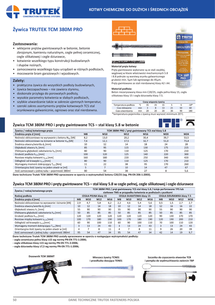KOTWY CHEMICZNE DO DUŻYCH I ŚREDNICH OBCIĄŻEŃ Żywica TRUTEK TCM 380M PRO Zastosowania: • wklejanie prętów gwintowanych w betonie, betonie zbrojonym, kamieniu naturalnym, cegle pełnej ceramicznej, cegle silikatowej i cegle dziurawce, • kotwienie wszelkiego typu konstrukcji budowlanych i słupów nośnych, • zamocowania wszelkiego typu urządzeń w różnych podłożach, • mocowanie bram garażowych i wjazdowych. Zalety: • • • • • • praktyczna żywica do wszystkich podłoży budowlanych, żywica bezzapachowa – nie zawiera styrenu, doskonale przylega do porowatych podłoży, wysokie parametry kotwienia w słabych podłożach, szybkie utwardzanie także w zakresie ujemnych temperatur, szeroki zakres asortymentu prętów kotwowych TCS stal ocynkowana galwanicznie, ogniowo oraz stal nierdzewna. Materiał pręta kotwy: Pręty gwintowane wykonane są ze stali zwykłej, węglowej w klasie właściwości mechanicznych 5.8 i 8.8 pokryte są warstwą ocynku galwanicznego grubości min. 5µm lub ogniowego do 45µm. Pręty gwintowane ze stali nierdzewnej klasy A2 i A4. Materiał podłoża: Beton niezarysowany klasa min C20/25, cegła pełna klasy 15, cegła silikatowa klasy 15 i cegła dziurawka klasy 7.5. *temperatura pojemnika z żywicą musi wynosić minimum 20˚C. Żywica TCM 380M PRO i pręty gwintowane TCS – stal klasy 5.8 w betonie Dane techniczne Trutek TCM 380M PRO opracowane w oparciu o wytrzymałość betonu C20/25 (wg. PN-EN 206-1:2003). Żywica TCM 380M PRO i pręty gwintowane TCS – stal klasy 5.8 w cegle pełnej, cegle silikatowej i cegle dziurawce Dane techniczne Trutek TCM 380M PRO zostały opracowane w oparciu o następujące wytrzymałości podłoży: - cegła ceramiczna pełna klasy ≥15 wg normy PN-EN 771-1:2006; - cegła silikatowa klasy ≥15 wg normy PN-EN 771-2:2006; - cegła dziurawka klasy ≥7,5 wg normy PN-EN 771-1:2006; Dozownik TCM 380MT 50 Mieszacz żywicy TCN01 i przedłużka dozująca TEN01 DANE TECHNICZNE TRUTEK FASTENERS POLSKA Szczotka do czyszczenia otworów TCB i pompka do wydmuchiwania zwiercin TBP KOTWY CHEMICZNE DO DUŻYCH I ŚREDNICH OBCIĄŻEŃ Pręty i akcesoria kotew chemicznych *pręty kotew dostępne wyłącznie na zamówienie Tuleje z gwintem wewnętrznym TIS Tel. 022 701 93 25-26 www.trutek.com.pl 51