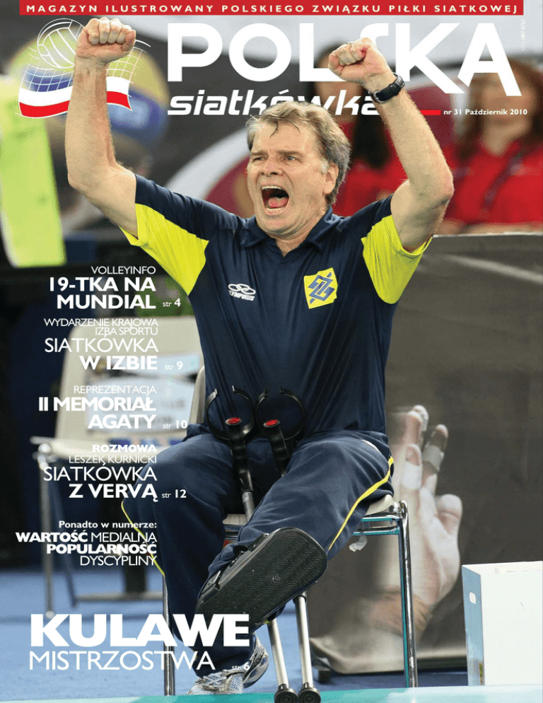ISSN 1897-8762 nr 31 Październik 2010 VOLLEYINFO 19-TKA NA MUNDIAL str 4 WYDARZENIE KRAJOWA IZBA SPORTU SIATKÓWKA W IZBIE str 9 REPREZENTACJA II MEMORIAŁ AGATY str 10 ROZMOWA LESZEK KURNICKI SIATKÓWKA Z VERVĄ str 12 Ponadto w numerze: WARTOŚĆ MEDIALNA POPULARNOŚĆ DYSCYPLINY KULAWE MISTRZOSTWA str 6 31 MAGAZYN ILUSTROWANY POLSKIEGO ZWIĄZKU PIŁKI SIATKOWEJ nr 31 październik 2010 SPIS TREŚCI REPREZENTACJE ME JUNIORÓW I JUNIOREK FOTO: PZPS 9 JUNIORZY BEZ MEDALI, Szanowni Państwo! Piszę te słowa tuż po powrocie z włoskich mistrzostw świata, które dla mnie, a także dla licznych kibiców naszej drużyny narodowej były ogromnym rozczarowaniem. W sporcie nie zawsze jednak skala nakładów pracy i środków jest równa odniesionym wynikom. To z jednej strony piękno, a z drugiej okrucieństwo sportu. Przed kierownictwem Związku stoi teraz odpowiedzialne zadanie podjęcia racjonalnych działań, które pozwolą nawiązać do nieodległych osiągnięć. W pierwszej fazie mistrzostw pełniłem z ramienia Międzynarodowej Federacji Piłki Siatkowej rolę dyrektora mundialu w Weronie. To była ciężka praca, ale też niezwykle cenne doświadczenie. Z pewnością okaże się ono bardzo przydatne w pracach przygotowawczych i organizacji następnych mistrzostw, których gospodarzem będzie nasz kraj. Nabrałem pełnego przekonania, że kolejny światowy championat musi być rozgrywany według jasnego, niepozostawiającego żadnych wątpliwości regulaminu sportowego. Szczęście niech sprzyja wyłącznie lepszym na boisku. FIVB i PZPS mają więc wielkie zadanie do spełnienia. Kolejne mistrzostwa świata muszą mieć charakter przełomowy i być wydarzeniem globalnym. Siatkarski mundial 2014 powinien być wielkim międzynarodowym wydarzeniem sportowym, a nie tylko siatkarskim. Liczę na to, że do Polski przyjadą kibice nie tylko z krajów uczestników mistrzostw, ale i z państw niebiorących udziału w turnieju finałowym. To będzie także znakomita platforma promocji naszej ojczyzny. Międzynarodowej popularyzacji siatkówki z wykorzystaniem znakomitego polskiego dorobku służyć będą między innymi: przyszłoroczny finał Ligi Światowej, mistrzostwa Europy juniorów 2012 oraz mistrzostwa Europy mężczyzn w roku 2013 organizowane wspólnie przez Danię i Polskę. Jednak kluczowe znaczenie dla globalnej ofensywy siatkarskiej będzie miał międzynarodowy, telewizyjny kanał siatkarski, którego inicjatorami są Telewizja Polsat i Polska Siatkówka. Prace przy jego tworzeniu są już bardzo zaawansowane. Przed naszym środowiskiem stoi ogromne wyzwanie – wylansować widowisko siatkarskie w skali globalnej. Polskie doświadczenia i inicjatywy w tym zakresie mają bezcenny charakter, a Mistrzostwa Świata – Polska 2014 – podobnie jak w przeszłości finał Ligi Światowej 2007 i Mistrzostw Europy Kobiet 2009 – będą historycznymi wydarzeniami w dziejach tych rozgrywek. Tegorocznych mistrzostw Europy juniorek i juniorów nikt nie zaliczy do udanych. Oba nasze zespoły nie zakwalifikowały się nawet do ósemki, zajmując 10. miejsca. Słaby występ w ME nie znaczy jednak, że polską siatkówkę czeka kryzys. REPEZENTACJA 15 FANI SIATKÓWKI ZBADANI Kim są i co cenią najbardziej podczas widowisk Ligi Światowej fani siatkówki? Na te i podobne pytania odpowiadali kibice podczas meczów Ligi Światowej rozegranych w Łodzi w lipcu tego roku. SYLWETKA MIESIĄCA 19 DYPLOMATA POD SIATKĄ Hubert Tomaszewski w polskim sporcie, w polskiej siatkówce nie jest postacią tuzinkową. Dobrze rokujący tenisista, arabista, europeista, poliglota, syn dyplomaty i sam były dyplomata, przed czterema laty trafił do Polskiego Związku Piłki Siatkowej, by objąć menedżerską pieczę nad żeńską reprezentacją Polski. DOOKOŁA SIATKI 22 PRZEGRAĆ, ŻEBY WYGRAĆ To miały być piękne mistrzostwa świata. I nie tylko dlatego, że Włochy są miejscem magicznym, w którym wino smakuje szczególnie. To przecież kraj mający wciąż najsilniejszą ligę na świecie, to tam grają najlepsi siatkarze, tam jest publiczność, która potrafi docenić prawdziwe mistrzostwo. WYDAWCA: POLSKI ZWIĄZEK PIŁKI SIATKOWEJ ul. Grażyny 13, 02-548 Warszawa Tel. 22 440 83 44 Fax. 22 440 83 43 REDAKTOR NACZELNY – JANUSZ UZNAŃSKI REDAGUJE KOLEGIUM PROJEKT GRAFICZNY: MAREK WAJDA Na zlecenie Polskiego Związku Piłki Siatkowej redaguje Grupa Codex 02-134 Warszawa, ul. 1 Sierpnia 25 e-mail: [email protected] Redakcja nie zwraca materiałów niezamówionych oraz zastrzega sobie prawo skracania i redagowania nadsyłanych tekstów. Wszelkie prawa zastrzeżone. ISSN 1897-8762 FOTO: FIVB.ORG MIROSŁAW PRZEDPEŁSKI Prezes PZPS Wydarzenia VolleyInfo Wydarzenia DZIEWIĘTNASTKA NA MUNDIAL GRAND PRIX POTWIERDZONA SZESNASTKA POWRÓT GLINKI nr 31 październik 2010 4 Małgorzata Glinka-Mogentale wraca do reprezentacji w swoim stylu. Nasza kadrowiczka została najbardziej wartościową zawodniczką II Memoriału Agaty Mróz-Olszewskiej, wygranego przez biało-czerwone. Z polskiej drużyny wyróżniona została także Agnieszka Bednarek-Kasza, która otrzymała nagrodę dla najlepiej zagrywającej. Pozostałe nagrodzone siatkarki: Aneta Havlickowa (Czechy, najlepiej punktująca), Senna Usić (Chorwacja, najlepsza atakująca), Maja Poljak (Chorwacja, najlepsza blokująca), Jovana Vesović (Serbia, najlepsza przyjmująca), Anja Antonijević (Serbia, najlepsza rozgrywająca), Julia Jaszowa (Czechy, najlepsza libero). CIEKAWOSTKI KOBIETY NA SŁUPKACH W tegorocznych mistrzostwach świata we Włoszech wzięło udział 302 zawodników, najniższy z nich (Chińczyk Qi Ren) miał zaledwie 174 centymetry wzrostu, najwyższy (Rosjanin Dmitrij Muserskij) – 217 centymetrów. Mecze rozgrywane były w 10 miastach, a spotkania po raz pierwszy w historii mistrzostw świata mężczyzn sędziowały między innymi dwie kobiety: Serbka Zorica Bjelic oraz Amerykanka Patricia Salvatore. FIVB oficjalnie zatwierdziła, że w przyszłor