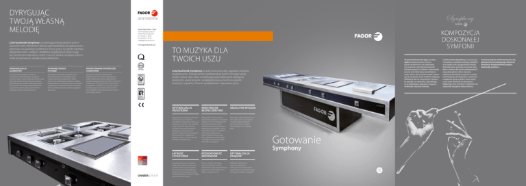 DYRYGUJĄC TWOJĄ WŁASNĄ MELODIĘ FAGOR INDUSTRIAL S. COOP. KOMPOZYCJA DOSKONAŁEJ SYMFONII Santxolopetegi auzoa, 22 20560 Oñati (Hiszpania) T. (+34) 943 71 80 30 F. (+34) 943 71 81 81 [email protected] Linie kuchenek Symphony umożliwiają profesjonalistom kuchni używanie wielu elementów różnych gam produktów do gotowania w zależności od upodobań, preferencji i formy pracy. To szeroki wachlarz elementów, form, wielkości, dodatków projektowych, które mogą być elementami zabudowy mebli i tworzyć idealne narzędzie, którym może się zachwycać szeroka rzesza odbiorców. www.fagorindustrial.com TO MUZYKA DLA TWOICH USZU PERSONALIZACJA ELEMENTÓW NA MIARĘ TWOICH POTRZEB PROJEKTOWANIE WYKOŃCZEŃ I DODATKÓW Linia kuchenek Symphony umożliwia odnalezienie odpowiedniego rozwiązania, funkcjonalnego i estetycznego dla potrzeb pracy, dzięki elementom funkcjonalnym gotowania, jak palniki gazowe, patelnie elektryczne, garnki kontrolowane termostatem, grille elektryczne z systemem wodnym, płyty i powierzchnie indukcyjne, bemary lub płyty żarowe. Seria zaplanowana, żeby zaspokoić Twoje potrzeby przestrzeni, którą dysponujesz i zoptymalizować ją maksymalnie. Dzięki elastyczności odnośnie do wielkości i kształtu, profesjonalista ma możliwość wyboru pomiędzy urządzeniami i maszynami różnych rozmiarów, które umożliwią mu pracę możliwie wygodną i skuteczną. Symphony umożliwia użytkownikowi projektowanie kuchni, która najbardziej mu będzie odpowiadać, tak by mógł wybierać spośród najdogodniejszych kształtów (ściennych, środkowych, z formą, z prostymi wspornikami, kompaktowe, z szafkami...), o różnych cechach konstrukcyjnych, z różnymi wykończeniami oraz dodatkami, które będą wisienką na torcie doskonałego sprzętu. W przeciwieństwie do tego, co wielu sądzi, komponowanie to nie jest praca mechaniczna i nie odpowiada ona sztywnej i specyficznej postawie. Komponowanie to subtelny i niepowstały jeszcze ruch, który łączy nieuchronnie pasję i talent, który otwiera umysł i używa go, by wyobrazić sobie możliwie najlepszą lokalizację dla nut muzycznych i sprawić, by płynęły one naturalnie, zapominając, że są oddzielnymi częściami, a stają się doskonałą i złączoną melodią. Linia kuchenek Symphony została stworzona, żeby zaspokoić potrzeby projektowania i funkcjonalności profesjonalnej kuchni. Do tego należy dodać wielość zalet, które umożliwiają zoptymalizowanie dostępnej przestrzeni, wykorzystanie i zarządzanie pracą w kuchni w sposób skuteczny i zgodnie z Twoimi upodobaniami i sposobem pracy. OPTYMALIZACJA PRZESTRZENI MAKSYMALNE BEZPIECZEŃSTWO ABSOLUTNA WYGODA Optymalizacja dostępnej przestrzeni i możliwość, by to sam klient zaprojektował swój obszar roboczy na miarę jego upodobań i aby dowolnie mógł umieszczać jego elementy. Umożliwia stworzenie projektów, niedających się stworzyć przy pomocy maszyn konwencjonalnych, bez konieczności naśladowania jakiegoś systemu modularnego lub rozmiarów standardowych. Maksymalne bezpieczeństwo i jakość dzięki spełnieniu norm jakości i higieny, użycie homologowanych elementów, budowa ze stali nierdzewnej, panele zewnętrzne z temperaturą poniżej 80ºC, użycie wskaźników i diod we wszystkich elementach elektrycznych, system “bezpieczeństwa stołu”, który zapobiega wyciekom gazu i zaokrąglone narożniki na całym obwodzie i krawędziach. Absolutna wygoda dzięki temu, że sam użytkownik kuchni wybiera i określa najlepsze położenie elementów bloku, oferując i optymalizując czas i przebieg pracy. Gotowanie Symphony ŁATWOŚĆ CZYSZCZENIA RÓŻNORODNOŚĆ MATERIAŁÓW OPTYMALIZACJA OSIĄGÓW Duża łatwość mycia i czyszczenia dzięki jednoczęściowemu blatowi, na którym mieszczą się wszystkie elementy. Elementy kompaktowe Symphony nie pozwalają na żaden rodzaj wyżłobienia, w których mógłby przeciec brud lub tłuszcz. Szeroki wachlarz materiałów, za pomocą których możemy skomponować część wyprodukowaną całkowicie ze stali nierdzewnej i z blatem o grubości 3 mm. Możliwość zabudowania elementów gazowych, elektrycznych lub indukcyjnych. optymalizując w ten sposób osiągi wymagane w każdym przypadku. Linia kuchenek Symphony umożliwia grę mieszankami, układanie każdego składnika w porządku, który podpowiada instynkt, doświadczenie, potrzeby oraz know-how. Różne rozmiary dla kuchni profesjonalnych najwyższej jakości, które stanowią najlepszą odpowiedź na pytanie o aspekt technologiczny, funkcjonalny i estetyczny urządzenia, łącząc w jedną i harmonijną część różne elementy do gotowania i dysponując nimi na miarę i w zależności od upodobań dyrygenta takiej orkiestry. Ponieważ jedynie wielki Szef kuchni wie, jakiej kuchni potrzebują jego dłonie do tworzenia i komponowania przepisu doskonałej symfonii… WYŚMIENITA INTERPRETACJA: PERSONALIZACJA ELEMENTÓW PROJEKTOWANIE WYKOŃCZEŃ I DODATKÓW WACHLARZ ROZWIĄZAŃ NA MIARĘ Każda kuchnia jest inna i każdy szef kuchni interpretuje swoje potrzeby w sposób inny, umieszczając sprzęt w taki sposób, by odpowiadał mu funkcjonalnie, jak i estetycznie. Ponieważ każdy profesjonalista ma swój odrębny świat i każda z jego kuchni powinna odpowiadać najbardziej szczególnym wymaganiom, zarówno tym, które wymagają specyficznego designu, jak i wytwornego planowania. I dlatego, departament projektowania i planowania doradza swoim klientom w wyborze najodpowiedniejszej estetyki, budowy i rozmieszczenia, oprócz możliwości zabudowy innych elementów lub ich zastępowania. Biorąc jako podstawę elementy funkcjonalne gotowania, istnieje możliwość dołączenia elementów palników gazowych, zapalarek piezoelektrycznych, patelni elektrycznych, garnków do makaronu, grillów i płyt o powierzchni indukcyjnej, a także bemarów z automatycznym wypełnianiem wodą. To wielki wachlarz wykończeń dla blatów, stru