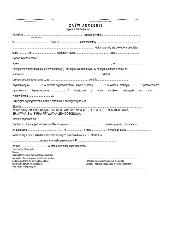 ............................................ .......................................... (pieczęć zakładu pracy) (miejscowość, data, miesiąc wpisać słownie) ZAŚWIADCZENIE (wypełnia zakład pracy) Pani/Pan .................................................................................... urodzona/y dnia...................................................... (imię i nazwisko) w ................................................ PESEL: ............................ zamieszkała/y ............................................................. ................................................................................................................... legitymująca/y się dowodem osobistym seria .............. nr .................................. wydanym przez................................................ dnia ................................... Nazwa zakładu pracy ................................................................................................................................................. adres ................................................................................................................................., tel. .................................. Niniejszym zaświadcza się, że wymieniony(a) Pan(i) jest zatrudniony(a) w naszym zakładzie pracy na stanowisku .......................................................................................................... od dnia ............................................ Umowa została zawarta na czas ...................................................... do dnia ........................................... Wymieniony(a) ................* w okresie wypowiedzenia umowy o pracę ................* w okresie próbnym ...............* pracownikiem sezonowym. Wynagrodzenie ....................* obciążone z tytułu wyroków sądowych lub innych tytułów kwotą .............................. zł. Przeciętne wynagrodzenie netto z ostatnich 3 miesięcy wynosi zł ............................................. Słownie ........................................................................................................................................................................ Zakład pracy jest: PRZEDSIĘBIORSTWEM PAŃSTWOWYM, S.C., SP.Z O.O., SP. KOMANDYTOWĄ, SP. JAWNĄ, S.A., FIRMĄ PRYWATNĄ JEDNOOSOBOWĄ. Wpisać odpowiednik ............................................................................. Dochód rozliczany jest w Urzędzie Skarbowym w ....................................................Zakład prowadzi działalność na podstawie ................................................. nr ....................... z dnia ...................... wydanego przez ................................., rozlicza się z tytułu składek ubezpieczeniowych pracowników w ZUS Oddział w ......................................wg numeru rozliczeniowego NIP: ..................................................... Zakład ....................................* w stanie likwidacji bądź upadłości. * wpisać jest/ nie jest. Uwaga! Zaświadczenie musi być wypełnione czytelnie, wszystkie informacje przed udzieleniem kredytu będą sprawdzane. W przypadku podania fałszywych danych wnioskodawca traci koszty manipulacyjne ................................................................................ (Pieczęć z nazwiskiem i podpis Kierownika Zakładu Pracy lub osoby przez niego upoważnionej)