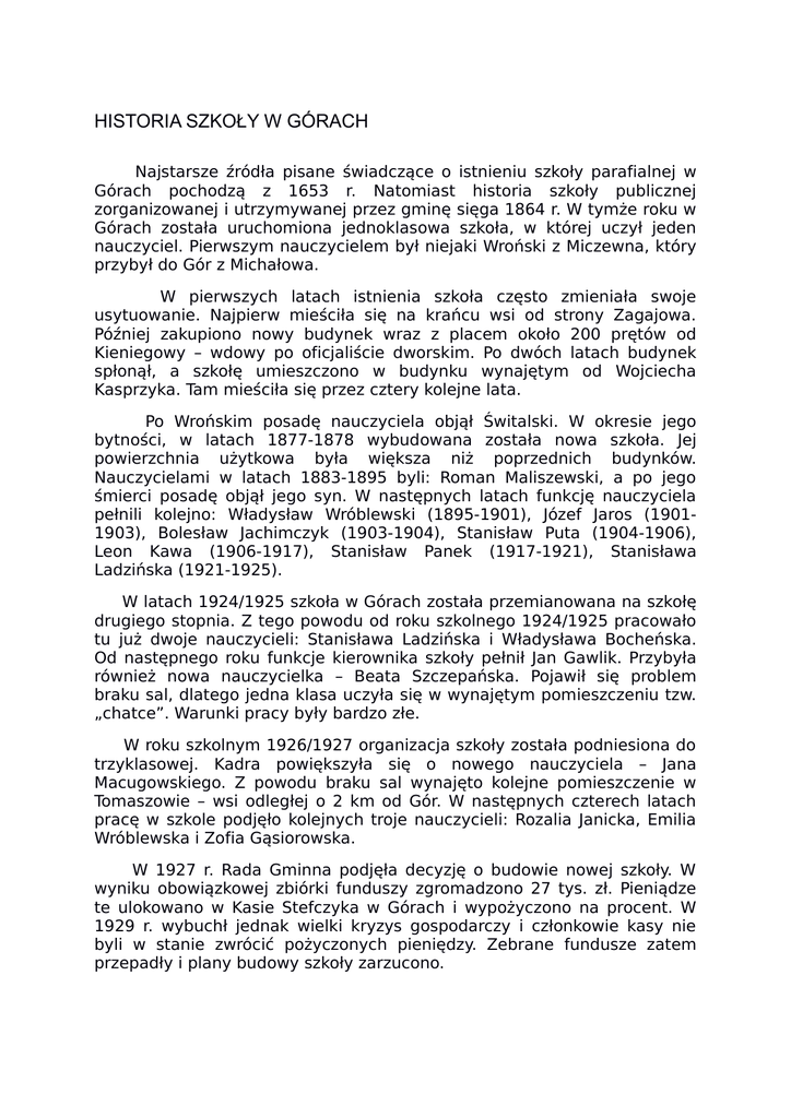 HISTORIA SZKOŁY W GÓRACH Najstarsze źródła pisane świadczące o istnieniu szkoły parafialnej w Górach pochodzą z 1653 r. Natomiast historia szkoły publicznej zorganizowanej i utrzymywanej przez gminę sięga 1864 r. W tymże roku w Górach została uruchomiona jednoklasowa szkoła, w której uczył jeden nauczyciel. Pierwszym nauczycielem był niejaki Wroński z Miczewna, który przybył do Gór z Michałowa. W pierwszych latach istnienia szkoła często zmieniała swoje usytuowanie. Najpierw mieściła się na krańcu wsi od strony Zagajowa. Później zakupiono nowy budynek wraz z placem około 200 prętów od Kieniegowy – wdowy po oficjaliście dworskim. Po dwóch latach budynek spłonął, a szkołę umieszczono w budynku wynajętym od Wojciecha Kasprzyka. Tam mieściła się przez cztery kolejne lata. Po Wrońskim posadę nauczyciela objął Świtalski. W okresie jego bytności, w latach 1877-1878 wybudowana została nowa szkoła. Jej powierzchnia użytkowa była większa niż poprzednich budynków. Nauczycielami w latach 1883-1895 byli: Roman Maliszewski, a po jego śmierci posadę objął jego syn. W następnych latach funkcję nauczyciela pełnili kolejno: Władysław Wróblewski (1895-1901), Józef Jaros (19011903), Bolesław Jachimczyk (1903-1904), Stanisław Puta (1904-1906), Leon Kawa (1906-1917), Stanisław Panek (1917-1921), Stanisława Ladzińska (1921-1925). W latach 1924/1925 szkoła w Górach została przemianowana na szkołę drugiego stopnia. Z tego powodu od roku szkolnego 1924/1925 pracowało tu już dwoje nauczycieli: Stanisława Ladzińska i Władysława Bocheńska. Od następnego roku funkcje kierownika szkoły pełnił Jan Gawlik. Przybyła również nowa nauczycielka – Beata Szczepańska. Pojawił się problem braku sal, dlatego jedna klasa uczyła się w wynajętym pomieszczeniu tzw. „chatce”. Warunki pracy były bardzo złe. W roku szkolnym 1926/1927 organizacja szkoły została podniesiona do trzyklasowej. Kadra powiększyła się o nowego nauczyciela – Jana Macugowskiego. Z powodu braku sal wynajęto kolejne pomieszczenie w Tomaszowie – wsi odległej o 2 km od Gór. W następnych czterech latach pracę w szkole podjęło kolejnych troje nauczycieli: Rozalia Janicka, Emilia Wróblewska i Zofia Gąsiorowska. W 1927 r. Rada Gminna podjęła decyzję o budowie nowej szkoły. W wyniku obowiązkowej zbiórki funduszy zgromadzono 27 tys. zł. Pieniądze te ulokowano w Kasie Stefczyka w Górach i wypożyczono na procent. W 1929 r. wybuchł jednak wielki kryzys gospodarczy i członkowie kasy nie byli w stanie zwrócić pożyczonych pieniędzy. Zebrane fundusze zatem przepadły i plany budowy szkoły zarzucono. W 1931 r. Urząd Gminy w Górach nabył budynek zwany „ochronką” od Dembińskich z przeznaczeniem na szkołę. W ciągu kolejnych czterech lat budynek dwukrotnie przebudowywano w rezultacie czego powstały dwie nowe sale lekcyjne i jedno mieszkanie nauczycielskie. W dniu 23 lutego 1935 r. ks. Władysław Pruciak w obecności starosty, mieszkańców wsi, dzieci szkolnych i zaproszonych gości dokonał poświęcenia budynku. W tym samym roku na stanowisko dyrektora szkoły został mianowany Władysław Dębski. W roku następnym zatrudniono kolejnego nauczyciela – Zygmunta Pawełczyka. Pedagog ten pełnił później funkcję dyrektora szkoły w Działoszycach oraz piastował stanowisko kuratora Okręgu Szkolnego Kieleckiego. W dniu wybuchu wojny, 1 września 1939 r., do pracy zgłosili się: Władysław Dębski – kierownik szkoły oraz Anna Krzemińska i Zygmunt Pawełczyk. Uruchomiono sześć klas. Obowiązywały te same przedmioty co przed wojną, ale z wyłączeniem historii i geografii. Języka polskiego uczono z wydawanych przez okupanta tzw. „Stern”. Frekwencja była bardzo słaba – ok. 60-80%. Z dniem 1 stycznia 1940 r. zwolniono wszystkich nauczycieli. Nowym kierownikiem został Józef Gałka. Jako nauczyciele pracowali: Tadeusz Sierakowski i przywrócony do pracy Zygmunt Pawełczyk. W czerwcu 1942 r. Józef Gałka został aresztowany i wywieziony do Buska skąd wraz z innymi nauczycielami trafił do Oświęcimia, gdzie został zamordowany. Rok szkolny 1942/43 rozpoczęły Anna Krzemińska i Jadwiga Karwatowa. W styczniu 1943 r. funkcję kierownika szkoły objął Stanisław Sobczyk. Wkrótce jednak zawiesił naukę celem przeprowadzenia remontu sal. Po dokonaniu remontu wznowiono zajęcia, wzrosła frekwencja, młodzież wdrożyła się do nauki. W roku szkolnym 1944/45 Niemcy często zajmowali sale lekcyjne na potrzeby wojska, dlatego nauka odbywała się z przerwami. Po wyzwoleniu w styczniu 1945 r. dotychczasowy kierownika Stanisław Sobczyk został awansowany na stanowisko inspektora szkolnego w Pińczowie. Funkcję kierownika powierzył Zygmuntowi Pawełczykowi. Od 1 września 1945 r. szkoła została podniesiona do III stopnia. Wprowadzona została klasa siódma. W ten sposób placówka stała się pełną szkołą podstawową. W pierwszym powojennym roku szkolnym kadrę pedagogiczna tworzyli: Zygmunt Pawełczyk – kierownik oraz Zofia Gałka, Helena Klamka, Anna Krzemińska i Wiktoria Wierzbowska. W roku szkolnym 1946/47 Zygmunt Pawełczyk objął stanowisko dyrektora szkoły w Działoszycach. Nowym kierownikiem szkoły w Górach została Zofia Gałka. W 1947 r., ze względu na masowy napływ młodzieży i trudności lokalowe, szkoła podstawowa została ulokowana w budynku Ośrodka Dworskiego tzw. pałacu. Zajmowała tam trzy sale lekcyjne, dwa korytarze, bibliotekę, oranżerię oraz kancelarię. Obok umieszczono przedszkole. W budynku znajdowała się także siedziba Gminnej Spółdzielni i Posterunek MO. Pomieszczenia były wysokie i zimne, trudne do ogrzania. W 1950 r. nastąpiła zmiana na stanowisku dyrektora i całego grona pedagogicznego. Kierownikiem został mgr Henryk Kawiorski a jako nauczyciele zostali zatrudnieni: Helena Janik, Henryka Woźniczko, Dioniza Wyrozumska i Helena Kowalska. Podjęto in