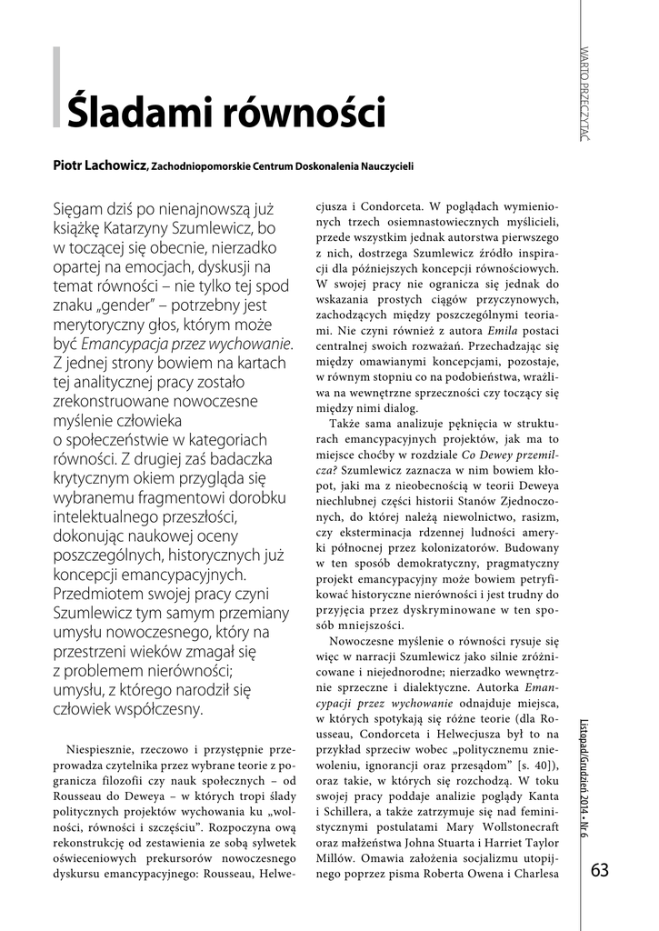 WARTO PRZECZYTAĆ Śladami równości Piotr Lachowicz, Zachodniopomorskie Centrum Doskonalenia Nauczycieli Sięgam dziś po nienajnowszą już książkę Katarzyny Szumlewicz, bo w toczącej się obecnie, nierzadko opartej na emocjach, dyskusji na temat równości – nie tylko tej spod znaku „gender” – potrzebny jest merytoryczny głos, którym może być Emancypacja przez wychowanie. Z jednej strony bowiem na kartach tej analitycznej pracy zostało zrekonstruowane nowoczesne myślenie człowieka o społeczeństwie w kategoriach równości. Z drugiej zaś badaczka krytycznym okiem przygląda się wybranemu fragmentowi dorobku intelektualnego przeszłości, dokonując naukowej oceny poszczególnych, historycznych już koncepcji emancypacyjnych. Przedmiotem swojej pracy czyni Szumlewicz tym samym przemiany umysłu nowoczesnego, który na przestrzeni wieków zmagał się z problemem nierówności; umysłu, z którego narodził się człowiek współczesny. Listopad/Grudzień 2014 • Nr 6 Niespiesznie, rzeczowo i przystępnie przeprowadza czytelnika przez wybrane teorie z pogranicza filozofii czy nauk społecznych – od Rousseau do Deweya – w których tropi ślady politycznych projektów wychowania ku „wolności, równości i szczęściu”. Rozpoczyna ową rekonstrukcję od zestawienia ze sobą sylwetek oświeceniowych prekursorów nowoczesnego dyskursu emancypacyjnego: Rousseau, Helwe- cjusza i Condorceta. W poglądach wymienionych trzech osiemnastowiecznych myślicieli, przede wszystkim jednak autorstwa pierwszego z nich, dostrzega Szumlewicz źródło inspiracji dla późniejszych koncepcji równościowych. W swojej pracy nie ogranicza się jednak do wskazania prostych ciągów przyczynowych, zachodzących między poszczególnymi teoriami. Nie czyni również z autora Emila postaci centralnej swoich rozważań. Przechadzając się między omawianymi koncepcjami, pozostaje, w równym stopniu co na podobieństwa, wrażliwa na wewnętrzne sprzeczności czy toczący się między nimi dialog. Także sama analizuje pęknięcia w strukturach emancypacyjnych projektów, jak ma to miejsce choćby w rozdziale Co Dewey przemilcza? Szumlewicz zaznacza w nim bowiem kłopot, jaki ma z nieobecnością w teorii Deweya niechlubnej części historii Stanów Zjednoczonych, do której należą niewolnictwo, rasizm, czy eksterminacja rdzennej ludności ameryki północnej przez kolonizatorów. Budowany w ten sposób demokratyczny, pragmatyczny projekt emancypacyjny może bowiem petryfikować historyczne nierówności i jest trudny do przyjęcia przez dyskryminowane w ten sposób mniejszości. Nowoczesne myślenie o równości rysuje się więc w narracji Szumlewicz jako silnie zróżnicowane i niejednorodne; nierzadko wewnętrznie sprzeczne i dialektyczne. Autorka Emancypacji przez wychowanie odnajduje miejsca, w których spotykają się różne teorie (dla Rousseau, Condorceta i Helwecjusza był to na przykład sprzeciw wobec „politycznemu zniewoleniu, ignorancji oraz przesądom” [s. 40]), oraz takie, w których się rozchodzą. W toku swojej pracy poddaje analizie poglądy Kanta i Schillera, a także zatrzymuje się nad feministycznymi postulatami Mary Wollstonecraft oraz małżeństwa Johna Stuarta i Harriet Taylor Millów. Omawia założenia socjalizmu utopijnego poprzez pisma Roberta Owena i Charlesa 63 WARTO PRZECZYTAĆ Listopad/Grudzień 2014 • Nr 6 64 Fouriera, zaś z idei Marksa, Engelsa oraz Gramsciego odtwarza marksistowską wizję równości. Ostatnią część przeglądu emancypacyjnych wątków badaczka poświęca pragmatyzmowi i demokratycznej pedagogice wspomnianego już Johna Deweya. Pomocniczą funkcję pełnią w narracji autorki omawianej pracy przykłady zaczerpnięte z kanonu literatury światowej. Jane Austen i jej Mansfield Park, poezja Williama Blake’a, Walta Whitmana, Geothego, w końcu powieści Dickensa, Twaina czy Toni Morrison pełnią funkcję ilustracji bądź też obszernej prolegomeny do wybranych problemów emancypacyjnych (na marginesie pozostają również – mniej liczne – odniesienia do innych dziedzin sztuki: malarstwa i muzyki). Szumlewicz, wprowadzając do swojej książki interpretacje tych pozafilozoficznych tekstów, uniwersalizuje omawiane wątki emancypacyjne, osadzające je w ogólnym planie epok. Wskazuje na ich powszechność oraz obecność w refleksji nad społeczeństwem. Dzieła te stanowią dla niej nie mniej ważny kontekst niż filozoficzne rozważanie nad wychowaniem. Zdaje się zachęcać tym samym do podjęcia próby, którą roboczo można nazwać pedagogiczną lekturą dzieł literackich, i spojrzenia na poruszane w nich tematy przez pryzmat szkoły i edukacji. Praca Szumlewicz tylko na pozór ma jednak charakter historyczny. Już we wstępie autorka zaznacza bowiem, że emancypacja jest dla niej dynamicznym i niekończącym się procesem, którego ważnym, jeśli nie kluczowym aspektem jest dyskusja z samą sobą, konstruktywna krytyka dotychczasowych wizji dążenia do równości, która ma na celu ujawnienie „z definicji, niepełnych wizji poprawy bytu ludzkiego oraz ich uzupełnianie” [s. 14]. Innymi słowy, emancypację cechuje ciągły namysł nad samą sobą; autorefleksja teoretyków (i praktyków) prowadząca do odkrycia własnych ograniczeń i modyfikacji przyjętych założeń. Emancypa- cja przez wychowanie jest więc książką, która w analizie materiału historycznego – tekstów źródłowych, blisko których pozostaje narracja Szumlewicz ‒ upatruje szansę na zmianę rzeczywistości w taki sposób, aby przybliżyć kolejne pokolenia do celu, jakim jest zerwanie z nierównością społeczną we wszystkich obszarach. Tym samym projekt badawczy Szumlewicz staje się jednocześnie projektem politycznym. Zabiera głos w sprawie historii wychowania i edukacji, od której uwolnić się w procesie edukacji nie sposób. Zmusza do refleksji, postawienia sobie nowych pytań o granice, które współcześnie wy