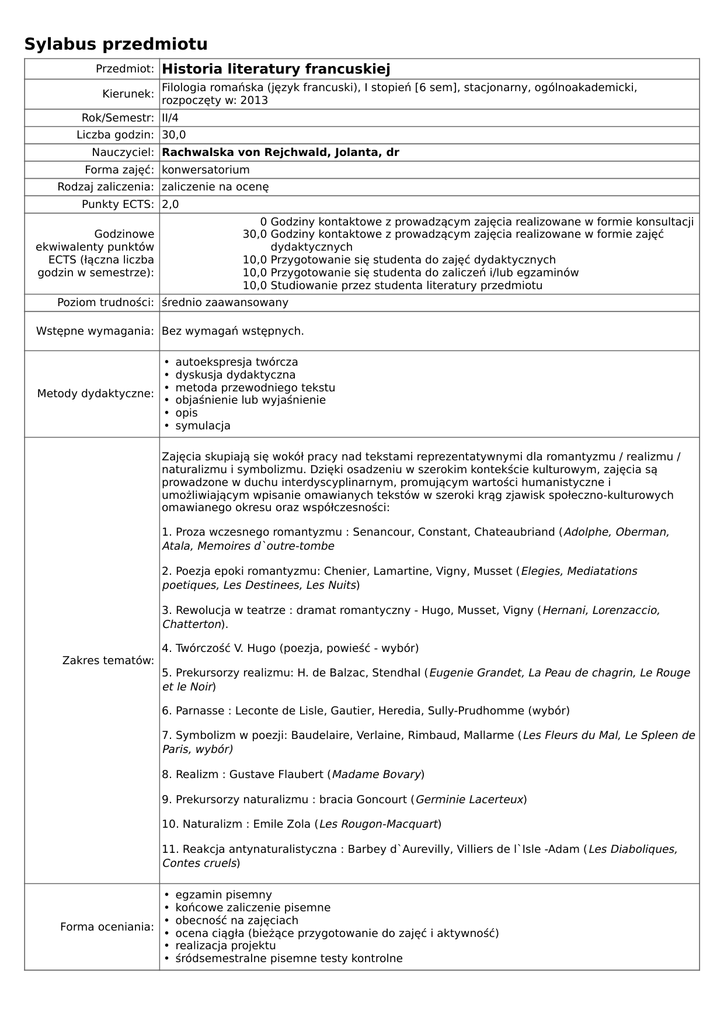 Sylabus przedmiotu Przedmiot: Historia literatury francuskiej Filologia romańska (język francuski), I stopień [6 sem], stacjonarny, ogólnoakademicki, Kierunek: rozpoczęty w: 2013 Rok/Semestr: II/4 Liczba godzin: 30,0 Nauczyciel: Rachwalska von Rejchwald, Jolanta, dr Forma zajęć: konwersatorium Rodzaj zaliczenia: zaliczenie na ocenę Punkty ECTS: 2,0 0 Godziny kontaktowe z prowadzącym zajęcia realizowane w formie konsultacji 30,0 Godziny kontaktowe z prowadzącym zajęcia realizowane w formie zajęć dydaktycznych 10,0 Przygotowanie się studenta do zajęć dydaktycznych 10,0 Przygotowanie się studenta do zaliczeń i/lub egzaminów 10,0 Studiowanie przez studenta literatury przedmiotu Godzinowe ekwiwalenty punktów ECTS (łączna liczba godzin w semestrze): Poziom trudności: średnio zaawansowany Wstępne wymagania: Bez wymagań wstępnych. • • • Metody dydaktyczne: • • • autoekspresja twórcza dyskusja dydaktyczna metoda przewodniego tekstu objaśnienie lub wyjaśnienie opis symulacja Zajęcia skupiają się wokół pracy nad tekstami reprezentatywnymi dla romantyzmu / realizmu / naturalizmu i symbolizmu. Dzięki osadzeniu w szerokim kontekście kulturowym, zajęcia są prowadzone w duchu interdyscyplinarnym, promującym wartości humanistyczne i umożliwiającym wpisanie omawianych tekstów w szeroki krąg zjawisk społeczno-kulturowych omawianego okresu oraz współczesności: 1. Proza wczesnego romantyzmu : Senancour, Constant, Chateaubriand ( Adolphe, Oberman, Atala, Memoires d`outre-tombe 2. Poezja epoki romantyzmu: Chenier, Lamartine, Vigny, Musset ( Elegies, Mediatations poetiques, Les Destinees, Les Nuits) 3. Rewolucja w teatrze : dramat romantyczny - Hugo, Musset, Vigny ( Hernani, Lorenzaccio, Chatterton). Zakres tematów: 4. Twórczość V. Hugo (poezja, powieść - wybór) 5. Prekursorzy realizmu: H. de Balzac, Stendhal ( Eugenie Grandet, La Peau de chagrin, Le Rouge et le Noir) 6. Parnasse : Leconte de Lisle, Gautier, Heredia, Sully-Prudhomme (wybór) 7. Symbolizm w poezji: Baudelaire, Verlaine, Rimbaud, Mallarme ( Les Fleurs du Mal, Le Spleen de Paris, wybór) 8. Realizm : Gustave Flaubert (Madame Bovary) 9. Prekursorzy naturalizmu : bracia Goncourt (Germinie Lacerteux) 10. Naturalizm : Emile Zola (Les Rougon-Macquart) 11. Reakcja antynaturalistyczna : Barbey d`Aurevilly, Villiers de l`Isle -Adam ( Les Diaboliques, Contes cruels) • • • Forma oceniania: • • • egzamin pisemny końcowe zaliczenie pisemne obecność na zajęciach ocena ciągła (bieżące przygotowanie do zajęć i aktywność) realizacja projektu śródsemestralne pisemne testy kontrolne 1. Aktywny udział w ćwiczeniach. Warunki zaliczenia: 2. Znajomość analizowanych tekstów w języku oryginału. 3. Przeczytanie jednego tekstu w całości ( wybór tytułu do uzgodnienia z prowadzącym) 4. Pozytywne zaliczenie egzaminu pisemnego. Modułowe efekty kształcenia realizowane w ramach przedmiotu: 01 Ma podstawową wiedzę o prądach, kierunkach rozwoju i gatunkach literackich oraz ich głównych przedstawicielach i najważniejszych dziełach literackich 03 Ma uporządkowaną wiedzę z zakresu literatury francuskiej 04 Zna i rozumie podstawowe metody analizy i interpretacji różnych tekstów literackich 05 Potrafi rozpoznać, scharakteryzować i zanalizować różne teksty literackie pod względem rodzajowym i gatunkowym 06 Właściwie rozumie, analizuje i interpretuje omawiane zagadnienia literackie 07 Potrafi porównać problematykę dzieł różnych autorów oraz sformułować odpowiednie wnioski 09 Posiada umiejętność spójnej wypowiedzi ustnej i pisemnej, o różnej długości, w zakresie prezentowanej tematyki literackiej 10 Posiada świadomość poziomu swojej wiedzy w zakresie historii literatury francuskiej i jest przygotowany do samodzielnego jej pogłębiania i aktualizowania 12 Docenia oraz pielęgnuje tradycję i dziedzictwo literackie krajów francuskiego obszaru językowego 13 Posiada aktywną postawę badacza i czytelnika literatury francuskojęzycznej. Wykazuje potrzebę uczestniczenia w życiu kulturalnym i literackim; bierze udział w spotkaniach literackich. J.Y. Tadie, Introduction a la vie litteraiare du XIX siecle, Paris, Bordas, 1982. C. Becker, Lire le realisme et le naturalisme, Paris, Dunod, 1999. Literatura: Ch. Biet, J.-P. Brighelli, Le XIX siecle en litterature, Paris, Hachette, 1982. R. Fortassier, Le roman francais au XIX siecle, Paris, PUF, 1982 D. Couty, XIX siecle, tomes I et II, Paris, Bordas, 1988. P. Frankastel, Peinture et societe, Paris, Gallimard, 1965.