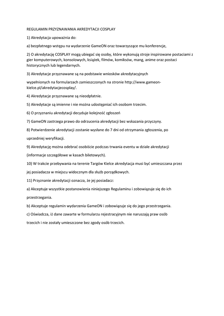 REGULAMIN PRZYZNAWANIA AKREDYTACJI COSPLAY 1) Akredytacja upoważnia do: a) bezpłatnego wstępu na wydarzenie GameON oraz towarzyszące mu konferencje, 2) O akredytację COSPLAY mogą ubiegać się osoby, które wykonują stroje inspirowane postaciami z gier komputerowych, konsolowych, książek, filmów, komiksów, mang, anime oraz postaci historycznych lub legendarnych. 3) Akredytacje przyznawane są na podstawie wniosków akredytacyjnych wypełnionych na formularzach zamieszczonych na stronie http://www.gameonkielce.pl/akredytacjecosplay/. 4) Akredytacje przyznawane są nieodpłatnie. 5) Akredytacje są imienne i nie można udostępniać ich osobom trzecim. 6) O przyznaniu akredytacji decyduje kolejność zgłoszeń 7) GameON zastrzega prawo do odrzucenia akredytacji bez wskazania przyczyny. 8) Potwierdzenie akredytacji zostanie wysłane do 7 dni od otrzymania zgłoszenia, po uprzedniej weryfikacji. 9) Akredytację można odebrać osobiście podczas trwania eventu w dziale akredytacji (informacje szczegółowe w kasach biletowych). 10) W trakcie przebywania na terenie Targów Kielce akredytacja musi być umieszczana przez jej posiadacza w miejscu widocznym dla służb porządkowych. 11) Przyznanie akredytacji oznacza, że jej posiadacz: a) Akceptuje wszystkie postanowienia niniejszego Regulaminu i zobowiązuje się do ich przestrzegania. b) Akceptuje regulamin wydarzenia GameON i zobowiązuje się do jego przestrzegania. c) Oświadcza, iż dane zawarte w formularzu rejestracyjnym nie naruszają praw osób trzecich i nie zostały umieszczone bez zgody osób trzecich.