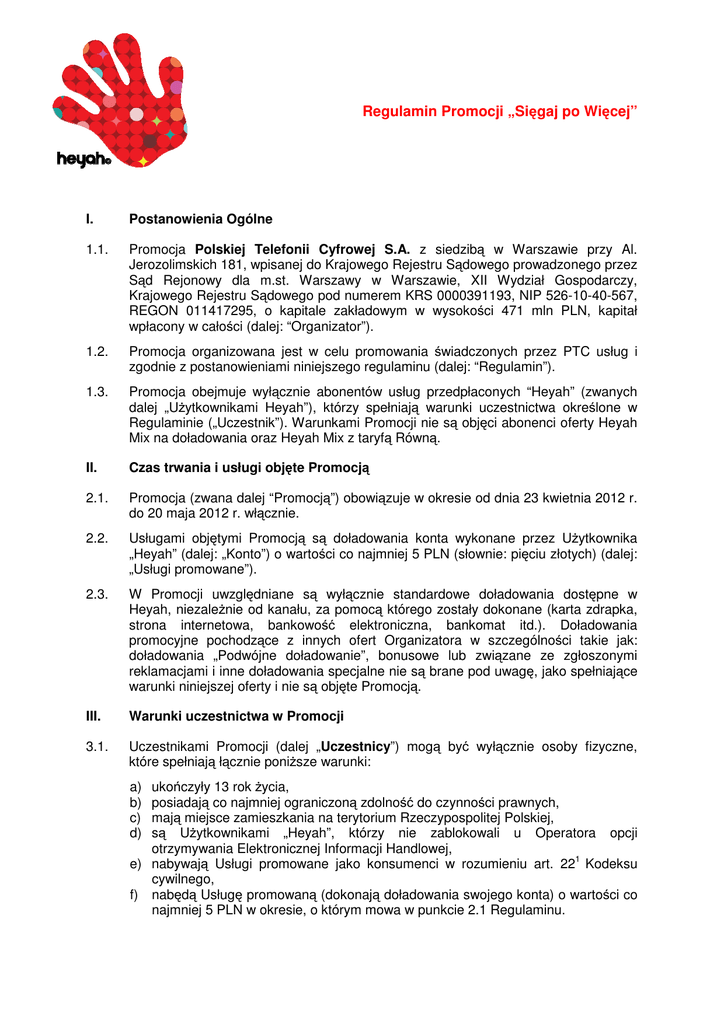 Regulamin Promocji „Sięgaj po Więcej” I. Postanowienia Ogólne 1.1. Promocja Polskiej Telefonii Cyfrowej S.A. z siedzibą w Warszawie przy Al. Jerozolimskich 181, wpisanej do Krajowego Rejestru Sądowego prowadzonego przez Sąd Rejonowy dla m.st. Warszawy w Warszawie, XII Wydział Gospodarczy, Krajowego Rejestru Sądowego pod numerem KRS 0000391193, NIP 526-10-40-567, REGON 011417295, o kapitale zakładowym w wysokości 471 mln PLN, kapitał wpłacony w całości (dalej: “Organizator”). 1.2. Promocja organizowana jest w celu promowania świadczonych przez PTC usług i zgodnie z postanowieniami niniejszego regulaminu (dalej: “Regulamin”). 1.3. Promocja obejmuje wyłącznie abonentów usług przedpłaconych “Heyah” (zwanych dalej „Użytkownikami Heyah”), którzy spełniają warunki uczestnictwa określone w Regulaminie („Uczestnik”). Warunkami Promocji nie są objęci abonenci oferty Heyah Mix na doładowania oraz Heyah Mix z taryfą Równą. II. Czas trwania i usługi objęte Promocją 2.1. Promocja (zwana dalej “Promocją”) obowiązuje w okresie od dnia 23 kwietnia 2012 r. do 20 maja 2012 r. włącznie. 2.2. Usługami objętymi Promocją są doładowania konta wykonane przez Użytkownika „Heyah” (dalej: „Konto”) o wartości co najmniej 5 PLN (słownie: pięciu złotych) (dalej: „Usługi promowane”). 2.3. W Promocji uwzględniane są wyłącznie standardowe doładowania dostępne w Heyah, niezależnie od kanału, za pomocą którego zostały dokonane (karta zdrapka, strona internetowa, bankowość elektroniczna, bankomat itd.). Doładowania promocyjne pochodzące z innych ofert Organizatora w szczególności takie jak: doładowania „Podwójne doładowanie”, bonusowe lub związane ze zgłoszonymi reklamacjami i inne doładowania specjalne nie są brane pod uwagę, jako spełniające warunki niniejszej oferty i nie są objęte Promocją. III. Warunki uczestnictwa w Promocji 3.1. Uczestnikami Promocji (dalej „Uczestnicy”) mogą być wyłącznie osoby fizyczne, które spełniają łącznie poniższe warunki: a) b) c) d) ukończyły 13 rok życia, posiadają co najmniej ograniczoną zdolność do czynności prawnych, mają miejsce zamieszkania na terytorium Rzeczypospolitej Polskiej, są Użytkownikami „Heyah”, którzy nie zablokowali u Operatora opcji otrzymywania Elektronicznej Informacji Handlowej, e) nabywają Usługi promowane jako konsumenci w rozumieniu art. 221 Kodeksu cywilnego, f) nabędą Usługę promowaną (dokonają doładowania swojego konta) o wartości co najmniej 5 PLN w okresie, o którym mowa w punkcie 2.1 Regulaminu. 3.2. Osoba, która spełnia łącznie warunki, o których mowa w punkcie 3.1, otrzyma niezwłocznie, nie później niż w ciągu 48 godzin od nabycia Usługi promowanej, nieodpłatną wiadomość SMS, zawierającą unikalny kod, wygenerowany automatycznie przez system informatyczny (dalej: „Kod Promocyjny”). 3.3. Przyznawanie Kodów Promocyjnych odbywa się w sposób automatyczny, z wykorzystaniem systemu teleinformatycznego zapewniającego indywidualność i niepowtarzalność przyznanych Kodów Promocyjnych. 3.4. Zgłoszenie uczestnictwa w Promocji następuje za pomocą strony internetowej zlokalizowanej pod adresem www.nagrody.heyah.pl (dalej „Serwis WWW”), przez podanie w formularzu zgłoszeniowym: a) Kodu Promocyjnego, b) numeru telefonu Uczestnika (numeru, na który otrzymana została wiadomość SMS, o której mowa w punkcie 3.2. Regulaminu), c) wyrażenie następujących zgód dotyczących przetwarzania danych Uczestnika: • zgoda na otrzymywanie ofert promocyjnych i propozycji zawarcia umowy (Informacje Handlowe), przygotowanych przez Organizatora lub Partnerów (tj. podmiotów, na zlecenie których - bezpośrednio lub pośrednio Organizator dostarcza Informacje Handlowe), w tym przekazywanych drogą elektroniczną (w szczególności e-mail, SMS, MMS, inna transmisja danych) lub przy użyciu automatycznych systemów wywołujących; • zgoda na przetwarzanie w celach marketingowych Organizatora lub Partnerów danych transmisyjnych związanych z numerem telefonu Uczestnika (tj. danych przetwarzanych przez Organizatora dla celów naliczania opłat lub przekazywania komunikatów w sieciach telekomunikacyjnych, w tym danych wskazujących lokalizację telekomunikacyjnego urządzenia końcowego) oraz innych danych dotyczących Uczestnika pozostających w dyspozycji Organizatora. 3.5. Jeśli Uczestnik spełni warunki przewidziane niniejszym Regulaminem otrzyma operatorską Nagrodę Gwarantowaną, o której mowa w pkt. IV Regulaminu. 3.6. Dokonanie zgłoszenia uczestnictwa w Promocji oznacza akceptację postanowień niniejszego Regulaminu. 3.7. Kod Promocyjny może być wykorzystany najpóźniej w ciągu 14 dni od otrzymania wiadomości SMS, o której mowa w punkcie 3.2 Regulaminu, nie później jednak niż do dnia 20 maja 2012 r. O zachowaniu tego terminu decyduje data zarejestrowania zgłoszenia przez system teleinformatyczny Organizatora. 3.8. Zgłoszenia zawierające nieprawidłowy Kod Promocyjny lub niepoprawny numer telefonu Uczestnika zostaną automatycznie odrzucone przez system informatyczny i nie będą traktowane jako zgłoszenie udziału w Promocji. 3.9. W przypadku otrzymania przez Organizatora więcej niż jednego zgłoszenia zawierającego taki sam Kod Promocyjny, Organizator uwzględni jedynie pierwsze otrzymane zgłoszenie. 3.10. Uczestnik może dokonać dowolną liczbę zgłoszeń uczestnictwa w Promocji, pod warunkiem, że za każdym razem poda inny Kod Promocyjny. 3.11. Uczestnictwo w Promocji, w tym dokonanie zgłoszenia zgodnie z postanowieniem punktu 3.4., jest całkowicie nieodpłatne. 3.12. Warunkiem otrzymania przez Uczestnika w niniejszej Promocji Nagrody Gwarantowanej jest uregulowanie wszystkich zaległych płatności wobec Organizatora oraz posiadanie konta, którego saldo nie jest ujemne. Doładowania biorące udział w Promocji nie mogą być uzyskane sprzecznie z p
