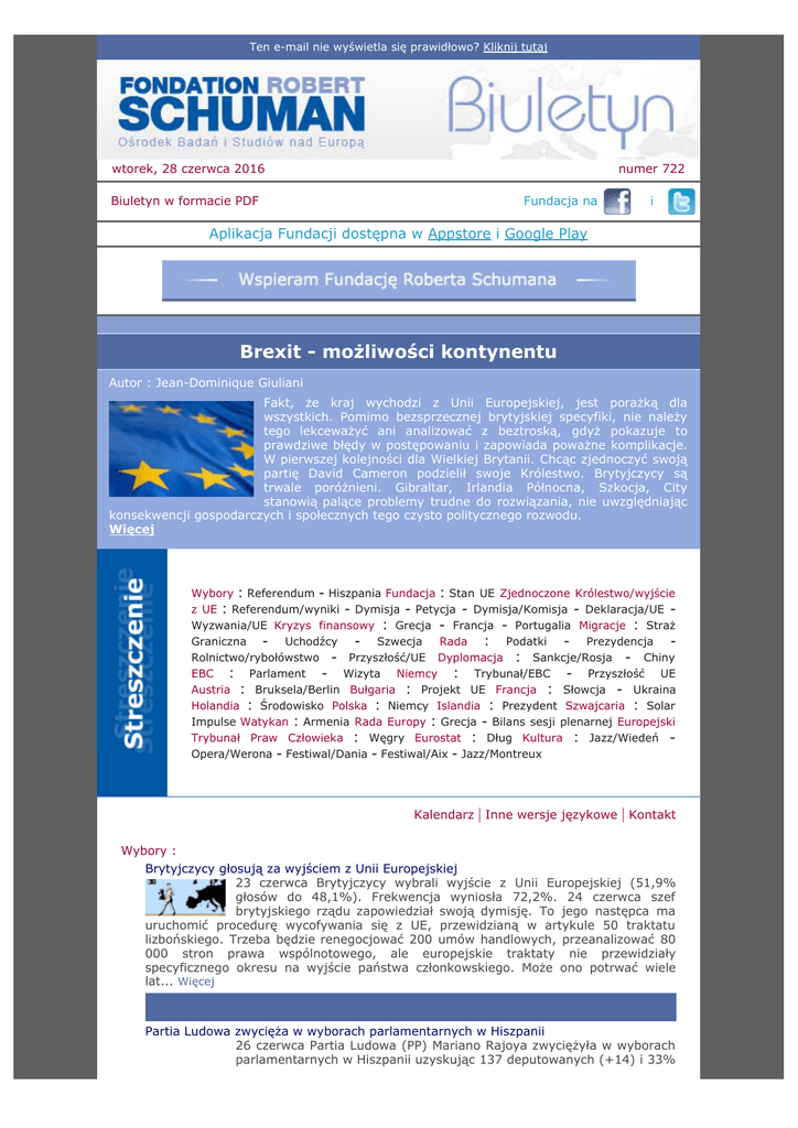 Ten e-mail nie wyświetla się prawidłowo? Kliknij tutaj wtorek, 28 czerwca 2016 Biuletyn w formacie PDF numer 722 Fundacja na i Aplikacja Fundacji dostępna w Appstore i Google Play Brexit - możliwości kontynentu Autor : Jean-Dominique Giuliani Fakt, że kraj wychodzi z Unii Europejskiej, jest porażką dla wszystkich. Pomimo bezsprzecznej brytyjskiej specyfiki, nie należy tego lekceważyć ani analizować z beztroską, gdyż pokazuje to prawdziwe błędy w postępowaniu i zapowiada poważne komplikacje. W pierwszej kolejności dla Wielkiej Brytanii. Chcąc zjednoczyć swoją partię David Cameron podzielił swoje Królestwo. Brytyjczycy są trwale poróżnieni. Gibraltar, Irlandia Północna, Szkocja, City stanowią palące problemy trudne do rozwiązania, nie uwzględniając konsekwencji gospodarczych i społecznych tego czysto politycznego rozwodu. Więcej Wybory : Referendum - Hiszpania Fundacja : Stan UE Zjednoczone Królestwo/wyjście z UE : Referendum/wyniki - Dymisja - Petycja - Dymisja/Komisja - Deklaracja/UE Wyzwania/UE Kryzys finansowy : Grecja - Francja - Portugalia Migracje : Straż Uchodźcy Szwecja Rada : Podatki Prezydencja Graniczna Rolnictwo/rybołówstwo - Przyszłość/UE Dyplomacja : Sankcje/Rosja - Chiny EBC : Parlament - Wizyta Niemcy : Trybunał/EBC - Przyszłość UE Austria : Bruksela/Berlin Bułgaria : Projekt UE Francja : Słowcja - Ukraina Holandia : Środowisko Polska : Niemcy Islandia : Prezydent Szwajcaria : Solar Impulse Watykan : Armenia Rada Europy : Grecja - Bilans sesji plenarnej Europejski Trybunał Praw Człowieka : Węgry Eurostat : Dług Kultura : Jazz/Wiedeń Opera/Werona - Festiwal/Dania - Festiwal/Aix - Jazz/Montreux Kalendarz | Inne wersje językowe | Kontakt Wybory : Brytyjczycy głosują za wyjściem z Unii Europejskiej 23 czerwca Brytyjczycy wybrali wyjście z Unii Europejskiej (51,9% głosów do 48,1%). Frekwencja wyniosła 72,2%. 24 czerwca szef brytyjskiego rządu zapowiedział swoją dymisję. To jego następca ma uruchomić procedurę wycofywania się z UE, przewidzianą w artykule 50 traktatu lizbońskiego. Trzeba będzie renegocjować 200 umów handlowych, przeanalizować 80 000 stron prawa wspólnotowego, ale europejskie traktaty nie przewidziały specyficznego okresu na wyjście państwa członkowskiego. Może ono potrwać wiele lat... Więcej Partia Ludowa zwycięża w wyborach parlamentarnych w Hiszpanii 26 czerwca Partia Ludowa (PP) Mariano Rajoya zwyciężyła w wyborach parlamentarnych w Hiszpanii uzyskując 137 deputowanych (+14) i 33% głosów. Wyprzedziła socjalistów (PSOE), którzy zajęli 2. miejsce z 85 mandatami i 22,66% głosów (-5), koalicję radykalnej lewicy Unidos Podemos z 21,26% i 71 mandatami (=) oraz Ciudadanos z 13% i 32 mandatami (-8). PP nie osiągnęła większości absolutnej 176 na 350 miejsc w izbie niższej. Rządzący od 2011 roku premier musi jeszcze wynegocjować warunki sojuszu, który pozwoli mu pozostać u władzy... Więcej Fundacja : "Rapport Schuman sur l'Europe, l'état de l'Union 2016" Ukazało się 10. wydanie "Rapport Schuman sur l'Europe, l'état de l'Union 2016". Jest dostępne w księgarniach, na stronie Fundacji oraz w wersji cyfrowej. Zamów tę książkę... Więcej Zjednoczone Królestwo/wyjście z UE : Zjednoczone Królestwo wybiera wyjście z Unii Europejskiej Według ostatecznych wyników, opublikowanych przez brytyjską Komisję Wyborczą, 23 czerwca Brytyjczycy opowiedzieli się za wyjściem z Unii Europejskiej (51,9% głosów, 17,4 mln osób). Przeciw było 48,1% (16,1 mln głosujących)... Więcej Dymisja Davida Camerona 24 czerwca, nieco po ogłoszeniu ostatecznych wyników referendum, brytyjski premier David Cameron zapowiedział swoją dymisję. Jednocześnie doprecyzował, że pozostanie na stanowisku do jesieni... Więcej Petycja w sprawie 2. referendum w Zjednoczonym Królestwie 25 czerwca zainicjowano petycję na stronie Izby Gmin domagającą się przeprowadzenia drugiego referendum w sprawie przynależności Zjednoczonego Królestwa do UE. Zarejestrowano po nią już ponad 3 mln podpisów... Więcej Dymisja komisarza Jonathana Hilla 25 czerwca Komisja Europejska powiadomiła o dymisji komisarza Jonathana Hilla zajmującego się usługami finansowymi. Jego kompetencje zostały przekazane wiceprzewodniczącemu Komisji Valdisowi Dombrovskisowi... Więcej Wspólna deklaracja europejskich przywódców 24 czerwca, w reakcji na wynik referendum w Zjednoczonym Królestwie za wyjściem tego kraju z Unii Europejskiej, Donald Tusk, Martin Schulz, Mark Rutte i Jean-Claude Juncker zabrali głos we wspólnej deklaracji... Więcej Posiedzenie ministrów spraw zagranicznych 6 krajów założycielskich 25 czerwca w Berlinie zgromadzili się ministrowie spraw zagranicznych 6 krajów założycieli UE. Nakreślili listę wielkich wyzwań, z którymi będzie się musiała zmierzyć UE "w zglobalizowanym świecie" oraz w kontekście rosnącej niestabilności i geopolitycznych zmian na granicach Europy... Więcej Kryzys finansowy : Wizyta Jean-Claude'a Junckera w Grecji 21 czerwca przelano Grecji kolejną transzę pożyczki w wysokości 7,5 mld euro, ogłosili w Atenach liczni europejscy przywódcy, w tym przewodniczący Komisji Jean-Claude Juncker. Ten ostatni po rozmowie z greckim premierem Alexisem Tsiprasem ocenił, że kraj przekroczył "punkt krytyczny" na drodze do swojego uzdrowienia... Więcej Wzrost bezrobocia we Francji Według danych opublikowanych 24 czerwca przez Ministerstwo Pracy w maju we Francji liczba osób poszukujących zatrudnienia, a nie mających żadnego zajęcia poszła w górę po dwóch miesiącach spadku z rzędu. W urzędach pracy zarejestrowanych było 3,52 mln osób (wobec 3,511 mln w kwietniu). Stanowi to wzrost o 0,3% (ponad 9 000 osób)... Więcej Raport na temat sytuacji gospodarczej Portugalii 22 czerwca EBC i Komisja Europejska podsumowały analizę portugalskiej gospodarki. Stwierdziły, że tempo ożywienia nie sprostało oczekiwaniom, co zwi