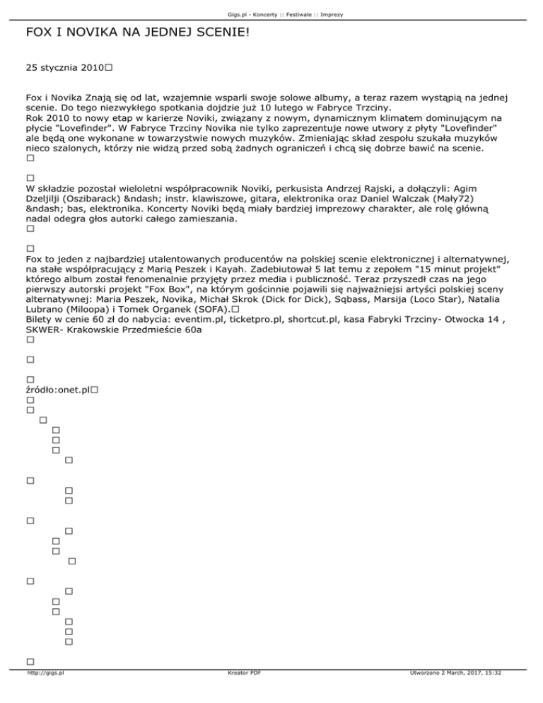 Gigs.pl - Koncerty :: Festiwale :: Imprezy FOX I NOVIKA NA JEDNEJ SCENIE! 25 stycznia 2010 Fox i Novika Znają się od lat, wzajemnie wsparli swoje solowe albumy, a teraz razem wystąpią na jednej scenie. Do tego niezwykłego spotkania dojdzie już 10 lutego w Fabryce Trzciny. Rok 2010 to nowy etap w karierze Noviki, związany z nowym, dynamicznym klimatem dominującym na płycie "Lovefinder". W Fabryce Trzciny Novika nie tylko zaprezentuje nowe utwory z płyty "Lovefinder" ale będą one wykonane w towarzystwie nowych muzyków. Zmieniając skład zespołu szukała muzyków nieco szalonych, którzy nie widzą przed sobą żadnych ograniczeń i chcą się dobrze bawić na scenie. W składzie pozostał wieloletni współpracownik Noviki, perkusista Andrzej Rajski, a dołączyli: Agim Dzeljilji (Oszibarack) – instr. klawiszowe, gitara, elektronika oraz Daniel Walczak (Mały72) – bas, elektronika. Koncerty Noviki będą miały bardziej imprezowy charakter, ale rolę główną nadal odegra głos autorki całego zamieszania. Fox to jeden z najbardziej utalentowanych producentów na polskiej scenie elektronicznej i alternatywnej, na stałe współpracujący z Marią Peszek i Kayah. Zadebiutował 5 lat temu z zepołem "15 minut projekt" którego album został fenomenalnie przyjęty przez media i publiczność. Teraz przyszedł czas na jego pierwszy autorski projekt "Fox Box", na którym gościnnie pojawili się najważniejsi artyści polskiej sceny alternatywnej: Maria Peszek, Novika, Michał Skrok (Dick for Dick), Sqbass, Marsija (Loco Star), Natalia Lubrano (Miloopa) i Tomek Organek (SOFA). Bilety w cenie 60 zł do nabycia: eventim.pl, ticketpro.pl, shortcut.pl, kasa Fabryki Trzciny- Otwocka 14 , SKWER- Krakowskie Przedmieście 60a źródło:onet.pl http://gigs.pl Kreator PDF Utworzono 2 March, 2017, 15:32 Gigs.pl - Koncerty :: Festiwale :: Imprezy http://gigs.pl Kreator PDF Utworzono 2 March, 2017, 15:32 Gigs.pl - Koncerty :: Festiwale :: Imprezy http://gigs.pl Kreator PDF Utworzono 2 March, 2017, 15:32