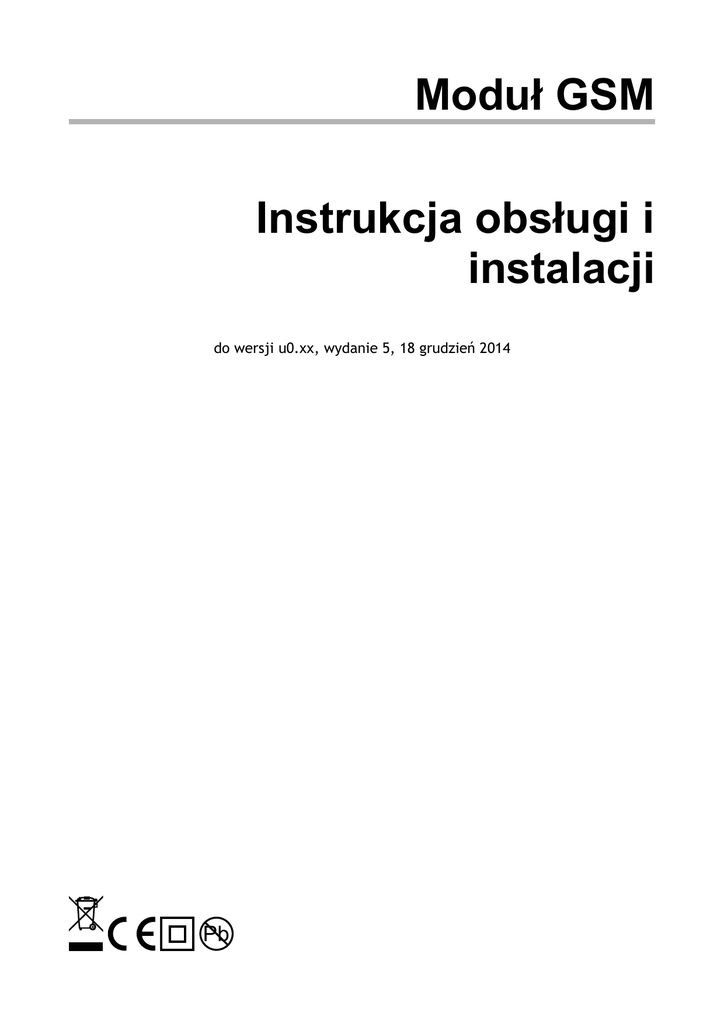 Moduł GSM Instrukcja obsługi i instalacji do wersji u0.xx, wydanie 5, 18 grudzień 2014 Pb Wstęp Moduł GSM umożliwia zdalną kontrolę regulatorów COMPIT posługujących się protokołem transmisji C14. Za pomocą prostych rozkazów SMS można odczytać i zmienić wybrane parametry każdego regulatora podłączonego do sieci. Informacja o stanach alarmowych jest wysyłana automatycznie na wybane numery telefonów. Wygląd 123 mm 103mm antena START SYSTEMU PT 9:30 30 wyświetlacz 145mm SYGNAŁ:***** 20 PIN:OK ILOŚĆ ODB. SMS: 0 SMS: OD: klawisze osłona złącz wkręt mocujący Dane techniczne Zasilanie: Prąd pobierany przez regulator: Maksymalny prąd przekaźnika: Stopień ochrony regulatora: Temperatura otoczenia: Temperatura składowania: Wilgotność względna: Zakresy pomiarowy: Rozdzielczości pomiaru: Dokładności pomiaru: Przyłącza: Wyświetlacz: Wymiary: Masa kompletu: 230V, 50Hz I = 0,03A 4(2)A IP20 0..55°C 0..55°C 5 – 80% bez kondensacji pary wodnej -39..+69°C 1°C 1°C Zaciski śrubowe 1x1,5mm² LCD graficzny 103x145x45mm 0.6 kg Instrukcja do modułu GSM wersja u0.xx wydanie 5 Rozmieszczenie wyprowadzeń Poniższy rysunek przedstawia rozmieszczenie wyprowadzeń modułu GSM. 1 3 5 7 2 4 6 8 9 11 13 15 10 12 14 16 SIM F 2A 9 12 11 LN sieć 230V 50Hz Opis wyprowadzeń: 2-8 czujnik temperatury GSM 5 – RS-B 7 – RS-A 9 – przekaźnik styk normalnie zwarty (NC) 10 – nie podłączony 11 – przekaźnik styk normalnie rozwarty (NO) 12 – przekaźnik styk wspólny 13-15 Zacisk L zasilania 14-16 Zacisk N zasilania Karta SIM Moduł GSM wymaga zainstalowania karty SIM która ma włączoną kontrolę kodu PIN, a PIN ma wartość 7227. Kartę SIM instaluje się kiedy moduł jest wyłączony (odłączony od zasilania). Doładowanie Należy pamiętać o doładowaniu karty SIM lub opłaceniu abonamentu. Środki dostępne na karcie można kontrolować na stronie operatora sieci GSM. Podłączenie Moduł GSM komunikuje się z regulatorami posługującymi się protokołem C14 i przyłączonymi do wspólnej sieci. Do połączenia można przy niewielkich odległościach (do 15m) użyć zwykłego przewodu np: 2x0,5mm2. Przy dłuższych połączeniach lepiej jest użyć skrętki ekranowanej. Ekran w takim przypadku należy uziemić w jednym miejscu. Urządzenia łączy się w łańcuch, zaciski A do jednej linii a zaciski B do drugiej. Całkowita długość linii transmisyjnej nie może przekroczyć 1000m. Dla długich linii zaleca się na zaciskach skrajnych urządzeń przyłączyć rezystory o wartości 100Ω tak jak to zostało przedstawione na poniższej ilustracji. Instrukcja do modułu GSM wersja u0.xx wydanie 5 R 100Ω RS-A RS-B RS-A RS-B RS-A RS-B R 100Ω Ilustracja 1: Schemat prawidłowego połączenia interfejsu. Prawidłowo podłączony moduł GSM odbiera aktualne parametry pracy każdego działającego w sieci urządzenia. Parametry te moduł może odesłać w odpowiedzi na żadanie przesłane sms'em przez użytkownika. Komunikacja z regulatorami Aby odczytać parametry urządzenia należy za pomoca telefonu komórkowego należy wysłac odpowiednią wiadomość sms na numer modułu GSM. Wiadomości muszą rozpoczynać się od kropki. Moduł rozpoznaje komendy pisane DUŻYMI LITERAMI. Treść SMS Znaczenie .SOLxx T Odczyt parametrów regulatora SolarComp S1 o adresie xx. Np. SOL01 T - odczyt parametrów regulatora o adresie 1. .SOLxx U1 Włączenie trybu urlopowego w regulatorze SolarComp S1 o adresie xx. Np. SOL02 U1 - włączenie trybu urlopowego w regulatorze o adresie 2. .SOLxx U0 Wyłączenie trybu urlopowego w regulatorze SolarComp S1 o adresie xx. Np. SOL03 U0 - wyłączenie trybu urlopowego w regulatorze o adresie 3. .KCOx T Odczyt parametrów regulatora kotłowego o adresie x, x może być równe 1 lub 2. Np. KC01 T – odczytanie parametrów regulatora kotłowego o adresie 1. .KCOx Ztt Ustawienie temperatury zadanej na tt°C w regulatorze kotłowym o adresie x, x może być równe 1 lub 2. Wartość tt musi mieścić się w zakresie od 0 do 99. Jeżeli wpisana wartość przekracza ograniczenia zaprogramowane w regulatorze to regulator przyjmię najbliższą możliwą wartość. Np. KC1 Z60 – ustawienie temperatury zadanej regulatora kotłowego o adresie 1 na 60°C. .PPC T Odczyt parametrów regulatora powetrznej pompy ciepła. .PPC .PPC .PPC .PPC .PPC Zmiana trybu pracy regulatora powietrznej pompy ciepła P0 – wyłączenie, PG – grzałka, PA – automatyczny, PE – ekonomiczny, PK - komfortowy P0 PG PA PE PK Instrukcja do modułu GSM wersja u0.xx wydanie 5 Treść SMS Znaczenie .NANOx A .NANOx U Ustawienie trybu pracy NANO o adresie x w zakresie od 1 do 9. A – tryb automatyczny U – tryb urlopowy Np. NANO3 U załącza tryb urlopowy w NANO o adresie 3 .NANOx CW0 .NANOx CW1 Sterowanie wymuszeniem CWU na NANO o adresie x w zakresie od 1 do 9. CW0 – wyłącza wymuszenie CWU CW1 – załącza wymuszenie CWU Np. NANO1 CW1 – załącza wymuszenie CWU w NANO o adresie 1 .T? Odczyt temperatury podłączonego do modułu GSM czujnika. .P1 Załączenie wbudowanego w moduł GSM przekaźnika. .P0 Wyłączenie wbudowanego w moduł GSM przekaźnika. Obsługa Znaczenie klawiszy Klawisz ON/OFF Powoduje powrót do wyższego poziomu menu, lub do ekranu podstawowego. Klawisz ENTER Z poziomu głównego MENU przenosi do wybranego podmenu. W podmenu przełącza pomiędzy trybem przeglądania listy listy parametrów a trybem edycji (zmiany wartości) parametru. Klawisz minus / strzałka w dół Z poziomu ekranu podstawowego powoduje wyświetlenie głównego MENU. Na poziomie menu i podmenu zmienia wybrany parametr. W trybie edycji parametrów zmniejsza edytowaną wartość. Klawisz plus / strzałka w górę Na poziomie menu i podmenu zmienia wybrany parametr. W trybie edycji parametrów zwiększa edytowaną wartość. Ekran podstawowy Na ekranie podstawowym można odczytać: 1. czas z wbudowanego w moduł GSM zegara. 2. Poziom sygnału GSM 3. Informację PIN:OK – j
