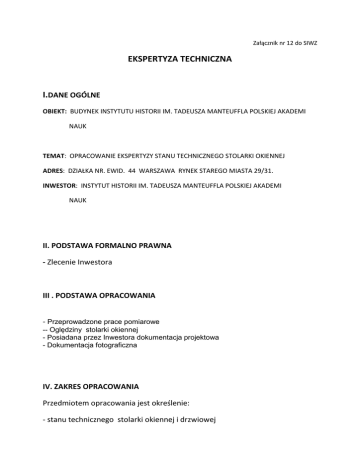 Załącznik nr 12 do SIWZ EKSPERTYZA TECHNICZNA I.DANE OGÓLNE OBIEKT: BUDYNEK INSTYTUTU HISTORII IM. TADEUSZA MANTEUFFLA POLSKIEJ AKADEMI NAUK TEMAT: OPRACOWANIE EKSPERTYZY STANU TECHNICZNEGO STOLARKI OKIENNEJ ADRES: DZIAŁKA NR. EWID. 44 WARSZAWA RYNEK STAREGO MIASTA 29/31. INWESTOR: INSTYTUT HISTORII IM. TADEUSZA MANTEUFFLA POLSKIEJ AKADEMI NAUK II. PODSTAWA FORMALNO PRAWNA - Zlecenie Inwestora III . PODSTAWA OPRACOWANIA - Przeprowadzone prace pomiarowe -- Oględziny stolarki okiennej - Posiadana przez Inwestora dokumentacja projektowa - Dokumentacja fotograficzna IV. ZAKRES OPRACOWANIA Przedmiotem opracowania jest określenie: - stanu technicznego stolarki okiennej i drzwiowej - ekspertyza ma na celu ocenić możliwości konserwacji stolarki okiennej i drzwiowej V. OPIS STANU ISTNIEJĄCEGO Warszawa Rynek 29,31,Piwna 48 będąca siedzibą IH PAN jest zabytkiem architektury mieszczańskiej. Ze zniszczeń 1944 r. ocalała znaczna część autentycznego obiektu. W roku 1913 kamienica Książąt Mazowieckich została wykupiona środkami społecznymi z rąk prywatnych i przekazana Towarzystwu Miłośników Historii. Z inicjatywy TMH kamienica została poddana badaniom historyczno- architektonicznym a następnie programowi prac konserwatorskich. Powierzchnia zabudowy: Piwna 48 -182 m2 Rynek Starego Miasta 31 -221 m2 Rynek Starego miasta 29 - 245 m2 Razem powierzchnia zabudowy – 648 m2 Powierzchnia netto – 2125,49 m2 Powierzchnia użytkowa -1672,37 m2 W kamienicach znajdują się okna dwuskrzydłowe z okresu powojennego. Są to okna drewniane skrzynkowe Skrzydła podzielone są poziomymi szprosami ze słupkiem ruchomym. Stan okien jest dobry, wymaga tylko prac remontowych i konserwatorskich. Drzwi wykonane z drewna sosnowego poprzez wieloletnie użytkowanie stolarka jest popękana opuszczona z uszkodzonymi okuciami tylko drzwi które bardzo uszkodzone wymagają wymiany pozostałe należy wyremontować . Remont okien i drzwi należy wykonać w następujący sposób : · Zdemontować drzwi , okno i przetransportować do warsztatu. Na czas remontu osadzić drzwi i okna zastępcze. · Zdemontować uszkodzone okucia · Oczyścić stolarkę z istniejących warstw malarskich metodą chemiczną i mechaniczna w sposób nie uszkadzający lica drewna. · Wzmocnić złącza stolarskie w narożach, nośność charakterystyczna złączy w narożach ram drzwiowych nie mniejsza niż 700 N. · Powierzchnię drewna wykończyć na gładko, uzupełnić detale i elementy profilowane. · Malować farbą podkładową i dwukrotnie tiksotropową farbą alkidową półpołysk, w kolorze białym - o odcieniu białym lub brązowym zgodnie ze stanem istniejącym · Osadzenie zawiasów do sprawdzenia i ew. wzmocnienia. · Wymienić zamek z ponownym montażem istniejących klamek i szyldzików mosiężnych. Z uwagi na stosunkowo duży ciężar klamek mosiężnych - zamek o wzmocnionej sprężynie. Drzwi zamykane na zamek bębenkowy, montowany podklamkowo. Montaż drzwi na wyremontowanej „in situ” ościeżnicy, malowanej farbą jak wyżej.- uzupełnić ewentualne braki tynku , powstałe podczas usuwania ościeżnic - zamontować nowe ościeżnice - zamontować skrzydła drzwiowe - zamontować nowe profilowane listwy przyścienne Wszystkie nowe elementy wykonać na wzór starych. Wszystkie elementy zabezpieczyć farbą do drewna przed montażem , w odpowiednim kolorze (biały, brązowy). Ewentualne powstałe uszkodzenia w trakcie montażu , lub ubytki powstałe na skutek montażu, usunąć po zamontowaniu wszystkich elementów. Wykaz drzwi w Instytucie Historii PAN kwalifikujących się do wymiany Parter –szt. 3 -pokój 1.2 plus drzwi wejściowe do biblioteki jednoskrzydłowe brązowe szt. 3 - wypaczone , krzywe ,uszkodzone zawiasy, zamki opuszczone na zawiasach stan techniczny zły nie ma możliwości naprawy szt. 3 I piętro –szt. 9 - pokój 9 i 10 jednoskrzydłowe białe szt. 2 Wypaczone pęknięte , krzywe uszkodzone zawiasy, zamki opuszczone na zawiasach , szczeliny między ościeżnica a skrzydłem, stan techniczny zły nie ma możliwości naprawy - Korytarz przy dziale finansowym jednoskrzydłowe brązowe szt.1 Wypaczone pęknięte , krzywe uszkodzone zawiasy, zamki ,opuszczone na zawiasach , szczeliny między ościeżnica a skrzydłem, stan techniczny zły nie ma możliwości naprawy - WC przy dziale finansowym jednoskrzydłowe białe szt. 2 Wypaczone pęknięte , krzywe uszkodzone zawiasy, zamki opuszczone na zawiasach , szczeliny między ościeżnica a skrzydłem, stan techniczny zły nie ma możliwości naprawy - pokój nr 12 serwerownia –jednoskrzydłowe białe 1 szt. Wypaczone, krzywe uszkodzone zawiasy, zamki ,opuszczone na zawiasach , szczeliny między ościeżnica a skrzydłem, stan techniczny zły nie ma możliwości naprawy - Wejście do pokoju 13/14/15 z kl. schodowe jednoskrzydłowe drewniane brązowe szt. 1 Wypaczone pęknięte , krzywe uszkodzone zawiasy, zamki opuszczone na zawiasach , szczeliny między ościeżnica a skrzydłem, stan techniczny zły nie ma możliwości naprawy - pokój nr 16 – atlas historyczny podwójne brązowe szt. 1 Wypaczone pęknięte , krzywe uszkodzone zawiasy, zamki opuszczone na zawiasach , szczeliny między ościeżnica a skrzydłem, stan techniczny zły nie ma możliwości naprawy -Drzwi –przejście z budynku 29-31 przy pokoju nr 16 brązowe jednoskrzydłowe szt. 1 Wypaczone pęknięte , krzywe uszkodzone zawiasy, zamki opuszczone na zawiasach , szczeliny między ościeżnica a skrzydłem, stan techniczny zły nie ma możliwości naprawy II piętro – szt.14 - pokój 21,22,23 oraz drzwi wewnętrzne między pokojami jednoskrzydłowe białe szt. 5 Wypaczone pęknięte , krzywe uszkodzone zawiasy, zamki opuszczone na zawiasach , szczeliny między ościeżnica a skrzydłem, stan techniczny zły nie ma możliwości naprawy -korytarz przy pok.21,22,23 jednoskrzydłowe brązowe szt. 1 Wypaczone pęknięte , krzywe uszkodzone zawiasy, zamki opuszczone na zawias