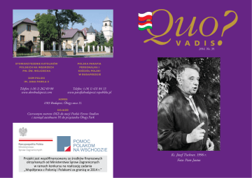 2014. No. 39. Stowarzyszenie Katolików Polskich na We ˛grzech pw. św. Wojciecha Polska Parafia Personalna i Kościół Polski w Budapeszcie Dom Polski im. Jana Pawła II Telefon: (+36 1) 262 69 08 www.dombudapeszt.com Telefon: (+36 1) 431 84 13 www.parafiabudapeszt.republika.pl Adres 1103 Budapest, Óhegy utca 11. Dojazd Czerwonym metrem (M2) do stacji Puskás Ferenc Stadion i stamtąd autobusem 95 do przystanku Óhegy Park Projekt jest współfinansowany ze środków finansowych otrzymanych od Ministerstwa Spraw Zagranicznych w ramach konkursu na realizację zadania „Współpraca z Polonią i Polakami za granicą w 2014 r.” Ks. Józef Tischner, 1996 r. Foto: Piotr Jantos Drodzy Czytelnicy W Wasze ręce trafia „jesienny numer” naszego Quo vadis. Jesienna pora jest nie lada wyzwaniem dla świata przyrody, a także i dla nas. Widoczne przemiany za naszym oknem i obserwowane przemiany nas samych, okazują się nieodzownym tłem życia, tłem do którego intuicyjnie jesteśmy przyzwyczajeni i przechodzimy nad nimi do porządku dziennego. A właśnie ta, jesienna pora, bardziej prowokuje do głębszego przyglądnięcia się zachodzącym zmianą. I dostrzegamy je nie tylko w przyrodzie ale i w nas. Bardziej też widzimy je w świecie spraw ludzkich, które tworzą nowe, nieznane dotąd sytuacje, jak i te, już zaobserwowane, ale przychodzące z większym nasileniem. Te zmiany mogą mieć wiele poziomów. Zaczynając od szeroko pojmowanych spraw społecznych, a na naszym duchowym życiu kończąc. Te zmiany również, stają się przyczynkiem do pojawienia się pytań. Wynikają one często z trudności zrozumienia tych zmian, a także szybkości ich zachodzenia. Tak więc przykładowe pytania: dlaczego te zmiany następują? I dalej, co będzie ich owocem? – mają w sobie coś z uwierającego kamyka. Gdy trochę wsłuchamy się w głos tak stawianych pytań, wyczujemy nutkę zaniepokojenia, niepewności, czy nawet lęku. Trudno nam nieraz je ocenić: czy są dobre czy złe. Szukamy wtedy czegoś stałego, co pozwoliłoby się nam odnaleźć w tym już prawie galopującym nurcie przemian. Pomocą w uchwyceniu kierunku, jak rozumieć przemiany tego świata i siebie, mogą być słowa św. Augustyna: „Niespokojne jest serce człowieka dopóki nie spocznie w Bogu.” Tę zmienność, czy nam się to podoba czy nie, trzeba przyjąć i z nią się oswoić. Nie ma bowiem nic trwałego w tym ziemskim świecie, ulega on zmianie, a my wraz z nim. Przypomina to trochę jazdę szybkim pociągiem, za którego oknem obrazy pojawiają się błyskawicznie: góra, rzeka, tunel las, dolina i znów góra, i tak do końca podróży. Ale jednak cel naszej jazdy w trakcie mijanych obrazów się nie zmienia. Wiemy dokąd prowadzi ta droga. I tak przez analogie możemy to odnieść do naszych doświadczeń. Gdy już wiemy dokąd prowadzi nasza droga życia, nadchodzące, a nieznane dotąd nam obrazy, nie będą budziły takiego zaniepokojenia czy lęku. Będziemy mogli wyciszać nasze niespokojne serce dzięki pewności drogi, która nieomylnie prowadzi nas do niezmiennej i stałej miłości Boga. Ucieszy nas to bardzo, Drodzy Czytelnicy, gdy w przedstawionych, materiałach odnajdziecie dla siebie pewną inspirującą pomoc w pokonywaniu zachodzących zmian i odnajdywaniu najpewniejszej drogi do spokoju serca. Ks. Krzysztof Grzelak TChr 2 Solidarność w myślach i działaniach ks. Józefa Tischner a Pod tym tytułem odbyło się 24 sierpnia 2014 r. w Domu Polskim spotkanie z publicystą katolickim Januszem Poniewierskim, prezesem Klubu Chrześcijan i Żydów „Przymierze”, byłym redaktorem „Tygodnika Powszechnego”, wieloletnim redaktorem „Znaku”, autorem wielu książek o papieżu Janie Pawle II, jak i redaktorem wielu książek ks. J. Tischnera. Ks. prof. J.Tischner był jednym z bardziej znanych filozofów katolickich w Polsce i w czasach transformacji budził zaufanie, uczył wiary, był wzorem dla wielu Polaków, próbował pomagać rodakom przechodzić przez kolejne zakręty historii. Został zapamiętany jako nauczyciel wolności, solidarności i nadziei. Przejmująca jest relacja ks. J. Tischnera z pobytu u Jana Pawła II we Włoszech w 1980 r. „Jedliśmy z Papieżem kolację, kiedy włoska telewizja pokazała zdjęcia z Gdańska. Brama strajkującej Stoczni. Tłum ludzi. Na sztachetach stoczniowego płotu pozatykane bukiety kwiatów. Kamera najeżdża na bramę i między tymi kwiatami pokazuje portret Jana Pawła II. A ten Papież siedzi obok mnie. Skulił się. Nie powiedział słowa. Myśmy też zamilkli. Nie było jeszcze wiadomo, jak to się wszystko skończy. Powszechne było przekonanie, że to On nabroił”. W kazaniu wygłoszonym na Wawelu w 1980 r., ks. J. Tischner określił „Solidarność” słowami: które znajdują się u św. Pawła: „jeden drugiego ciężary noście, a tak wypełnicie prawo Boże”, czyli jako gotowość do ofiary, która w 1980 r. wydawała się czymś oczywistym. Powiedział jeszcze coś bardzo istotnego: „Najgłębsza solidarność jest solidarnością sumień”, a sumienie świadczy o godności człowieka. Ks. Tischner był kapelanem „Solidarności”: głosił homilie na solidarnościowych mszach, święcił sztandary, a w stanie wojennym jeździł do obozów dla internowanych i pomagał przetrzymywanym tam działaczom. Jego książka „Etyka solidarności” miała w podziemiu dziesiątki wydań. Stale przypominał o etyce pracy z jednej strony i godności robotników z drugiej i to przyczyniło się do tego, że „Solidarność” nie była tylko zwykłym związkiem zawodowym, ale wielkim ruchem na rzecz zmian społecznych, który obalił komunizm. W latach 1990-tych nie był już kapelanem „Solidarności”, został kapelanem Związku Podhalan. Był „duszpasterzem nadziei”. Słowo „nadzieja” jest jednym z kluczowych słów w jego esejach filozoficznych i religijnych, w publicystyce, w kazaniach. Nadzieja ochrania bow