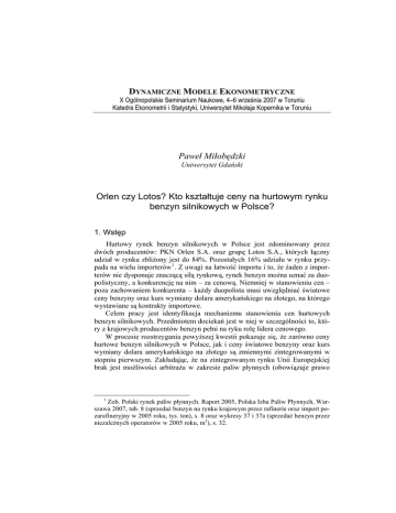 DYNAMICZNE MODELE EKONOMETRYCZNE X Ogólnopolskie Seminarium Naukowe, 4–6 września 2007 w Toruniu Katedra Ekonometrii i Statystyki, Uniwersytet Mikołaja Kopernika w Toruniu Paweł Miłobędzki Uniwersytet Gdański Orlen czy Lotos? Kto kształtuje ceny na hurtowym rynku benzyn silnikowych w Polsce? 1. Wstęp Hurtowy rynek benzyn silnikowych w Polsce jest zdominowany przez dwóch producentów: PKN Orlen S.A. oraz grupę Lotos S.A., których łączny udział w rynku zbliżony jest do 84%. Pozostałych 16% udziału w rynku przypada na wielu importerów 1 . Z uwagi na łatwość importu i to, że żaden z importerów nie dysponuje znaczącą siłą rynkową, rynek benzyn można uznać za duopolistyczny, a konkurencję na nim – za cenową. Niemniej w stanowieniu cen – poza zachowaniem konkurenta – każdy duopolista musi uwzględniać światowe ceny benzyny oraz kurs wymiany dolara amerykańskiego na złotego, na którego wystawiane są kontrakty importowe. Celem pracy jest identyfikacja mechanizmu stanowienia cen hurtowych benzyn silnikowych. Przedmiotem dociekań jest w niej w szczególności to, który z krajowych producentów benzyn pełni na ryku rolę lidera cenowego. W procesie rozstrzygania powyższej kwestii pokazuje się, że zarówno ceny hurtowe benzyn silnikowych w Polsce, jak i ceny światowe benzyny oraz kurs wymiany dolara amerykańskiego na złotego są zmiennymi zintegrowanymi w stopniu pierwszym. Zakładając, że na zintegrowanym rynku Unii Europejskiej brak jest możliwości arbitrażu w zakresie paliw płynnych (obowiązuje prawo 1 Zob. Polski rynek paliw płynnych. Raport 2005, Polska Izba Paliw Płynnych, Warszawa 2007, tab. 8 (sprzedaż benzyn na rynku krajowym przez rafinerie oraz import pozarafineryjny w 2005 roku, tys. ton), s. 8 oraz wykresy 37 i 37a (sprzedaż benzyn przez niezależnych operatorów w 2005 roku, m3), s. 32. 182 Paweł Miłobędzki jednej ceny), i że koszt sprowadzenia benzyn do Polski jest stacjonarny 2 , za podstawę identyfikacji mechanizmu stanowienia cen przyjmuje się wektorowy, trójwymiarowy model korekty błędem (VECM) 3 . W modelu tym zmiennymi endogenicznymi są hurtowe ceny benzyny produkowanej przez Orlen i Lotos oraz światowa cena benzyny, a zmienną egzogeniczną – kurs wymiany dolara amerykańskiego na złotego. W procesie jego budowy i weryfikacji stosuje się procedurę Johansena 4 , a szacuje się go na podstawie dziennych szeregów cen hurtowych benzyny bezołowiowej 95-oktanowej produkowanej przez Orlen i Lotos, ceny natychmiastowej FOB tej benzyny w Rotterdamie (ARA) oraz kursu sprzedaży dolara USA w Narodowym Banku Polskim z okresu 5 styczeń 2004-26 styczeń 2007 5 . Do obliczeń używa się pakietu Microfit 4.0. Przeprowadzone badanie prowadzi do ogólnego wniosku, że ceny krajowe i cena światowa benzyny bezołowiowej 95-oktanowej wykazują wspólny wzorzec zmienności stochastycznej. Stwierdza się występowanie 2 wektorów kointegrujących, które wyznaczają relacje równowagi długookresowej pomiędzy cenami krajowymi oraz jedną z cen krajowych a ceną światową. Na odchylenia od pierwszej relacji w krótkim okresie reaguje tylko cena Orlenu; na odchylenia od drugiej relacji – reagują ceny obu producentów. Impulsy cenowe przebiegają od ceny światowej do cen krajowych oraz od kursu wymiany waluty amerykańskiej na złotego do cen krajowych. Zależności ceny światowej od cen krajowych oraz wzajemnych interakcji cen krajowych nie obserwuje się. Ceny obu producentów nie są uwarunkowane ich własnymi cenami z przeszłości. Na podstawie powyższych stwierdzeń można wnosić, że tylko PKN Orlen S.A. w aktywny sposób kształtuje ceny benzyny bezołowiowej 95-oktanowej i jest liderem cenowym na jej krajowym rynku hurtowym. Grupa Lotos S.A. dostosowuje swoją cenę benzyny wyłącznie do ceny światowej i pod wpływem zmiany kursu dolara amerykańskiego. Pozostała część pracy zorganizowana jest w 2 oddzielne części. Pierwsza poświęcona jest identyfikacji mechanizmu stanowienia hurtowych cen benzyny w Polsce. Najpierw przedstawia się w niej własności szeregów czasowych zmiennych wykorzystanych w badaniu, a następnie wyniki estymacji modelu VECM oraz wnioskowania w zakresie struktury przyczynowości cen benzyny bezołowiowej 95-oktanowej. Całość kończą syntetyczne wnioski. 2 Na koszt sprowadzenia benzyny na rynek krajowy prócz ceny światowej składa się m.in. koszt transportu, kurs wymiany dolara USA na złotego, akcyza oraz opłata paliwowa. 3 Por. Brenner, Kroner (1995). 4 Zob. Johansen (1988), (1991). 5 Ceny hurtowe benzyny bezołowiowej 95-oktanowej uzyskano z portali internetowych producentów, cenę natychmiastową FOB tej benzyny w Rotterdamie (ARA) – z portalu internetowego U.S. Department of Energy, Energy Information Administration, a kurs sprzedaży dolara USA – z portalu internetowego NBP. Orlen czy Lotos? Kto kształtuje ceny … 183 2. Identyfikacja mechanizmu stanowienia hurtowych cen benzyny Szeregi czasowe zmiennych wykorzystanych w badaniu empirycznym są szeregami zintegrowanymi w stopniu pierwszym, o czym zaświadczają próbkowe wartości statystyk ADFmax Leybourne’a oraz KPSS zestawione w tabeli 1 6 . Z kolei wzrokowa analiza rys. 1, na którym przedstawiono kształtowanie się dziennych cen hurtowych benzyny bezołowiowej 95-oktanowej, produkowanej przez obu producentów, oraz jej ceny natychmiastowej FOB w Rotterdamie sugerują, że wykazują one wspólny wzorzec zmienności stochastycznej 7 . Powyższe przypuszczenie znajduje wsparcie teoretyczne w braku możliwości arbitrażu na hurtowym rynku benzyn silnikowych. Jeśli jest prawdziwe, ceny producentów na rynku krajowym winny pozostawać w relacji równowagi długookresowej, p1t = p2t ( i = 1 dla Orlenu oraz i = 2 dla Lotosu), a jedna z nich w relacji równowagi długookresowej z ceną zagraniczną (w Rotterdamie), pit = p3t + xt , gdzie: p3t – zagraniczna cena benzyny, xt – kurs wymiany dol
