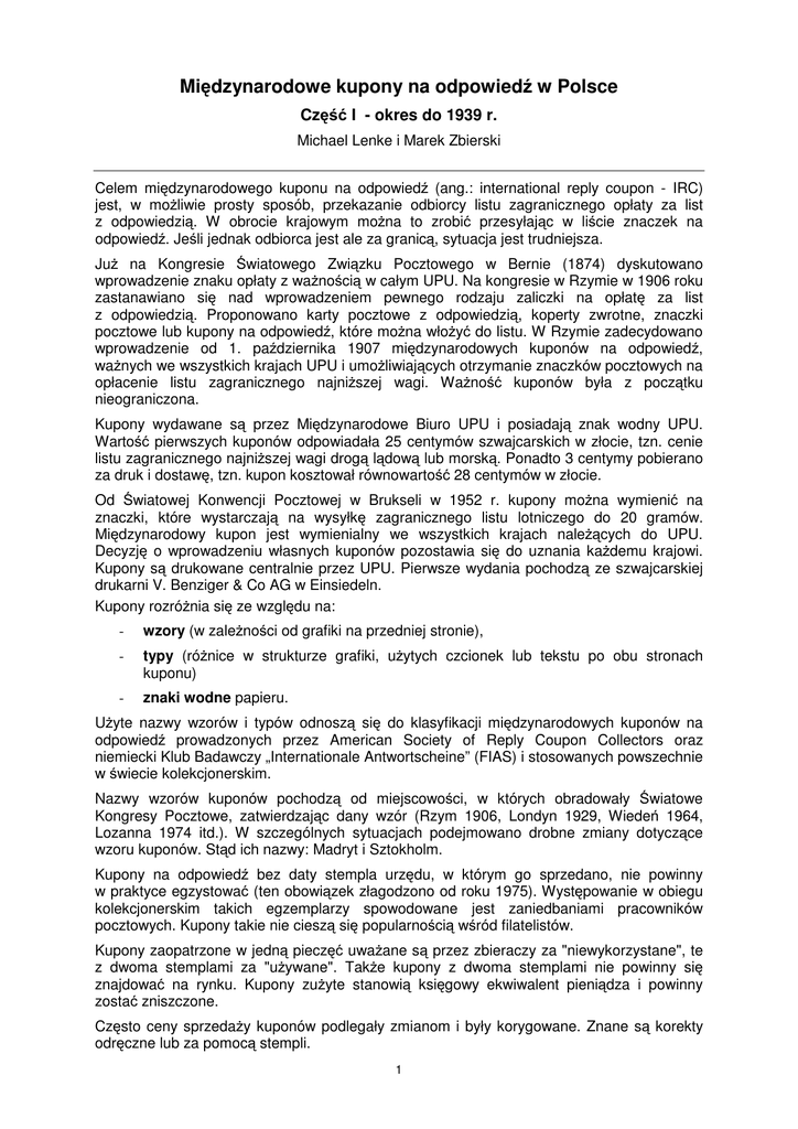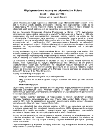 Międzynarodowe kupony na odpowiedź w Polsce Część I - okres do 1939 r. Michael Lenke i Marek Zbierski Celem międzynarodowego kuponu na odpowiedź (ang.: international reply coupon - IRC) jest, w możliwie prosty sposób, przekazanie odbiorcy listu zagranicznego opłaty za list z odpowiedzią. W obrocie krajowym można to zrobić przesyłając w liście znaczek na odpowiedź. Jeśli jednak odbiorca jest ale za granicą, sytuacja jest trudniejsza. Już na Kongresie Światowego Związku Pocztowego w Bernie (1874) dyskutowano wprowadzenie znaku opłaty z ważnością w całym UPU. Na kongresie w Rzymie w 1906 roku zastanawiano się nad wprowadzeniem pewnego rodzaju zaliczki na opłatę za list z odpowiedzią. Proponowano karty pocztowe z odpowiedzią, koperty zwrotne, znaczki pocztowe lub kupony na odpowiedź, które można włożyć do listu. W Rzymie zadecydowano wprowadzenie od 1. października 1907 międzynarodowych kuponów na odpowiedź, ważnych we wszystkich krajach UPU i umożliwiających otrzymanie znaczków pocztowych na opłacenie listu zagranicznego najniższej wagi. Ważność kuponów była z początku nieograniczona. Kupony wydawane są przez Międzynarodowe Biuro UPU i posiadają znak wodny UPU. Wartość pierwszych kuponów odpowiadała 25 centymów szwajcarskich w złocie, tzn. cenie listu zagranicznego najniższej wagi drogą lądową lub morską. Ponadto 3 centymy pobierano za druk i dostawę, tzn. kupon kosztował równowartość 28 centymów w złocie. Od Światowej Konwencji Pocztowej w Brukseli w 1952 r. kupony można wymienić na znaczki, które wystarczają na wysyłkę zagranicznego listu lotniczego do 20 gramów. Międzynarodowy kupon jest wymienialny we wszystkich krajach należących do UPU. Decyzję o wprowadzeniu własnych kuponów pozostawia się do uznania każdemu krajowi. Kupony są drukowane centralnie przez UPU. Pierwsze wydania pochodzą ze szwajcarskiej drukarni V. Benziger & Co AG w Einsiedeln. Kupony rozróżnia się ze względu na: - wzory (w zależności od grafiki na przedniej stronie), - typy (różnice w strukturze grafiki, użytych czcionek lub tekstu po obu stronach kuponu) - znaki wodne papieru. Użyte nazwy wzorów i typów odnoszą się do klasyfikacji międzynarodowych kuponów na odpowiedź prowadzonych przez American Society of Reply Coupon Collectors oraz niemiecki Klub Badawczy „Internationale Antwortscheine” (FIAS) i stosowanych powszechnie w świecie kolekcjonerskim. Nazwy wzorów kuponów pochodzą od miejscowości, w których obradowały Światowe Kongresy Pocztowe, zatwierdzając dany wzór (Rzym 1906, Londyn 1929, Wiedeń 1964, Lozanna 1974 itd.). W szczególnych sytuacjach podejmowano drobne zmiany dotyczące wzoru kuponów. Stąd ich nazwy: Madryt i Sztokholm. Kupony na odpowiedź bez daty stempla urzędu, w którym go sprzedano, nie powinny w praktyce egzystować (ten obowiązek złagodzono od roku 1975). Występowanie w obiegu kolekcjonerskim takich egzemplarzy spowodowane jest zaniedbaniami pracowników pocztowych. Kupony takie nie cieszą się popularnością wśród filatelistów. Kupony zaopatrzone w jedną pieczęć uważane są przez zbieraczy za "niewykorzystane", te z dwoma stemplami za "używane". Także kupony z dwoma stemplami nie powinny się znajdować na rynku. Kupony zużyte stanowią księgowy ekwiwalent pieniądza i powinny zostać zniszczone. Często ceny sprzedaży kuponów podlegały zmianom i były korygowane. Znane są korekty odręczne lub za pomocą stempli. 1 W opracowaniu wykorzystano udokumentowane informacje znane z literatury światowej (głównie archiwum FIAS) oraz fotokopie z kolekcji autorów. Skróty używane w katalogach do oznaczania sposobu korekt cen sprzedaży kuponów: SS = stempel metalowy (występuje rzadko) RS/GS = stempel gumowy (rubber stamp) MS = ręcznie (manuscript) twr = za pomocą maszyny do pisania (typewriter) Dane dot. miejscowości i dat stempli pocztowych zaczerpnięto z literatury, posiadanych egzemplarzy oraz dokumentacji prowadzonej przez archiwum FIAS. Przykład kuponu Typ Rom II (wydanie dla Belgii), 23.1.1908 Kupon dla krajów Commonwealthu - Typ „Imperial“ (wydanie dla Somalilandu), 25.1.1960 2 Kupon dla krajów Commonwealthu - Typ „Commonwealth“ (wydanie dla Ceylonu), 16.9.1968 Wydanie dla krajów Arabskiego Związku Pocztowego „UPA“, 23.4.1959 3 Znane kupony z okresu okupacji niemieckiej w pierwszej wojnie światowej - GG Warschau 1916-1918 (prekursory polskich kuponów na odpowiedź) Typ Ro IV Ro IV Cena sprzedaży 25 Pfennig 25 Pfennig Korekta ceny sprzedaży bez korekty 30 Pf. (MS) Ro IV 25 Pfennig 40 Pf. (MS) Znane użycia kuponów Warschau 31.3.1916 Lodz 13.5.1916, Warschau 25.8.1916 Warschau 2.9.1918 Znane kupony austriackie 1916-1918 (prekursory polskich kuponów na odpowiedź) Typ Ro IV Ro IV Ro IV Ro IV Cena sprzedaży 33 heller 33 heller 33 heller 33 heller Korekta ceny sprzedaży bez korekty 38 heller (RS) 38/52 heller (RS) 38/52/50 heller Znane użycia kuponów Krakau 9.5.1916 Kraków 3.1.1919 Sanok 22.10.1917 Jasło 12.12.1917 Bardzo rzadki prekursor polskich kuponów - austriacki kupon typu Rom IV o wartości 33 Heller, skorygowanej stemplem gumowym na 38 Heller. Kupon sprzedany 3.1.1919 r. przez polski urząd pocztowy w Krakowie (foto dzięki uprzejmości prof. J. Auleytnera). Międzynarodowe kupony na odpowiedź pojawiają się po raz pierwszy na terenach polskich w czasie I wojny światowej, jako kupony poczt państw okupujących (kupony niemieckie i austriackie). Są one traktowane przez kolekcjonerów jako prekursory polskich kuponów. Z historycznego punktu widzenia o prekursorach możemy mówić od momentu przejęcia przez administrację polską władzy na tych terenach. Wymiana zagranicznych kuponów na odpowiedź na polskie znaczki pocztowe wprowadzona została od 10. czerwca 1922 r. (Dz. Urz. MPiT nr 24/1922). Za 1 kupon o wartości 50 centimes (lub 2 „stare” kupony po 25 centimes) otrzymać można było znaczki 