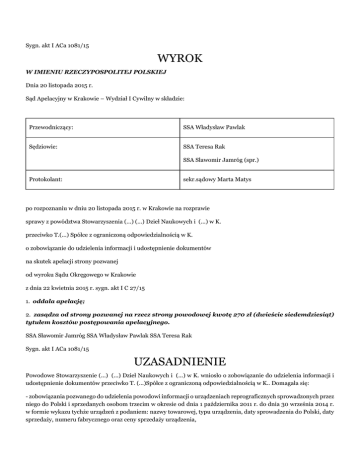 Sygn. akt I ACa 1081/15 WYROK W IMIENIU RZECZYPOSPOLITEJ POLSKIEJ Dnia 20 listopada 2015 r. Sąd Apelacyjny w Krakowie – Wydział I Cywilny w składzie: Przewodniczący: SSA Władysław Pawlak Sędziowie: SSA Teresa Rak SSA Sławomir Jamróg (spr.) Protokolant: sekr.sądowy Marta Matys po rozpoznaniu w dniu 20 listopada 2015 r. w Krakowie na rozprawie sprawy z powództwa Stowarzyszenia (...) (...) Dzieł Naukowych i (...) w K. przeciwko T.(...) Spółce z ograniczoną odpowiedzialnością w K. o zobowiązanie do udzielenia informacji i udostępnienie dokumentów na skutek apelacji strony pozwanej od wyroku Sądu Okręgowego w Krakowie z dnia 22 kwietnia 2015 r. sygn. akt I C 27/15 1. oddala apelację; 2. zasądza od strony pozwanej na rzecz strony powodowej kwotę 270 zł (dwieście siedemdziesiąt) tytułem kosztów postępowania apelacyjnego. SSA Sławomir Jamróg SSA Władysław Pawlak SSA Teresa Rak Sygn. akt I ACa 1081/15 UZASADNIENIE Powodowe Stowarzyszenie (...) (...) Dzieł Naukowych i (...) w K. wniosło o zobowiązanie do udzielenia informacji i udostępnienie dokumentów przeciwko T. (...)Spółce z ograniczoną odpowiedzialnością w K.. Domagała się: - zobowiązania pozwanego do udzielenia powodowi informacji o urządzeniach reprograficznych sprowadzonych przez niego do Polski i sprzedanych osobom trzecim w okresie od dnia 1 października 2011 r. do dnia 30 września 2014 r. w formie wykazu tychże urządzeń z podaniem: nazwy towarowej, typu urządzenia, daty sprowadzenia do Polski, daty sprzedaży, numeru fabrycznego oraz ceny sprzedaży urządzenia, - zobowiązania pozwanego do udzielenia powodowi informacji o papierze formatu(...)sprowadzonym przez niego do Polski i sprzedanym osobom trzecim w okresie od dnia 1 stycznia 2011 r. do dnia 30 września 2014 r. w formie wykazy obejmującego: nazwę towarową, format, datę sprowadzenia do Polski, datę sprzedaży oraz cenę sprzedaży papieru, - zobowiązania pozwanego do udostępnienia powodowi dokumentów w postaci: deklaracji (...) i Jednolitych Dokumentów Administracyjnych (...) oraz faktur za okres od 1 stycznia 2011 r. do dnia 30 września 2014 r. potwierdzających odpowiednio fakt sprowadzenia do kraju oraz sprzedaży urządzeń reprograficznych oraz papieru formatu(...) - zasądzenia od pozwanego na rzecz powoda kosztów postępowania, w tym kosztów zastępstwa prawnego wedle norm przepisanych. W uzasadnieniu pozwu strona powodowa podała że jest organizacją zbiorowego zarządzania prawami autorskimi w rozumieniu art. 104 Prawa autorskiego. Na mocy art. 20 ust. 1 pkt 2 Prawa autorskiego na producentach i importerach kserokopiarek, skanerów i innych podobnych urządzeń reprograficznych umożliwiających pozyskiwanie kopii całości lub części egzemplarza opublikowanego utworu oraz związanych z nimi czystych nośników ( papieru formatu (...)), ciąży obowiązek wnoszenia opłaty – opłata reprograficzna. Wskazała, że podstawą żądania jest art. 105 ust. 2 prawa autorskiego oraz § 6 ust. 1 Rozporządzenia Ministra Kultury z dnia 2 czerwca 2003 r. Informacje oraz dokumenty w zakresie żądań dotyczących udzielenia informacji są konieczne do określenia przez powoda wysokości opłaty reprograficznej. W odpowiedzi na pozew pozwana T.(...) Spółka z ograniczoną odpowiedzialnością w K. wniosła o oddalenie powództwa w całości oraz zasądzenie od strony powodowej na rzecz strony pozwanej kosztów postępowania, w tym kosztów zastępstwa procesowego według norm przepisanych. Pozwana zarzuciła, iż nie jest podmiotem obowiązanym do uiszczania opłat reprograficznych. Strona pozwana nie jest producentem, a także nie jest importerem. O imporcie towarów można mówić jedynie w przypadku sprowadzenia produktów spoza obszaru celnego UE, co w niniejszej sprawie nie miało miejsca. Pozwana zaś wprowadza na teren Polski towary z obszaru Unii Europejskiej. Jednakże wobec przystąpienia Polski do Unii Europejskiej za importera może być uznany tylko podmiot który wprowadza na rynek polski towary spoza rynku wewnątrzwspólnotowego. Polska jest członkiem Unii Europejskiej, a przepisy unijne są częścią porządku prawnego, czego konsekwencją winno być jednolite odnoszenie pojęcia importu do zakupu towarów lub usług z krajów spoza Unii Europejskiej, podczas gdy zakup towarów w obrębie Unii Europejskiej nie powinien być uznany za import i stanowi zakup wewnątrzwspólnotowy. Dalej pozwana wskazała, że należy zastosować wykładnię pro unijną, która sprowadza się do tłumaczenia przepisów prawa krajowego w taki sposób, aby dały się pogodzić z przepisami unijnymi. Nadto pozwana podniosła, że organizacja jest zobowiązana wykazać, że żądanie informacyjne lub dokumenty są niezbędne do określenia dochodzonego w ramach tego zakresu opłat. Jako nieuzasadnione pozwany wskazał domaganie się przez powoda udostępnienia informacji o numerze fabrycznym towarów, dacie sprzedaży towarów, cenie sprzedaży towarów, oraz przekazania faktur potwierdzających sprzedaż towarów. Zakres informacji objętych pozwem pozostaje w wyraźnej sprzeczności z zasadą proporcjonalności. Pozwana zakwestionowała, aby uprawnione było żądanie udzielenia informacji w formie wykazu, gdyż nie znajduje oparcia w przepisach prawa materialnego. Strona pozwana podniosła także zarzut przedawnienia roszczeń w zakresie opłaty reprograficznej za okres od 1 października do 30 grudnia 2011 r. Zdaniem pozwanej dochodzenie przez stronę powodową opłat reprograficznych należy kwalifikować jako prowadzenie przez stronę powodową działalności gospodarczej. Ze Statutu powoda wynika, iż majątek strony powodowej stanowią również dochody z własnej działalności gospodarczej. Jej zdaniem roszczenie podlega 3-letniemu terminowi przedawnienia na podstawie art. 118 k.c. Wyrokiem z dnia 22 kwietnia 2015r. sygn.. akt I C 27/15 Sąd Okręgowy w Krakowie zobowiązał stronę pozwaną do udzielen