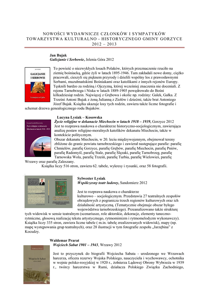 NOWOŚC I WYDAWNICZE C ZŁONKÓW I SYMPATYKÓW TOWARZYSTWA KULTURALNO - HISTORYCZNEGO GMINY GORZYCE 2012 – 2013 Jan Bujak Galicjanie i Serbowie, Jelenia Góra 2012 To powieść o niezwykłych losach Polaków, których przeznaczenie rzuciło na ziemię bośniacką, gdzie żyli w latach 1895-1946. Tam zakładali nowe domy, ciężko pracowali, cieszyli się pięknem przyrody i dzielili wspólny los z prawosławnymi Serbami, muzułmańskimi Bośniakami oraz katolikami z innych rejonów Europy. Tęsknili bardzo za rodziną i Ojczyzną, której wcześniej znaczenia nie doceniali. Z rejonu Tarnobrzega i Niska w latach 1889-1905 powędrowało do Bośni kilkadziesiąt rodzin. Najwięcej z Grębowa i okolic np. rodziny: Galek, Gałka. Z Trześni Antoni Bujak z żoną Julianną z Ziołów i dziećmi, także brat Antoniego Józef Bujak. Książka ukazuje losy tych rodzin, zawiera także liczne fotografie i schemat drzewa genealogicznego rodu Bujaków. Lucyna Łysiak – Kosowska Życie religijne w dekanacie Miechocin w latach 1918 – 1939, Gorzyce 2012 Jest to rozprawa naukowa o charakterze historyczno-socjologicznym, zawierająca analizę postaw religijno-moralnych katolików dekanatu Miechocin, także w kontekście politycznym. Obszar dekanatu Miechocin, w 20. leciu międzywojennym, obejmował tereny zbliżone do granic powiatu tarnobrzeskiego i zawierał następujące parafie: parafię Chmielów, parafię Gorzyce, parafię Grębów, parafię Miechocin, parafię Pniów, parafię Radomyśl, parafię Stale, parafię Ślęzaki, parafię Tarnobrzeg, parafię Tarnowska Wola, parafię Trześń, parafię Turbia, parafię Wielowieś, parafię Wrzawy oraz parafię Zaleszany. Książka liczy 516 stron, zawiera 62. tabele, wykresy i rysunki, oraz 58 fotografii. Sylwester Łysiak Współczesny teatr ludowy, Sandomierz 2012 Jest to rozprawa naukowa o charakterze kulturowo – socjologicznym. Przedstawia 27 teatralnych zespołów obrzędowych z pogranicza trzech regionów kulturowych oraz ich działalność artystyczną. (Tematycznie obejmuje obszar byłego województwa tarnobrzeskiego). Przeanalizowano także strukturę tych widowisk w sensie teatralnym (scenariusze, role aktorskie, dekoracje, elementy tanecznorytmiczne, głosową realizację tekstu artystycznego, rytmomimizm i rytmomelodyzm wykonawczy). Książka liczy 335 stron, zawiera liczne tabele ( m.in. tabelę zrealizowanych widowisk), mapy (np. mapę występowania grup teatralnych), oraz 28 ilustracji w tym fotografie zespołu „Jarzębina” z Kocudzy. Waldemar Prarat Wojciech Sabat 1901 – 1943, Wrzawy 2012 Jest to przyczynek do biografii Wojciecha Sabata - urodzonego we Wrzawach harcerza, oficera rezerwy Wojska Polskiego, nauczyciela i wychowawcy, ochotnika w wojnie polsko-rosyjskiej w 1920 r., żołnierza Lądowej Obrony Wybrzeża w 1939 r., twórcy harcerstwa w Rumi, działacza Polskiego Związku Zachodniego, Towarzystwa Powstańców i Wojaków oraz Związku Nauczycielstwa Polskiego. Praca liczy 79 stron oraz 49 zdjęć. Waldemar Prarat Straty wojenne wsi Wrzawy w latach 1939 – 1945, Wrzawy 2012 Publikacja jest wyborem dokumentów archiwalnych ukazujących zniszczenia wojenne w latach 1939 – 1945 na terenie wsi Wrzawy. Zawiera imienny wykaz około 250 gospodarstw rolnych wraz z poniesionymi szkodami materialnymi i niematerialnymi, przedstawia także szacunkową wielkość poniesionych strat wg cen z 1 września 1939 r. Książka liczy 151 stron, opatrzona jest indeksem osobowym. Waldemar Prarat Z dziejów regionu nad dolnym Sanem i Łęgiem, Wrzawy 2012 W książce dominują dwa zasadnicze wątki tematyczne: regulacje wodne na Wiśle, Sanie, Łęgu i Trześniówce na przełomie wieków XIX i XX, oraz I wojna światowa na obszarze ówczesnego powiatu tarnobrzeskiego. Nieuregulowane dolne odcinki Łęgu i Trześniówki, oraz brak obwałowań na dolnym Sanie i granicznym odcinku Wisły w powiecie tarnobrzeskim, były przyczyną wielu katastrof powodziowych na przestrzeni minionych wieków. Dopiero po tragicznych wylewach w latach 80. XIX wieku Sejm krajowy w Galicji podjął decyzję kompleksowym uregulowaniu wspomnianych rzek oraz uzupełnieniu obwałowań. Książka liczy 286 stron, mapy oraz tabele. Emilia Szczygieł Moja ścieżka pośród pól, Wrzawy 2012 Jest to tomik wierszy zmarłej w grudniu 2011 r. roku poetki oraz aktywnej uczestniczki Towarzystwa Kulturalno – Historycznego Gminy Gorzyce, mieszkanki Wrzaw, Emilii Szczygieł. Tomik zawiera kilkadziesiąt wierszy Autorki o różnorodnej tematyce, powstałych w różnych okresach Jej życia. Leopold Wydra Tęcza nad Gorzycami, Gorzyce 2011 Leopold Wydra - urodził się 25 lutego 1932 roku w Gorzycach gdzie pokolenie Wydrów zamieszkiwało od kilku stuleci. Pisanie towarzyszyło mu od najmłodszych lat, już w szkole podstawowej powstawały pierwsze wiersze. W dwóch wydanych tomikach zebrał swoje przemyślenia na temat życia, trosk, smutków rozpaczy i radości z życia, ale także refleksje z przeżytych doznań, wzruszeń i uczuć. Drugi tomik wierszy Tęcza nad Gorzycami poświęcony jest historii powstania Uniwersytetu Trzeciego Wieku w Gorzycach. Zawiera także piosenki ludowe oraz humory żydowskie.
