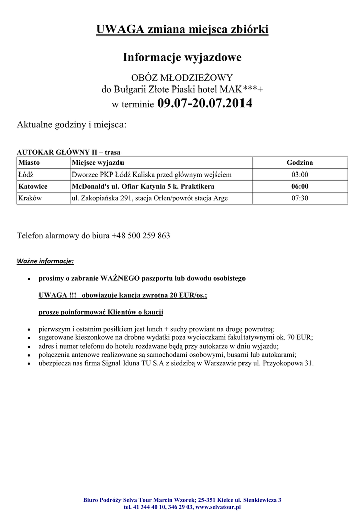 UWAGA zmiana miejsca zbiórki Informacje wyjazdowe OBÓZ MŁODZIEŻOWY do Bułgarii Złote Piaski hotel MAK***+ w terminie 09.07-20.07.2014 Aktualne godziny i miejsca: AUTOKAR GŁÓWNY II – trasa Miasto Miejsce wyjazdu Godzina Łódź Dworzec PKP Łódź Kaliska przed głównym wejściem 03:00 Katowice McDonald's ul. Ofiar Katynia 5 k. Praktikera 06:00 Kraków ul. Zakopiańska 291, stacja Orlen/powrót stacja Arge 07:30 Telefon alarmowy do biura +48 500 259 863 Ważne informacje: prosimy o zabranie WAŻNEGO paszportu lub dowodu osobistego UWAGA !!! obowiązuje kaucja zwrotna 20 EUR/os.; proszę poinformować Klientów o kaucji pierwszym i ostatnim posiłkiem jest lunch + suchy prowiant na drogę powrotną; sugerowane kieszonkowe na drobne wydatki poza wycieczkami fakultatywnymi ok. 70 EUR; adres i numer telefonu do hotelu rozdawane będą przy autokarze w dniu wyjazdu; połączenia antenowe realizowane są samochodami osobowymi, busami lub autokarami; ubezpiecza nas firma Signal Iduna TU S.A z siedzibą w Warszawie przy ul. Przyokopowa 31. Biuro Podróży Selva Tour Marcin Wzorek; 25-351 Kielce ul. Sienkiewicza 3 tel. 41 344 40 10, 346 29 03, www.selvatour.pl