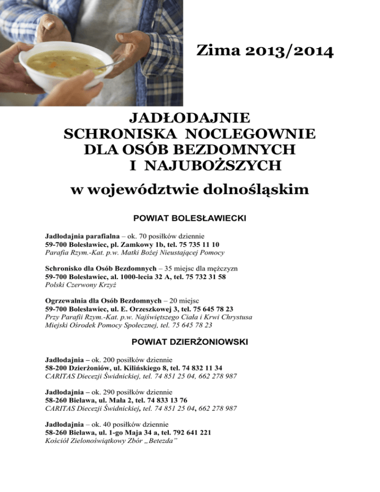 Zima 2013/2014 JADŁODAJNIE SCHRONISKA NOCLEGOWNIE DLA OSÓB BEZDOMNYCH I NAJUBOŻSZYCH w województwie dolnośląskim POWIAT BOLESŁAWIECKI Jadłodajnia parafialna – ok. 70 posiłków dziennie 59-700 Bolesławiec, pl. Zamkowy 1b, tel. 75 735 11 10 Parafia Rzym.-Kat. p.w. Matki Bożej Nieustającej Pomocy Schronisko dla Osób Bezdomnych – 35 miejsc dla mężczyzn 59-700 Bolesławiec, al. 1000-lecia 32 A, tel. 75 732 31 58 Polski Czerwony Krzyż Ogrzewalnia dla Osób Bezdomnych – 20 miejsc 59-700 Bolesławiec, ul. E. Orzeszkowej 3, tel. 75 645 78 23 Przy Parafii Rzym.-Kat. p.w. Najświętszego Ciała i Krwi Chrystusa Miejski Ośrodek Pomocy Społecznej, tel. 75 645 78 23 POWIAT DZIERŻONIOWSKI Jadłodajnia – ok. 200 posiłków dziennie 58-200 Dzierżoniów, ul. Kilińskiego 8, tel. 74 832 11 34 CARITAS Diecezji Świdnickiej, tel. 74 851 25 04, 662 278 987 Jadłodajnia – ok. 290 posiłków dziennie 58-260 Bielawa, ul. Mała 2, tel. 74 833 13 76 CARITAS Diecezji Świdnickiej, tel. 74 851 25 04, 662 278 987 Jadłodajnia – ok. 40 posiłków dziennie 58-260 Bielawa, ul. 1-go Maja 34 a, tel. 792 641 221 Kościół Zielonoświątkowy Zbór „Betezda” Jadłodajnia – ok. 25 posiłków dziennie (skierowanie OPS) 58-260 Piława Górna, ul. Limanowskiego 3 (świetlica OSP) Ośrodek Pomocy Społecznej, tel. 74 837 14 25 Jadłodajnia (w Restauracji „Wars”) – 60 posiłków dziennie (skierowanie OPS) 58-250 Pieszyce, ul. Bielawska 4 Ośrodek Pomocy Społecznej, tel. 74 836 52 45 POWIAT GŁOGOWSKI Kuchnia Brata Alberta – 200 posiłków dziennie 67-200 Głogów, pl. Kard. Wyszyńskiego 1, tel. 76 833 88 75 Parafia Rzym.-Kat. p.w. Najświętszej Maryi Panny Królowej Polski Dom Samotnej Matki z Dzieckiem – 50 miejsc dla matek z dziećmi, 10 dla bezdomnych kobiet 67-200 Głogów, ul. Folwarczna 50, tel. 76 833 35 00 MONAR - MARKOT Regionalne Centrum Pomocy Bliźniemu Noclegownia im. Brata Alberta – 6 miejsc (d. 2) (skierowanie MOPS) 67-200 Głogów, ul. Legnicka 3, tel. 76 727 47 05 Miejski Ośrodek Profilaktyki i Wczesnej Terapii Uzależnień Przytulisko dla najuboższych im. Św. Siostry Faustyny – 80 miejsc dla mężczyzn 67-231 Żukowice 139, tel. 76 831 43 88 Stowarzyszenie „Bractwo Jana Pawła II” przy Parafii Rzym.-Kat. p.w. Miłosierdzia Bożego w Głogowie POWIAT JAWORSKI Jadłodajnia ( Dzienny Ośrodek Wsparcia) – ok.. 100 posiłków dziennie (skierowanie MOPS) 59-400 Jawor, ul. Kwiatowa 15, tel. 76 729 87 97 Miejski Ośrodek Pomocy Społecznej JELENIA GÓRA miasto n.p.p. Jadłodajnia (Dzienny Dom Pomocy Społecznej) – 70 posiłków dziennie (skierowanie MOPS) 58-500 Jelenia Góra, ul. Kilińskiego 16, tel. 75 752 55 71 Miejski Ośrodek Pomocy Społecznej Schronisko dla Bezdomnych Mężczyzn – 65 miejsc Noclegownia – 25 miejsc dla mężczyzn 58-500 Jelenia Góra, ul. Grunwaldzka 51, tel. 75 752 61 22 Towarzystwo Pomocy im. Św. Brata Alberta Dom Brata Alberta – 45 miejsc dla mężczyzn (starszych i niepełnosprawnych) 58-500 Jelenia Góra, ul. Wolności 180, tel. 75 752 60 12 Towarzystwo Pomocy im. Św. Brata Alberta POWIAT KŁODZKI Jadłodajnia – ok. 140 posiłków dziennie (skierowanie MOPS) 57-300 Kłodzko, ul Łukasińskiego 57, tel. 74 867 68 03 Polski Komitet Pomocy Społecznej, tel. 74 867 22 94 Jadłodajnia – ok. 120 posiłków dziennie 57-400 Nowa Ruda, ul. Aleksandra Fredry 6 CARITAS Diecezji Świdnickie, tel. 74 851 25 04 Jadłodajnia (Bar KAKTUS) – ok. 50 posiłków dziennie (skierowanie OPS) 57-500 Bystrzyca Kłodzka, ul. Okrzei 2, tel. 74 811 03 02 Ośrodek Pomocy Społeczny, tel. 74 811 02 66 Noclegownia dla Mężczyzn – 20 miejsc 57-300 Kłodzko, ul Łukasińskiego 57, tel. 74 865 93 25 Polski Komitet Pomocy Społecznej, tel. 74 867 22 94 Noclegownia dla Mężczyzn – 10 miejsc 57-400 Nowa Ruda, ul. Zaułek 7-9/1 Miejski Ośrodek Pomocy Społecznej, tel. 74 872 10 56 POWIAT LEGNICKI Stołówka Charytatywna – ok. 50 posiłków dziennie 59-230 Prochowice, Rynek 16, tel. 76 858 44 56 Stowarzyszenie Rodzin Katolickich przy Parafii Rzym.-Kat. p.w. Św. Jana Chrzciciela LEGNICA miasto n.p.p. Międzyparafialna Stołówka Charytatywna Św. Jadwigi – 300 l zupy dziennie 59-220 Legnica, ul. Kamienna 15, tel. 76 854 92 31 Parafia Rzym.-Kat. p.w. Najświętszego Serca Pana Jezusa Noclegownia – 48 miejsc dla mężczyzn, 6 dla kobiet 59-220 Legnica, ul. Przemysłowa 5, tel. 76 722 18 20 Miejski Ośrodek Pomocy Społecznej Punkt Opieki nad Matką i Dzieckiem – 9 miejsc 59-220 Legnica, ul. Przemysłowa 5, tel. 76 722 18 20 Miejski Ośrodek Pomocy Społecznej Nocleg, posiłek, odzież - 4 miejsca dla mężczyzn 59-220 Legnica, ul. Jaworzyńska 153, tel. 76 850 62 40 Miejska Izba Wytrzeźwień POWIAT LUBAŃSKI Stołówka – 130 posiłków dziennie 59-830 Olszyna, ul. Legnicka 14a, tel. 75 721 23 41 Stowarzyszenie „Dar Serca” przy Parafii Rzym.-Kat. p.w. Św. Józefa Oblubieńca Dom dla Samotnych Matek – 39 miejsc dla kobiet z dziećmi (d.6) 59-814 Pobiedna, ul. Hetmańska 61, tel. 75 784 56 88 MONAR - MARKOT Regionalne Centrum Pomocy Bliźniemu Schronisko im. Św. Brata Alberta “Przystań” – 68 miejsc dla mężczyzn (d. 46) 59-820 Leśna, ul. Baworowo 18 F, tel. 75 721 15 30 Towarzystwo Interwencji Społecznych w Nysie POWIAT LUBIŃSKI Kuchnia dla Ubogich – 190 posiłków dziennie 59-300 Lubin, ul. Jana Pawła II 58, tel. 76 844 78 65 Parafia Rzym.-Kat. p.w. Św. Jana Bosko Dom Samotnych Matek z Dziećmi – 60 miejsc (d.5) 59- 330 Ścinawa, ul. Mickiewicza 38, tel. 76 843 67 25 MONAR - MARKOT Nadodrzańskie Centrum Pomocy Bliźniemu Ogrzewalnia - 20 miejsc dla mężczyzn 59-300 Lubin, ul. Parkowa 1, tel. 76 847 03 33 Towarzystwo Pomocy im Św. Brata Alberta Schronisko dla bezdomnych mężczyzn – 54 miejsca (d. 10) 59-300 Lubin, ul. Parkowa 1, tel. 76 847 03 33 Towarzystwo Pomocy im Św. Brata Alberta POWIAT MILICKI Jadłodajnia (w Specjalnym Ośrodku Szkolno-Wychowawczym) – ok.100 posiłków dziennie 56-300 Milicz, ul. 