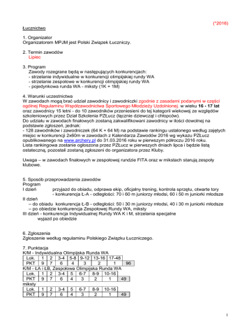 (*2016) Łucznictwo 1. Organizator Organizatorem MPJM jest Polski Związek Łuczniczy. 2. Termin zawodów Lipiec 3. Program Zawody rozegrane będą w następujących konkurencjach: - strzelanie indywidualne w konkurencji olimpijskiej rundy WA - strzelanie zespołowe w konkurencji olimpijskiej rundy WA - pojedynkowa runda WA - miksty (1K + 1M) 4. Warunki uczestnictwa W zawodach mogą brać udział zawodnicy i zawodniczki zgodnie z zasadami podanymi w części ogólnej Regulaminu Współzawodnictwa Sportowego Młodzieży Uzdolnionej. w wieku 16 - 17 lat oraz zawodnicy 15 letni - do 10 zawodników przeniesieni do tej kategorii wiekowej ze względów szkoleniowych przez Dział Szkolenia PZŁucz (łącznie dziewcząt i chłopców). Do udziału w zawodach finałowych zostaną zakwalifikowani zawodnicy w ilości dowolnej na podstawie zgłoszeń, jednak: - 128 zawodników i zawodniczek (64 K + 64 M) na podstawie rankingu ustalonego według zajętych miejsc w konkurencji 2x60m w zawodach z Kalendarza Zawodów 2016 wg wykazu PZŁucz opublikowanego na www.archery.pl do 31.03.2016 roku w pierwszym półroczu 2016 roku. Lista rankingowa zostanie ogłoszona przez PZŁucz w pierwszych dniach lipca i będzie listą ostateczną, pozostali zostaną zgłoszeni do organizatora przez Kluby. Uwaga – w zawodach finałowych w zespołowej rundzie FITA oraz w mikstach starują zespoły klubowe. 5. Sposób przeprowadzenia zawodów Program I dzień przyjazd do obiadu, odprawa ekip, oficjalny trening, kontrola sprzętu, otwarte tory - konkurencja Ł-A - odległości: 70 i 60 m juniorzy młodsi, 60 i 50 m juniorki młodsze II dzień – do obiadu konkurencja Ł-B - odległości: 50 i 30 m juniorzy młodsi, 40 i 30 m juniorki młodsze – po obiedzie konkurencja Zespołowej Rundy WA, miksty III dzień - konkurencja Indywidualnej Rundy WA K i M, strzelania specjalne wyjazd po obiedzie 6. Zgłoszenia Zgłoszenie według regulaminu Polskiego Związku Łuczniczego. 7. Punktacja K/M - Indywidualna Olimpijska Runda WA Lok. 1 2 3-4 5-8 9-12 13-16 17-48 PKT 9 7 6 4 3 2 1 96 K/M - ŁA i ŁB, Zespołowa Olimpijska Runda WA Lok. 1 2 3-4 5 6-7 8-9 10-16 PKT 9 7 6 4 3 2 1 49 miksty Lok. 1 2 3-4 5 6-7 8-9 10-16 PKT 9 7 6 4 3 2 1 49 1 D. System ocen Łucznictwo I. Młodzieżowe Mistrzostwa Polski K/M – 21-23 lata 1. Program K/M – Indywidualna Olimpijska Runda WA, Zespołowa Olimpijska Runda WA, miksty 2. Punktacja K/M – Indywidualna Olimpijska Runda WA Lok. 1 2 3-4 5 6-7 8-9 10-16 PKT 25 21 17 14 12 10 8 194 K/M - Zespołowa Olimpijska Runda WA, miksty Lok. 1 2 3-4 5 6 7 8-12 PKT 25 21 17 14 12 10 8 156 Miksty Lok. 1 2 3-4 5 6 7 8-12 PKT 25 21 17 14 12 10 8 156 II. Mistrzostwa Polski Juniorów K/M – 18-20 lat 1. Program K/M – Indywidualna Olimpijska Runda WA, Zespołowa Olimpijska Runda WA, miksty 2. Punktacja K/M – Indywidualna Olimpijska Runda WA O.R.FITA Lok. 1 2 3-4 5 6 7 8 9 10-11 12-16 17-24 PKT 15 12 10 8 7 6 5 4 3 2 1 101 K/M - ŁAB, Zespołowa Olimpijska Runda WA Lok. 1 2 3-4 5 6 7 8-12 13-16 PKT 15 12 9 6 4 3 2 1 72 Miksty Lok. 1 2 3-4 5 6 7 8-12 13-16 PKT 15 12 9 6 4 3 2 1 72 III. Olimpiada Młodzieży – Mistrzostwa Polski Juniorów młodszych K/M – 16-17 lat 1. Program K/M – Indywidualna Olimpijska Runda WA, Zespołowa Olimpijska Runda WA, ŁA, ŁB, miksty 2. Punktacja K/M – Indywidualna Olimpijska Runda WA Lok. 1 2 3-4 5-8 9-12 13-16 17-48 PKT 9 7 6 4 3 2 1 96 K/M - ŁA i ŁB, Zespołowa Olimpijska Runda WA Lok. 1 2 3-4 5 6-7 8-9 10-16 PKT 9 7 6 4 3 2 1 49 Miksty Lok. 1 2 3-4 5 6-7 8-9 10-16 PKT 9 7 6 4 3 2 1 49 2 IV. Międzywojewódzkie Mistrzostwa Młodzików K/M – 13-15 lat 1.Program 15 lat K/M – indywidualnie wielobój ŁB (50+30), zespołowo (3 zawodników) 3 x ŁB 2. Punktacja wielobój Lok. 1 2-6 7-12 PKT 3 2 1 19 zespołowo Lok. 1 2-4 5-8 PKT 3 2 1 13 13-14 lat K/M – indywidualnie wielobój ŁB (40+20), zespołowo (3 zawodników) 3 x ŁB, 2. Punktacja wielobój Lok. 1 2-6 7-24 PKT 3 2 1 31 zespołowo Lok. 1 2-6 7-12 PKT 3 2 1 19 Strefy A – ZPM, POM, KPM B – MAZ, WM, LUB, PDL C – DŚL, LBU, WLP D – ŁDZ, ŚWI E – ŚL, OPO F – MŁP, PKR 2014 KPM MAZ DŚL ŚWI ŚL MŁP 2015 KPM MAZ DŚL ŚWI ŚL MŁP 2016 POM PDL DŚL ŁDZ ŚL PKR 2017 KPM LUB DŚL ŚWI ŚL MŁP 2018 Uwaga: – w konkurencji zespołowej w kategorii młodzik dopuszcza się możliwość startu zespołów klubowych oraz zespołów złożonych z zawodników reprezentujących różne kluby z terenu tego samego województwa, taki zespół będzie traktowany jako reprezentacja województwa. – w konkurencji zespołowej oraz w mikstach w kategorii junior młodszy, junior i młodzieżowiec startują tylko zespoły klubowe. E. Roczniki młodzieżowcy juniorzy juniorzy młodsi młodzicy 21-23 lata (w 2016 roku urodzeni 01.01.1993 – 31.12.1995) 18-20 lat (w 2016 roku urodzeni 01.01.1996 – 31.12.1998) 16-17 lat (w 2016 roku urodzeni 01.01.1999 – 31.12.2000) 13-15 lat (w 2016 roku urodzeni 01.01.2001 – 31.12.2003) ZSM IS 3