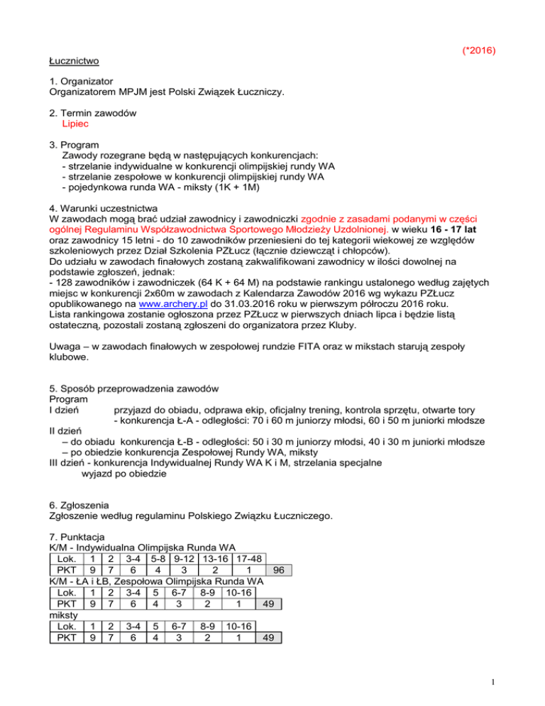 (*2016) Łucznictwo 1. Organizator Organizatorem MPJM jest Polski