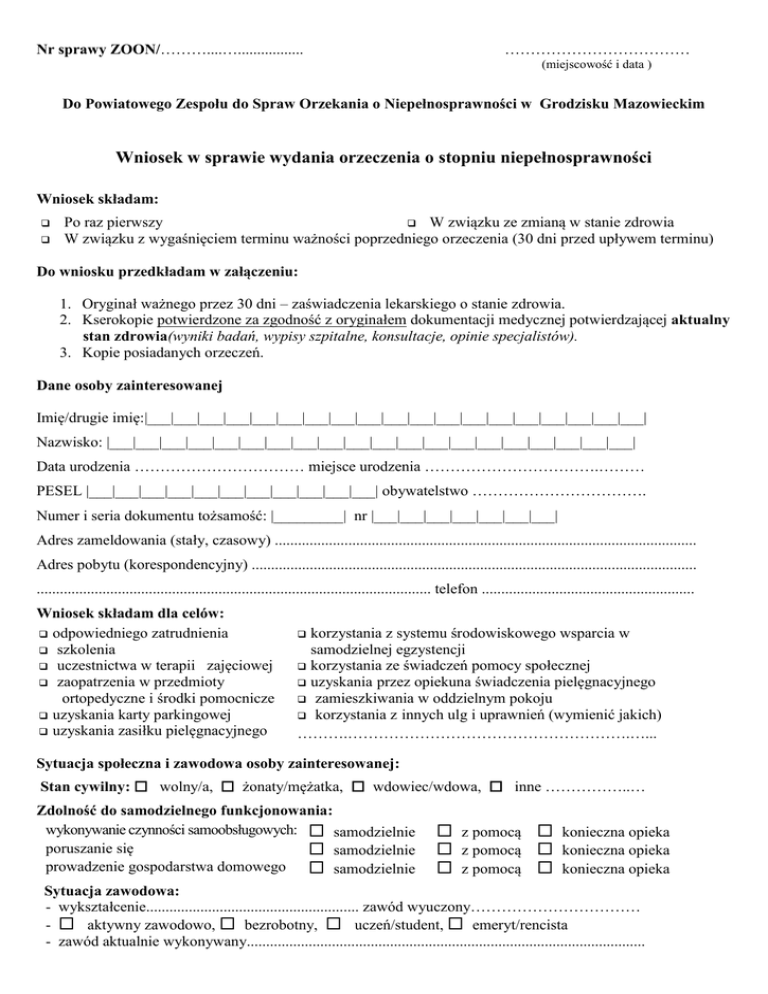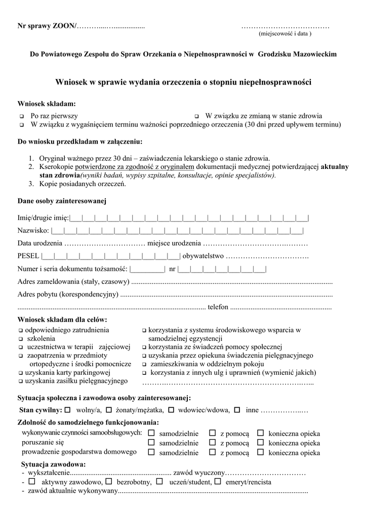 Nr sprawy ZOON/………....…................. ……………………………… (miejscowość i data ) Do Powiatowego Zespołu do Spraw Orzekania o Niepełnosprawności w Grodzisku Mazowieckim Wniosek w sprawie wydania orzeczenia o stopniu niepełnosprawności Wniosek składam: Po raz pierwszy W związku ze zmianą w stanie zdrowia W związku z wygaśnięciem terminu ważności poprzedniego orzeczenia (30 dni przed upływem terminu) Do wniosku przedkładam w załączeniu: 1. Oryginał ważnego przez 30 dni – zaświadczenia lekarskiego o stanie zdrowia. 2. Kserokopie potwierdzone za zgodność z oryginałem dokumentacji medycznej potwierdzającej aktualny stan zdrowia(wyniki badań, wypisy szpitalne, konsultacje, opinie specjalistów). 3. Kopie posiadanych orzeczeń. Dane osoby zainteresowanej Imię/drugie imię:|___|___|___|___|___|___|___|___|___|___|___|___|___|___|___|___|___|___|___| Nazwisko: |___|___|___|___|___|___|___|___|___|___|___|___|___|___|___|___|___|___|___|___| Data urodzenia …………………………… miejsce urodzenia …………………………….……… PESEL |___|___|___|___|___|___|___|___|___|___|___| obywatelstwo ……………………………. Numer i seria dokumentu tożsamość: |_________| nr |___|___|___|___|___|___|___| Adres zameldowania (stały, czasowy) ............................................................................................................. Adres pobytu (korespondencyjny) ................................................................................................................... ...................................................................................................... telefon ....................................................... Wniosek składam dla celów: odpowiedniego zatrudnienia szkolenia uczestnictwa w terapii zajęciowej zaopatrzenia w przedmioty ortopedyczne i środki pomocnicze uzyskania karty parkingowej uzyskania zasiłku pielęgnacyjnego korzystania z systemu środowiskowego wsparcia w samodzielnej egzystencji korzystania ze świadczeń pomocy społecznej uzyskania przez opiekuna świadczenia pielęgnacyjnego zamieszkiwania w oddzielnym pokoju korzystania z innych ulg i uprawnień (wymienić jakich) ……….……………………………………………….…... Sytuacja społeczna i zawodowa osoby zainteresowanej: Stan cywilny: wolny/a, żonaty/mężatka, wdowiec/wdowa, inne ……………..… Zdolność do samodzielnego funkcjonowania: wykonywanie czynności samoobsługowych: samodzielnie poruszanie się samodzielnie prowadzenie gospodarstwa domowego samodzielnie z pomocą konieczna opieka z pomocą konieczna opieka z pomocą konieczna opieka Sytuacja zawodowa: - wykształcenie....................................................... zawód wyuczony…………………………… - aktywny zawodowo, bezrobotny, uczeń/student, emeryt/rencista - zawód aktualnie wykonywany....................................................................................................... Oświadczenia: 1. Nie pobieram/ pobieram świadczenia z ubezpieczenia społecznego: emeryturę, rentę, rentę rodzinną, świadczenie rehabilitacyjne. 2. Nie składałem /am / składałem /am uprzednio wniosku o ustalenie stopnia niepełnosprawności, jeżeli tak, to gdzie i kiedy............................................................................. Nie posiadam / posiadam orzeczenie o stopniu niepełnosprawności wydane w dniu …………………….. ważne do dnia ………………………………………………………. 3. Mogę / nie mogę przybyć na posiedzenie składu orzekającego (jeśli nie, należy dołączyć zaświadczenie lekarskie potwierdzające niemożność wzięcia udziału w posiedzeniu z powodu długotrwałej, obłożnej choroby nierokującej poprawy) 4. W przypadku stwierdzonej przez zespół orzekający konieczności uzupełnienia dokumentacji medycznej, jestem świadomy wymogu ponoszenia kosztów wykonania badań we własnym zakresie i o konieczności dostarczenia jej w wyznaczonym terminie. Nieuzupełnienie dokumentacji spowoduje pozostawienie wniosku bez rozpoznania. 5. Zobowiązuję się powiadomić Zespół o każdej zmianie adresu do momentu zakończenia postępowania (zgodnie z art. 41 Kodeksu postępowania administracyjnego). 6. Świadomy/a odpowiedzialności karnej za zeznanie nieprawdy lub zatajenie prawdy wynikającej z art. 233 § 1 kodeksu karnego oświadczam, że dane zawarte w powyższym wniosku są zgodne ze stanem faktycznym Dane przedstawiciela ustawowego (uzupełnia tylko: rodzic do 16-go roku życia / ustanowiony opiekun prawny) Imię/drugie imię:|___|___|___|___|___|___|___|___|___|___|___|___|___|___|___|___|___|___|___| Nazwisko: |___|___|___|___|___|___|___|___|___|___|___|___|___|___|___|___|___|___|___|___| Data urodzenia ……………………..……… miejsce urodzenia ………………………………..… PESEL |___|___|___|___|___|___|___|___|___|___|___| Dokument tożsamości: seria |_________| nr |___|___|___|___|___|___|___| Adres zameldowania (stały, czasowy) ............................................................................................................. Adres pobytu (korespondencyjny) ................................................................................................................... ...................................................................................................... telefon ....................................................... ................................................................ Podpis osoby zainteresowanej lub jej przedstawiciela ustawowego Dotyczy wniosków składanych za pośrednictwem Instytucji Pomocy Społecznej Oświadczam, że wyrażam zgodę na złożenie wniosku w sprawie wydania orzeczenia o stopniu niepełnosprawności przez .....................................................................................................................