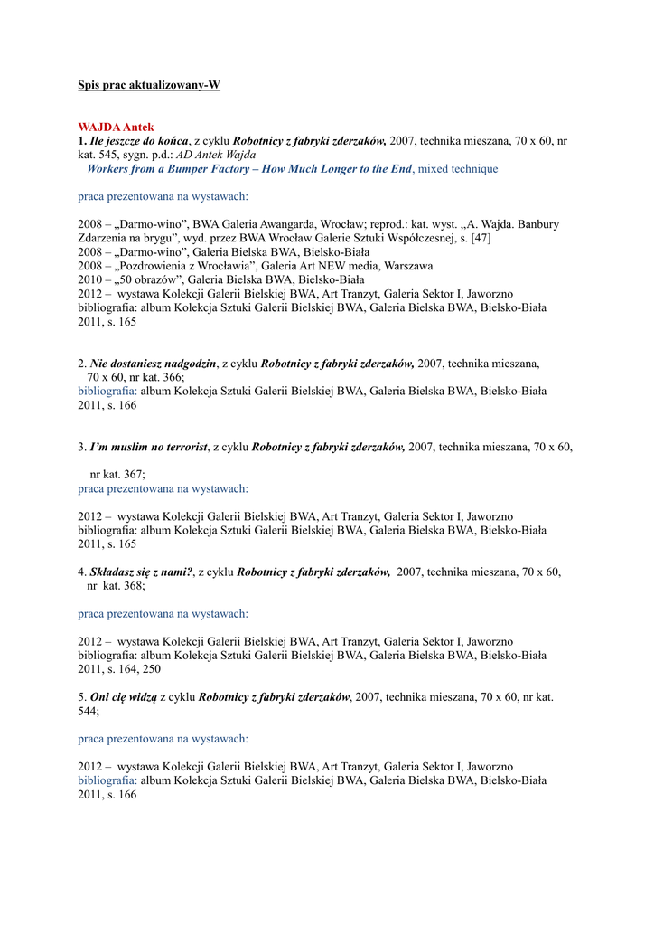 Spis prac aktualizowany-W WAJDA Antek 1. Ile jeszcze do końca, z cyklu Robotnicy z fabryki zderzaków, 2007, technika mieszana, 70 x 60, nr kat. 545, sygn. p.d.: AD Antek Wajda Workers from a Bumper Factory – How Much Longer to the End, mixed technique praca prezentowana na wystawach: 2008 – „Darmo-wino”, BWA Galeria Awangarda, Wrocław; reprod.: kat. wyst. „A. Wajda. Banbury Zdarzenia na brygu”, wyd. przez BWA Wrocław Galerie Sztuki Współczesnej, s. [47] 2008 – „Darmo-wino”, Galeria Bielska BWA, Bielsko-Biała 2008 – „Pozdrowienia z Wrocławia”, Galeria Art NEW media, Warszawa 2010 – „50 obrazów”, Galeria Bielska BWA, Bielsko-Biała 2012 – wystawa Kolekcji Galerii Bielskiej BWA, Art Tranzyt, Galeria Sektor I, Jaworzno bibliografia: album Kolekcja Sztuki Galerii Bielskiej BWA, Galeria Bielska BWA, Bielsko-Biała 2011, s. 165 2. Nie dostaniesz nadgodzin, z cyklu Robotnicy z fabryki zderzaków, 2007, technika mieszana, 70 x 60, nr kat. 366; bibliografia: album Kolekcja Sztuki Galerii Bielskiej BWA, Galeria Bielska BWA, Bielsko-Biała 2011, s. 166 3. I’m muslim no terrorist, z cyklu Robotnicy z fabryki zderzaków, 2007, technika mieszana, 70 x 60, nr kat. 367; praca prezentowana na wystawach: 2012 – wystawa Kolekcji Galerii Bielskiej BWA, Art Tranzyt, Galeria Sektor I, Jaworzno bibliografia: album Kolekcja Sztuki Galerii Bielskiej BWA, Galeria Bielska BWA, Bielsko-Biała 2011, s. 165 4. Składasz się z nami?, z cyklu Robotnicy z fabryki zderzaków, 2007, technika mieszana, 70 x 60, nr kat. 368; praca prezentowana na wystawach: 2012 – wystawa Kolekcji Galerii Bielskiej BWA, Art Tranzyt, Galeria Sektor I, Jaworzno bibliografia: album Kolekcja Sztuki Galerii Bielskiej BWA, Galeria Bielska BWA, Bielsko-Biała 2011, s. 164, 250 5. Oni cię widzą z cyklu Robotnicy z fabryki zderzaków, 2007, technika mieszana, 70 x 60, nr kat. 544; praca prezentowana na wystawach: 2012 – wystawa Kolekcji Galerii Bielskiej BWA, Art Tranzyt, Galeria Sektor I, Jaworzno bibliografia: album Kolekcja Sztuki Galerii Bielskiej BWA, Galeria Bielska BWA, Bielsko-Biała 2011, s. 166 6. Z wczoraj pamiętam tylko z cyklu Robotnicy z fabryki zderzaków, 2007, technika mieszana, 70 x 60, nr kat. 546; praca prezentowana na wystawach: 2012 – wystawa Kolekcji Galerii Bielskiej BWA, Art Tranzyt, Galeria Sektor I, Jaworzno bibliografia: album Kolekcja Sztuki Galerii Bielskiej BWA, Galeria Bielska BWA, Bielsko-Biała 2011, s. 166 7. You alright z cyklu Robotnicy z fabryki zderzaków, 2007, technika mieszana, 70 x 60, nr kat. 547; bibliografia: album Kolekcja Sztuki Galerii Bielskiej BWA, Galeria Bielska BWA, Bielsko-Biała 2011, s. 166 8. To jest twoje z cyklu Robotnicy z fabryki zderzaków, 2007, technika mieszana, 70 x 60, nr kat. 548; praca prezentowana na wystawach: 2012 – wystawa Kolekcji Galerii Bielskiej BWA, Art Tranzyt, Galeria Sektor I, Jaworzno bibliografia: album Kolekcja Sztuki Galerii Bielskiej BWA, Galeria Bielska BWA, Bielsko-Biała 2011, s. 167 9. Zrób se badania z cyklu Robotnicy z fabryki zderzaków, 2007, technika mieszana,70 x 60, nr kat. 549; praca prezentowana na wystawach: 2012 – wystawa Kolekcji Galerii Bielskiej BWA, Art Tranzyt, Galeria Sektor I, Jaworzno bibliografia: album Kolekcja Sztuki Galerii Bielskiej BWA, Galeria Bielska BWA, Bielsko-Biała 2011, s. 166 10. Idziesz na fajkę z cyklu Robotnicy z fabryki zderzaków, 2007, technika mieszana, 70 x 60, nr kat. 550; praca prezentowana na wystawach: 2012 – wystawa Kolekcji Galerii Bielskiej BWA, Art Tranzyt, Galeria Sektor I, Jaworzno bibliografia: album Kolekcja Sztuki Galerii Bielskiej BWA, Galeria Bielska BWA, Bielsko-Biała 2011, s. 167 11. You're a fucking lazy bastard z cyklu Robotnicy z fabryki zderzaków, 2007, technika mieszana, 70 x 60, nr kat. 551; praca prezentowana na wystawach: 2012 – wystawa Kolekcji Galerii Bielskiej BWA, Art Tranzyt, Galeria Sektor I, Jaworzno bibliografia: album Kolekcja Sztuki Galerii Bielskiej BWA, Galeria Bielska BWA, Bielsko-Biała 2011, s. 166 12. Przeproś za spóźnienie z cyklu Robotnicy z fabryki zderzaków, 2007, technika mieszana, 70 x 60, nr kat. 552; bibliografia: album Kolekcja Sztuki Galerii Bielskiej BWA, Galeria Bielska BWA, Bielsko-Biała 2011, s. 167 bibliografia: album Kolekcja Sztuki Galerii Bielskiej BWA, Galeria Bielska BWA, Bielsko-Biała 2011, s. 167 13. Uwaga wypadek z cyklu Robotnicy z fabryki zderzaków, 2007, technika mieszana, 70 x 60, nr kat. 553; bibliografia: album Kolekcja Sztuki Galerii Bielskiej BWA, Galeria Bielska BWA, Bielsko-Biała 2011, s. 167 14. Your break z cyklu Robotnicy z fabryki zderzaków, 2007, technika mieszana, 70 x 60, nr kat. 554; 15. Bez myśl z cyklu Robotnicy z fabryki zderzaków, 2007, technika mieszana, 70 x 60, nr kat. 555; bibliografia: album Kolekcja Sztuki Galerii Bielskiej BWA, Galeria Bielska BWA, Bielsko-Biała 2011, s. 167 16. Boska wszech-świość z cyklu Robotnicy z fabryki zderzaków, 2007, technika mieszana, 70 x 60, nr kat. 556; bibliografia: album Kolekcja Sztuki Galerii Bielskiej BWA, Galeria Bielska BWA, Bielsko-Biała 2011, s. 167 WAŁASZEK Andrzej Krzysztof 1. Przed-pokój (obiekt dwuczęściowy), 2005, lightbox, fotografia, ceramika, 24 x 34 x 9; 12 x 23,5 x 6, nr kat. 382 Andrzej Krzysztof Wałaszek, Ante-Room, lighbox, photography, ceramic praca prezentowana na wystawach: 2005 – „Do dwóch razy sztuka” (z Jerzym Kosałką), Galeria Bielska BWA, Bielsko-Biała bibliografia: album Kolekcja Sztuki Galerii Bielskiej BWA, Galeria Bielska BWA, Bielsko-Biała 2011, s. 168, 169, 251 2. Tablica z inskrypcją, 2005, obiekt, ceramika, 42 x 60 x 1,2 , nr kat. 381 WARCHOŁ Paweł 1. Autoportret, 2000, tusz, papier, 70 x 100, nr kat. 297; sygn. u góry: Warchoł 2000 Paweł Warchoł, Self Portrait, 2000, ink, paper, praca prezentowana na wystawach: 2000 – III Triennale Autoportretu, Radom; Główna Nagroda Ministra Kultury i Dziedzictwa Narodowego 2000 – Muzeum Sztuki Współczesnej, Dom E