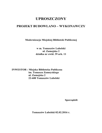 UPROSZCZONY PROJEKT BUDOWLANO – WYKONAWCZY Modernizacja Miejskiej Biblioteki Publicznej w m. Tomaszów Lubelski ul. Zamojska 2 działka nr ewid. 39 ark. 11 INWESTOR : Miejska Biblioteka Publiczna im. Tomasza Zamoyskiego ul. Zamojska 2 22-600 Tomaszów Lubelski Sporządził: Tomaszów Lubelski 02.02.2016 r. OPIS TECHNICZNY Modernizacja Miejskiej Biblioteki Publicznej w Tomaszowie Lubelskim przy ulicy Zamojskiej 2 Cel opracowania. Celem opracowania jest modernizacja i remont pomieszczeń Miejskiej Biblioteki Publicznej w Tomaszowie Lubelskim przy ulicy Zamojskiej 2. W zakres opracowania wchodzi: - wykonanie remontu pomieszczeń sanitarnych (WC) polegających m.in. na : *wykonaniu ścianek działowych z płyt gipsowo-kartonowych na konstrukcji aluminiowej, *wykonaniu sufitów podwieszanych, *wymianie stolarki drzwiowej wewnętrznej, * wykonaniu posadzek z płytek gresowych, * wykonaniu okładzin ścian z płytek glazura, * robót malarskich, * drobnych robót instalacji wodnej i kanalizacyjnej, * drobnych robót instalacji elektrycznej, wymiana opraw oświetleniowych, - montaż szaf archiwalnych, - remont układów pomiarowych energii elektrycznej, - montaż trezora bibliotecznego, Nie przewiduje się zmian w układzie ścian konstrukcyjnych wewnętrznych. Zakres robót w obrębie W.C. – piwnica segment A Demontaż rurociągu żeliwnego kanalizacyjnego o śr. 150 mm - na ścianach budynku Demontaż zlewozmywaka stalowego dwukomorowego Demontaż baterii zlewozmywakowej Demontaż rurociągu stalowego ocynkowanego o śr. 15-20 mm Demontaż łączników instalacyjnych podtynkowych (wyłącznik lub przełącznik 1 biegunowy) Demontaż gniazd wtyczkowych natynkowych uszczelnionych Demontaż grzejnika stalowego płytowego dwurzędowego - grzejnik do ponownego zamontowania Wykucie z muru podokienników betonowych z lastryko Ścianka działowa z płyt gipsowo-kartonowych wodoodpornych gr. 12,5 mm na pojedynczej konstrukcji nośnej, z pokryciem obustronnym jednowarstwowym 5001; Obudowa pionów płytami gipsowo-kartonowymi wodoodpornymi gr. 12,5 mm na rusztach metalowych pojedynczych jednowarstwo 50-01 Obudowa belek i podciągów płytami gipsowo-kartonowymi wodoodpornymi gr. 12,5 mm na rusztach metalowych pojedynczych jednowarstwowo 50-01 Podokienniki o szer. 25 cm i dł. 0,90 m z płyt z konglomeratów kamiennych aglomarmurowe Przygotowanie podłoża pod licowanie ścian płytkami na klej Przygotowanie powierzchni pod malowanie farbami emulsyjnymi starych tynków z poszpachlowaniem nierówności Gruntowanie preparatem wzmacniającym jednokrotnie ścian pod układanie glazury i malowanie emulsyjne Dwukrotne malowanie farbami emulsyjnymi powierzchni wewnętrznych - tynków gładkich Licowanie ścian płytkami glazura na klej metodą kombinowaną Pow. 5,0-10,0 m2. - kolor glazury do uzgodnienia z INWESTOREM Osadzenie listew wykończających przy licowaniu ścian płytkami Montaż drzwiczek rewizyjnych o powierzchni elementu do 0.2 m2 Wstawienie nowych drzwi - ościeżnica drewniana o wym. 0.80x2.10 ze skrzydłem płycinowym szklonym małą szybą o wym. 0.70x2.05 szt 1 Założenie klamek Założenie wkładek Montaż rurociągów z PCW o śr. 110 mm na ścianach z łączeniem metodą wciskową - ściany z betonu żwirowego Montaż czyszczaków kanalizacyjnych z PCW o śr.zewn. 110 mm łączonych metodą wciskową Trójnik PVC kanalizacyjny jednokielichowy łączony na wcisk o śr. zewn. 160/110 mm Dodatek za wykonanie podejść odpływowych z rur i kształtek z nieplastyfikowanego PCW o śr. 110 mm - ściany z betonu żwirowego Dodatek za wykonanie podejść odpływowych z rur i kształtek z nieplastyfikowanego PCW o śr. 50 mm Przeróbka instalacji wodociągowej Montaż umywalek pojedyńczych porcelanowych z syfonem gruszkowym Montaż ustępów pojedynczych z płuczkami z porcelany 'kompakt' Baterie umywalkowe stojace o śr.nom. 15 mm Zawory czerpalne o śr. nominalnej 15 mm ze złączką do węża Wentylatory łazienkowe EDM 200SZ Montaż termy elektrycznej - pogrzewacza wody 10 L z baterią Kieszeniowa suszarka do rąk HP2011 automat Rury przyłączne stalowe o śr. zewn. 15 mm do grzejników Montaż grzejnika stalowego dwupłytowe o wysokości 600-900 mm i długości do 1600 mm - grzejni z rozbiórki Przeróbka istniejącej instalacji elektrycznej Wypusty wyk. przewodami YDYp 3x2,50 na gniazda hermetyczne Wypusty na wyłącz. 1-bieg.6A wyk. przewodami YDYp 3x1,50 Montaż z podłączeniem na gotowym podłożu opraw oświetleniowych plafoniera Sprawdzenie i pomiar 1-fazowego obwodu elektrycznego niskiego napięcia Badania i pomiary instalacji skuteczności zerowania (pierwszy pomiar) Badania i pomiary instalacji skuteczności zerowania (każdy następny pomiar) Wymiana kratek wentylacyjnych 14x14 cm w ścianach Przebicie otworów o powierzchni 0.05 m2 - 0.10 m2 w elementach z betonu żwirowego o grubości do 20 cm - przejście przez fundament grubości 80 cm Przebicie otworów o powierzchni 0.05 m2 - 0.10 m2 w elementach z betonu żwirowego o grubości do 10 cm Przewierty o długości do 40 m maszyną do wierceń poziomych WP 80/120 rurami o śr. 1200 mm w gruntach kat. III-IV Przeciąganie rurociągów przewodowych o śr. nom. 160 mm w rurach ochronnych POM. GOSPODARCZE - piwnica segment B Demontaż rurociągu żeliwnego kanalizacyjnego o śr. 150 mm - na ścianach budynku Demontaż rurociągu żeliwnego kanalizacyjnego o śr. 100 mm - na ścianach budynku Rurociągi o śr. 160 mm Trójnik PVC kanalizacyjny jednokielichowy łączony na wcisk o śr. zewn. 160/110 mm Montaż rurociągów z PCW o śr. 110 mm na ścianach z łączeniem metodą wciskową - ściany z betonu żwirowego Montaż czyszczaków kanalizacyjnych z PCW o śr.zewn. 110 mm łączonych metodą wciskową Trójnik PVC kanalizacyjny jednokielichowy łączony na wcisk o śr. zewn. 110/50 mm Gruntowanie preparatem wzmacniającym jednokrotnie ścian i suftów pod malowanie emulsyjne Dwukrotne malowanie farbami emulsyjnymi powierzchni we