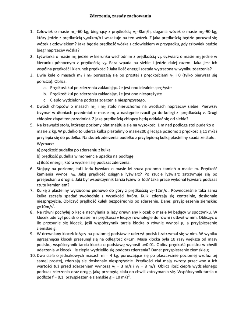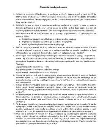 Zderzenia, zasady zachowania 1. Człowiek o masie m1=60 kg, biegnący z prędkością v1=8km/h, dogania wózek o masie m2=90 kg, który jedzie z prędkością v2=4km/h i wskakuje na ten wózek. Z jaka prędkością będzie poruszał się wózek z człowiekiem? Jaka będzie prędkość wózka z człowiekiem w przypadku, gdy człowiek będzie biegł naprzeciw wózka? 2. Łyżwiarka o masie m1 jedzie w kierunku wschodnim z prędkością v1. Łyżwiarz o masie m2 jedzie w kierunku północnym z prędkością v2. Para wpada na siebie i jedzie dalej razem. Jaka jest ich wspólna prędkość i kierunek prędkości? Jaka ilość energii została wytracona w wyniku zderzenia? 3. Dwie kule o masach m1 i m2 poruszają się po prostej z prędkościami v1 i 0 (tylko pierwsza się porusza). Oblicz: a. Prędkość kul po zderzeniu zakładając, że jest ono idealnie sprężyste b. Prędkość kul po zderzeniu zakładając, że jest ono niesprężyste c. Ciepło wydzielone podczas zderzenia niesprężystego. 4. Dwóch chłopców o masach m1 i m2 stało nieruchomo na wrotkach naprzeciw siebie. Pierwszy trzymał w dłoniach przedmiot o masie m3 a następnie rzucił go do kolegi z prędkością v. Drugi chłopiec złapał ten przedmiot. Z jaką prędkością chłopcy będą oddalać się od siebie? 5. Na krawędzi stołu, którego poziomy blat znajduje się na wysokości 1 m nad podłogą stoi pudełko o masie 2 kg. W pudełko to uderza kulka plasteliny o masie200 g lecąca poziomo z prędkością 11 m/s i przylepia się do pudełka. Na skutek zderzenia pudełko z przylepioną kulką plasteliny spada ze stołu. Wyznacz: a) prędkość pudełka po zderzeniu z kulką b) prędkość pudełka w momencie upadku na podłogę c) ilość energii, która wydzieli się podczas zderzenia. 6. Stojący na poziomej tafli lodu łyżwiarz o masie M rzuca poziomo kamień o masie m. Prędkość kamienia wynosi v0. Jaką prędkość osiągnie łyżwiarz? Po rzucie łyżwiarz zatrzymuje się po przejechaniu drogi s. Jaki był współczynnik tarcia łyżew o lód? Jaka prace wykonał łyżwiarz podczas rzutu kamieniem? 7. Kulkę z plasteliny wyrzucono pionowo do góry z prędkością v0=12m/s . Równocześnie taka sama kulka zaczęła spadać swobodnie z wysokości h=6m. Kulki zderzają się centralnie, doskonale niesprężyście. Obliczyć prędkość kulek bezpośrednio po zderzeniu. Dane: przyśpieszenie ziemskie: g=10m/s2. 8. Na równi pochyłej o kącie nachylenia α leży drewniany klocek o masie M będący w spoczynku. W klocek uderzył pocisk o masie m i prędkości v lecący równolegle do równi i utkwił w nim. Obliczyć o ile przesunie się klocek, jeśli współczynnik tarcia klocka o równię wynosi µ, a przyśpieszenie ziemskie g. 9. W drewniany klocek leżący na poziomej podstawie uderzył pocisk i zatrzymał się w nim. W wyniku ugrzęźnięcia klocek przesunął się na odległość d=1m. Masa klocka była 10 razy większa od masy pocisku, współczynnik tarcia klocka o podstawę wynosił µ=0.01. Oblicz prędkość pocisku w chwili uderzenia w klocek. Ile ciepła wydzieliło się podczas zderzenia? Dane: przyspieszenie ziemskie g. 10. Dwa ciała o jednakowych masach m = 4 kg, poruszające się po płaszczyźnie poziomej wzdłuż tej samej prostej, zderzają się doskonale niesprężyście. Prędkości ciał mają zwroty przeciwne a ich wartości tuż przed zderzeniem wynoszą v1 = 3 m/s i v2 = 8 m/s. Oblicz ilość ciepła wydzielonego podczas zderzenia oraz drogę, jaką przebędą ciała do chwili zatrzymania się. Współczynnik tarcia o podłoże f = 0,1, przyspieszenie ziemskie g = 10 m/s2.