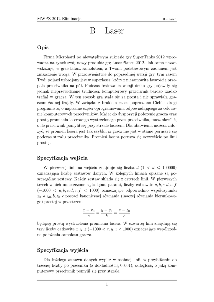 MWPZ 2012 Eliminacje B – Laser B – Laser Opis Firma Microhard po niewątpliwym sukcesie gry SuperTanks 2012 wprowadza na rynek swój nowy produkt: grę LaserPlanes 2012. Jak sama nazwa wskazuje, w grze latasz samolotem, a Twoim podstawowym zadaniem jest zniszczenie wroga. W przeciwieństwie do poprzedniej wersji gry, tym razem Twój pojazd uzbrojony jest w superlaser, który z niesamowitą łatwością przepala przeciwnika na pół. Podczas testowania wersji demo gry pojawiły się jednak nieprzewidziane trudności: komputerowy przeciwnik bardzo rzadko trafiał w gracza. W ten sposób gra stała się za prosta i nie sprawiała graczom żadnej frajdy. W związku z brakiem czasu poproszono Ciebie, drogi programisto, o napisanie części oprogramowania odpowiadającego za celowanie komputerowych przeciwników. Mając do dyspozycji położenie gracza oraz prostą promienia laserowego wystrzelonego przez przeciwnika, masz określić, o ile przeciwnik pomylił się przy strzale laserem. Dla ułatwienia możesz założyć, że promień lasera jest tak szybki, iż gracz nie jest w stanie poruszyć się podczas strzału przeciwnika. Promień lasera porusza się oczywiście po linii prostej. Specyfikacja wejścia W pierwszej linii na wejściu znajduje się liczba d (1 < d ¬ 100000) oznaczająca liczbę zestawów danych. W kolejnych liniach opisane są poszczególne zestawy. Każdy zestaw składa się z czterech linii. W pierwszych trzech z nich umieszczone są kolejno, parami, liczby całkowite a, b, c, d, e, f (−1000 < a, b, c, d, e, f < 1000) oznaczające odpowiednio współczynniki x0 , a, y0 , b, z0 , c postaci kanonicznej równania (inaczej równania kierunkowego) prostej w przestrzeni x − x0 y − y0 z − z0 = = , a b c będącej prostą wystrzelenia promienia lasera. W czwartej linii znajdują się trzy liczby całkowite x, y, z (−1000 < x, y, z < 1000) oznaczające współrzędne położenia samolotu gracza. Specyfikacja wyjścia Dla każdego zestawu danych wypisz w osobnej linii, w przybliżeniu do trzeciej liczby po przecinku (z dokładnością 0, 001), odległość, o jaką komputerowy przeciwnik pomylił się przy strzale. 1 MWPZ 2012 Eliminacje B – Laser Przykład Wejście: 2 1 1 1 1 1 1 1 1 1 -1 1 -2 2 -3 3 1 1 1 Wyjście: 0.000 0.655 2