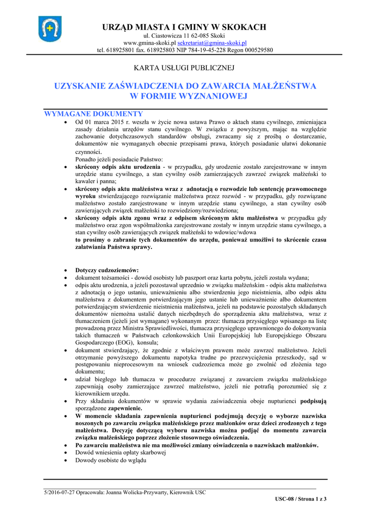 URZĄD MIASTA I GMINY W SKOKACH ul. Ciastowicza 11 62-085 Skoki www.gmina-skoki.pl [email protected] tel. 618925801 fax. 618925803 NIP 784-19-45-228 Regon 000529580 KARTA USŁUGI PUBLICZNEJ UZYSKANIE ZAŚWIADCZENIA DO ZAWARCIA MAŁŻEŃSTWA W FORMIE WYZNANIOWEJ WYMAGANE DOKUMENTY Od 01 marca 2015 r. weszła w życie nowa ustawa Prawo o aktach stanu cywilnego, zmieniająca zasady działania urzędów stanu cywilnego. W związku z powyższym, mając na względzie zachowanie dotychczasowych standardów obsługi, zwracamy się z prośbą o dostarczanie, dokumentów nie wymaganych obecnie przepisami prawa, których posiadanie ułatwi dokonanie czynności. Ponadto jeżeli posiadacie Państwo: skrócony odpis aktu urodzenia - w przypadku, gdy urodzenie zostało zarejestrowane w innym urzędzie stanu cywilnego, a stan cywilny osób zamierzających zawrzeć związek małżeński to kawaler i panna; skrócony odpis aktu małżeństwa wraz z adnotacją o rozwodzie lub sentencję prawomocnego wyroku stwierdzającego rozwiązanie małżeństwa przez rozwód - w przypadku, gdy rozwiązane małżeństwo zostało zarejestrowane w innym urzędzie stanu cywilnego, a stan cywilny osób zawierających związek małżeński to rozwiedziony/rozwiedziona; skrócony odpis aktu zgonu wraz z odpisem skróconym aktu małżeństwa w przypadku gdy małżeństwo oraz zgon współmałżonka zarejestrowane zostały w innym urzędzie stanu cywilnego, a stan cywilny osób zawierających związek małżeński to wdowiec/wdowa to prosimy o zabranie tych dokumentów do urzędu, ponieważ umożliwi to skrócenie czasu załatwiania Państwa sprawy. Dotyczy cudzoziemców: dokument tożsamości - dowód osobisty lub paszport oraz karta pobytu, jeżeli została wydana; odpis aktu urodzenia, a jeżeli pozostawał uprzednio w związku małżeńskim - odpis aktu małżeństwa z adnotacją o jego ustaniu, unieważnieniu albo stwierdzeniu jego nieistnienia, albo odpis aktu małżeństwa z dokumentem potwierdzającym jego ustanie lub unieważnienie albo dokumentem potwierdzającym stwierdzenie nieistnienia małżeństwa, jeżeli na podstawie pozostałych składanych dokumentów niemożna ustalić danych niezbędnych do sporządzenia aktu małżeństwa, wraz z tłumaczeniem (jeżeli jest wymagane) wykonanym przez: tłumacza przysięgłego wpisanego na listę prowadzoną przez Ministra Sprawiedliwości, tłumacza przysięgłego uprawnionego do dokonywania takich tłumaczeń w Państwach członkowskich Unii Europejskiej lub Europejskiego Obszaru Gospodarczego (EOG), konsula; dokument stwierdzający, że zgodnie z właściwym prawem może zawrzeć małżeństwo. Jeżeli otrzymanie powyższego dokumentu napotyka trudne po przezwyciężenia przeszkody, sąd w postępowaniu nieprocesowym na wniosek cudzoziemca może go zwolnić od złożenia tego dokumentu; udział biegłego lub tłumacza w procedurze związanej z zawarciem związku małżeńskiego zapewniają osoby zamierzające zawrzeć małżeństwo, jeżeli nie potrafią porozumieć się z kierownikiem urzędu. Przy składaniu dokumentów w sprawie wydania zaświadczenia oboje nupturienci podpisują sporządzone zapewnienie. W momencie składania zapewnienia nupturienci podejmują decyzję o wyborze nazwiska noszonych po zawarciu związku małżeńskiego przez małżonków oraz dzieci zrodzonych z tego małżeństwa. Decyzję dotyczącą wyboru nazwiska można podjąć do momentu zawarcia związku małżeńskiego poprzez złożenie stosownego oświadczenia. Po zawarciu małżeństwa nie ma możliwości zmiany oświadczenia o nazwiskach małżonków. Dowód wniesienia opłaty skarbowej Dowody osobiste do wglądu 5/2016-07-27 Opracowała: Joanna Wolicka-Przywarty, Kierownik USC USC-08 / Strona 1 z 3 URZĄD MIASTA I GMINY W SKOKACH ul. Ciastowicza 11 62-085 Skoki www.gmina-skoki.pl [email protected] tel. 618925801 fax. 618925803 NIP 784-19-45-228 Regon 000529580 KARTA USŁUGI PUBLICZNEJ MIEJSCE ZAŁATWIENIA SPRAWY Referat Spraw Obywatelskich, ul. Ciastowicza 11 Skoki Złożenie i odbiór dokumentów: parter, pokój nr 1, Segment A w Urzędzie Tel. (61) 8925-806.., e-mail: [email protected] Godziny obsługi interesantów: poniedziałek 9:00-17:00, wtorek-piątek 7:30-15:30 TERMIN ZAŁATWIENIA SPRAWY Od ręki po złożeniu kompletu dokumentów. SPOSÓB ZAŁATWIENIA SPRAWY 1. Przedstaw wymagane dokumenty. 2. Poczekaj na wydanie przez kierownika USC dokutemu : zaświadczenia o możliwości zawarcia małżeństwa w formie wyznaniowej , które jest ważne 6 miesięcy od daty wystawienia. OPŁATY 84 zł - opłata skarbowa za sporządzenie aktu małżeństwa, jeżeli akt małżeństwa będzie sporządzany w tut. Urzędzie Akt sporządzany jest z chwilą przesłania przez księdza zaświadczenia potwierdzającego zawarcie związku małżeńskiego. Opłatę skarbową można uiścić: w kasie, parter , pok. nr 7, Segment A w Urzędzie - czynna w poniedziałki od 9.00. do 16.00, od wtorku do piątku 8.00.-15.00, lub przelewem na konto BS GNIEZNO o/SKOKI 43 9065 0006 0040 0400 0185 0001 TRYB ODWOŁAWCZY Kierownik USC odmawia wydania zaświadczenia o możności zawarcia małżeństwa w formie wyznaniowej, gdy stwierdzi, że w świetle prawa polskiego istnieją okoliczności wyłączające zawarcie zamierzonego małżeństwa powiadamiając pisemnie osobę zainteresowaną. Osoba zainteresowana w terminie 14 dni od dnia doręczenia jej pisma kierownika USC może wystąpić do Sądu Rejonowego w Wągrowcu - Wydziału Rodzinnego i Nieletnich ( ul. Kościuszki 18, 62-100 Wągrowiec) o rozstrzygniecie czy okoliczności przedstawione przez kierownika USC, uzasadniają odmowę wydania zaświadczenia; prawomocne postanowienie sądu jest wiążące dla kierownika USC. DODATKOWE INFORMACJE Nie mogą zawrzeć małżeństwa osoby, które nie ukończyły 18 lat, ubezwłasnowolnione całkowicie, dotknięte chorobą psychiczną, spokrewnione lub spowinowacone w linii prostej oraz już pozostające w związku małżeński