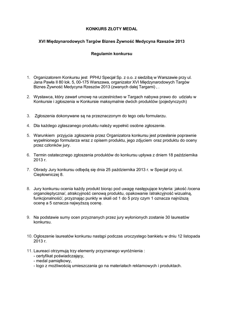 KONKURS ZŁOTY MEDAL XVI Międzynarodowych Targów Biznes Żywność Medycyna Rzeszów 2013 Regulamin konkursu 1. Organizatorem Konkursu jest PPHU Specjał Sp. z o.o. z siedzibą w Warszawie przy ul. Jana Pawła II 80 lok. 5, 00-175 Warszawa, organizator XVI Międzynarodowych Targów Biznes Żywność Medycyna Rzeszów 2013 (zwanych dalej Targami) , . 2. Wystawca, który zawarł umowę na uczestnictwo w Targach nabywa prawo do udziału w Konkursie i zgłoszenia w Konkursie maksymalnie dwóch produktów (pojedynczych) 3. Zgłoszenia dokonywane są na przeznaczonym do tego celu formularzu. 4. Dla każdego zgłaszanego produktu należy wypełnić osobne zgłoszenie. 5. Warunkiem przyjęcia zgłoszenia przez Organizatora konkursu jest przesłanie poprawnie wypełnionego formularza wraz z opisem produktu, jego zdjęciem oraz produktu do oceny przez członków jury. 6. Termin ostatecznego zgłoszenia produktów do konkursu upływa z dniem 18 października 2013 r. 7. Obrady Jury konkursu odbędą się dnia 25 października 2013 r. w Specjał przy ul. Ciepłowniczej 8. 8. Jury konkursu ocenia każdy produkt biorąc pod uwagę następujące kryteria: jakość /ocena organoleptyczna/, atrakcyjność cenową produktu, opakowanie /atrakcyjność wizualną, funkcjonalność/, przyznając punkty w skali od 1 do 5 przy czym 1 oznacza najniższą ocenę a 5 oznacza najwyższą ocenę. 9. Na podstawie sumy ocen przyznanych przez jury wyłonionych zostanie 30 laureatów konkursu. 10. Ogłoszenie laureatów konkursu nastąpi podczas uroczystego bankietu w dniu 12 listopada 2013 r. 11. Laureaci otrzymują trzy elementy przyznanego wyróżnienia : - certyfikat poświadczający, - medal pamiątkowy, - logo z możliwością umieszczania go na materiałach reklamowych i produktach.