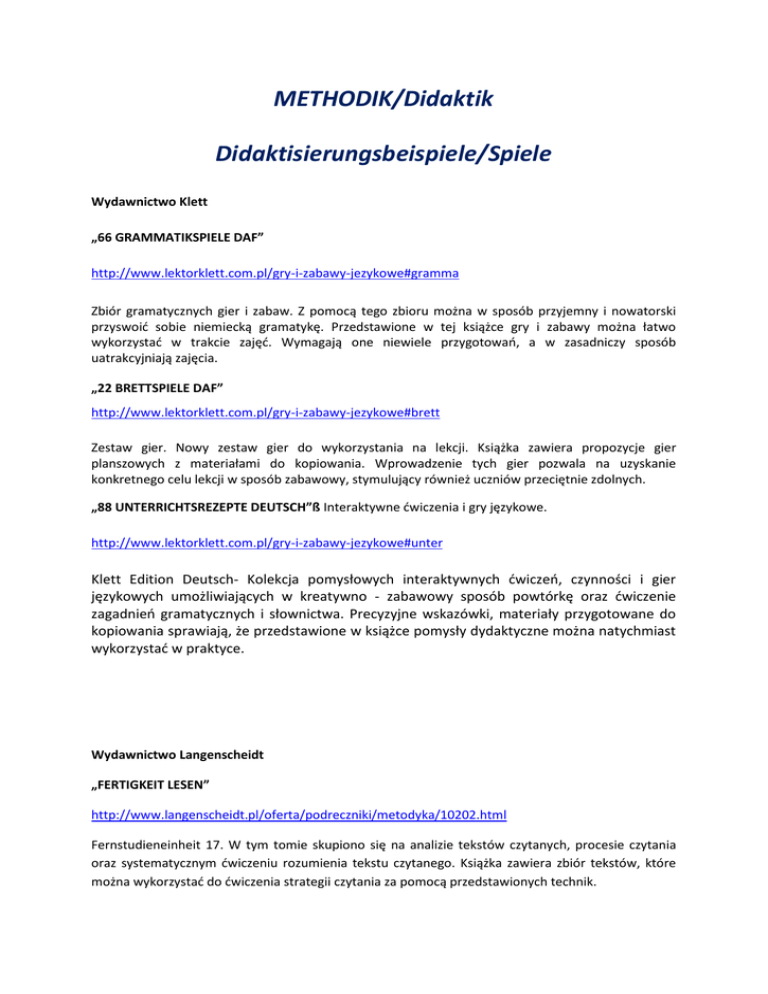 METHODIK/Didaktik Didaktisierungsbeispiele/Spiele Wydawnictwo Klett „66 GRAMMATIKSPIELE DAF” http://www.lektorklett.com.pl/gry-i-zabawy-jezykowe#gramma Zbiór gramatycznych gier i zabaw. Z pomocą tego zbioru można w sposób przyjemny i nowatorski przyswoić sobie niemiecką gramatykę. Przedstawione w tej książce gry i zabawy można łatwo wykorzystać w trakcie zajęć. Wymagają one niewiele przygotowań, a w zasadniczy sposób uatrakcyjniają zajęcia. „22 BRETTSPIELE DAF” http://www.lektorklett.com.pl/gry-i-zabawy-jezykowe#brett Zestaw gier. Nowy zestaw gier do wykorzystania na lekcji. Książka zawiera propozycje gier planszowych z materiałami do kopiowania. Wprowadzenie tych gier pozwala na uzyskanie konkretnego celu lekcji w sposób zabawowy, stymulujący również uczniów przeciętnie zdolnych. „88 UNTERRICHTSREZEPTE DEUTSCH”ß Interaktywne ćwiczenia i gry językowe. http://www.lektorklett.com.pl/gry-i-zabawy-jezykowe#unter Klett Edition Deutsch- Kolekcja pomysłowych interaktywnych ćwiczeń, czynności i gier językowych umożliwiających w kreatywno - zabawowy sposób powtórkę oraz ćwiczenie zagadnień gramatycznych i słownictwa. Precyzyjne wskazówki, materiały przygotowane do kopiowania sprawiają, że przedstawione w książce pomysły dydaktyczne można natychmiast wykorzystać w praktyce. Wydawnictwo Langenscheidt „FERTIGKEIT LESEN” http://www.langenscheidt.pl/oferta/podreczniki/metodyka/10202.html Fernstudieneinheit 17. W tym tomie skupiono się na analizie tekstów czytanych, procesie czytania oraz systematycznym ćwiczeniu rozumienia tekstu czytanego. Książka zawiera zbiór tekstów, które można wykorzystać do ćwiczenia strategii czytania za pomocą przedstawionych technik. „UNTERRICHTSBEOBACHTUNGEN UND LERNERVERHALTEN” http://www.langenscheidt.pl/oferta/podreczniki/metodyka/10210.html Fernstudieneinheit 32. Prezentacja technik ogólnej i szczegółowej hospitacji lekcji na podstawie nagrań z zajęć lekcyjnych. Są to nagrania lekcji języka niemieckiego jako obcego na różnych poziomach zaawansowania, pochodzące z różnych regionów świata i z różnych „epok” dydaktycznych. Kaseta wideo zawiera również dyskusje nauczycieli na kursach doskonalących na temat wcześniej przedstawionych fragmentów lekcji. „VIDEO IM DEUTSCHUNTERRICHT“ http://www.langenscheidt.pl/oferta/podreczniki/metodyka/10197.html Fernstudieneinheit 13. W pierwszej części omawiana jest typologia ćwiczeń do fikcyjnych przykładów filmowych i filmów fabularnych, w podziale na ćwiczenia do wykonania przed obejrzeniem fragmentu filmu, w czasie projekcji i po niej. Druga część obejmuje filmy dokumentalne, programy informacyjne oraz listy na wideo. Wszystkie fragmenty filmów nagrano na kasetę wideo towarzyszącą książce. „PODCASTS IM DEUTSCHUNTERRICHT”http://www.langenscheidt.pl/oferta/podreczniki/metodyka/podcasts_im_sprachunterricht.htm Wydawnictwo Hueber „UNTERRICHTSSPRACHE DEUTSCH”- Wörter und Wendungen für Lehrer und Schüler. http://sklep.macmillan.pl/poradniki-metodyczne-de/unterrichtssprache-deutsch-wydanie-drugie,p938-1313 Książka ta umożliwia uczącym się języka niemieckiego za granicą systematyczne zestawienie słownictwa na lekcjach. Przedstawione dialogi uwzględniają różnorodność sytuacji na lekcjach języka niemieckiego tj. praca w grupach, gry i zabawy edukacyjne, dyktanda, gramatyka, rozumienie tekstu pisanego i ze słuchu. Jest doskonałym uzupełnieniem pracy i nauki. Wydanie drugie wprowadza nowe elementy metodyki nauczania języka niemieckiego jako języka obcego. „MÄRCHEN ALS SCHREIB- UND SPRECHANLASS“ Zeszyt Instytutu Goethego z konkretnymi przykładamy dydaktyzacji bajek Braci Grimm. „ESSEN UND TRINKEN- PRIMARSTUFENMATERIALIEN“ Zeszyt Instytutu Goethego z dydaktycznymi propozycjami do tematu „Essen und Trinken“ wraz z kasetą. „MÄRCHEN LITERARISCHE- TEXTE IM DEUTSCHUNTERRICHT“- Zeszyt Instytut Goethego dotyczący 10 najpopularniejszych bajek Braci Grimm. „FRÜHES DEUTSCH? FACHZEITSCHRITF FÜR DEUTSCH ALS FREMDSPRACHE UND ZWEITSPRACHE IM PRIMARBEREICH –MUSIK“ -Zeszyt Instytutu Goethego numer 10- grudzień 2006 r. na temat muzyki. „KARIKATUREN IM DEUTSCHUNTERRICHT”- materiały Instytutu Goethego dotyczące wykorzystania karykatur na języka niemieckiego. „RYTHMUSLOKOMOTIVE”- materiały Instytutu Goethego dotyczące ćwiczeń wymowy wraz z kasetą. „DEUTSCH SPIELFILME DER 90-ER JAHREN”- materiał opracowany przez Instytut Goethego. Zbiór dydaktycznych propozycji wykorzystania filmów na lekcjach języka niemieckiego. „EUROPEJSKIE PORTFOLIO JĘZYKOWE DLA DZIECI OD 6-10” „EUROROPEK NA ZAJĘCIACH JĘZYKÓW”- PORADNIK DLA NAUCZYCIELI I RODZICOW. „EUROPEJSKIE PORTFOLIO JĘZYKOWE 10-15 WRAZ Z PRZEWODNIKIEM METODYCZNYM. EUROPEJSKIE PORTFOLIO JĘZYKOWE DLA UCZNIÓW SZKÓŁ PONADGIMNAZJALNYCH I STUDENTÓW WRAZ Z PRZEWODNIKIEM METODYCZNYM” Powyższe materiały ukazują możliwości pracy z portfolio językowym. „EUROPEJSKI SYSTEM OPISU KSZTAŁCENIA JĘZYKOWEGO”- wydawnictwo CODN. „SPRACHEN LERNEN MIT METHODE- 170 SPRACHSPIELE FÜR DEN DEUTSCH- UND FREMDSPRACHENUNTERRICHT“- materiał wydawnictwa VERLAG AN DER RUHR zawierający 170 przykładów różnorodnych gier językowych dla różnych poziomów językowych. „WEIHNACHTS- WERKTSTATT”- zbiór materiałów dotyczących tematu „Weihnachten” z konkretnymi dydaktycznymi przykładami ich wykorzystania na lekcjach języka niemieckiego. „DEUTSCH MACHT LAUNE MIT HANS HASE”- MATERIALŁ FÜR GRUNDSTUFE. Materiał do nauki języka niemieckiego z zakresu wczesnoszkolnego. „W TEJ ZABAWIE JEST METODA”- PODRECZNIK DLA PRAKTYKÓW POLSKO-NIEMIECKIEJ WYMIANY MŁODZIEŻY. „A CO ROBIMY DZISIAJ?”- ASPEKTY POLSKO-NIEMIECKIEJ SPOTKANIA MŁODZIEŻY. „UCZYĆ ŁATWIEJ”- WYDAWNICTWO PWN- biuletyn wydawnictwa PWN. „MÄRCHENWELTEN”- ZESTAW PLAKATÓW Instytutu Goethego (laminowana wersja). „RUCKSACKBI