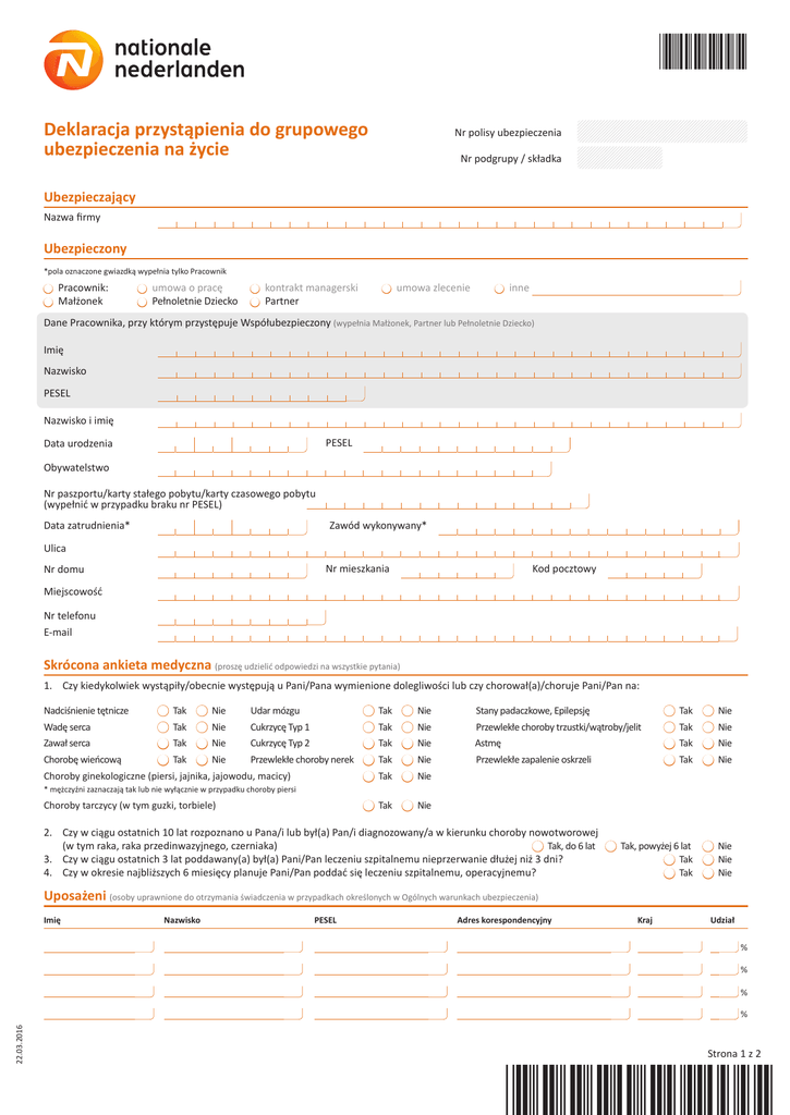 *Q009* Deklaracja przystąpienia do grupowego ubezpieczenia na życie Nr polisy ubezpieczenia Nr podgrupy / składka Ubezpieczający Nazwa firmy Ubezpieczony *pola oznaczone gwiazdką wypełnia tylko Pracownik n Pracownik: n Małżonek n umowa o pracę n Pełnoletnie Dziecko n kontrakt managerski n Partner n umowa zlecenie n inne Dane Pracownika, przy którym przystępuje Współubezpieczony (wypełnia Małżonek, Partner lub Pełnoletnie Dziecko) Imię Nazwisko PESEL Nazwisko i imię Data urodzenia Obywatelstwo PESEL Nr paszportu/karty stałego pobytu/karty czasowego pobytu (wypełnić w przypadku braku nr PESEL) Data zatrudnienia* Ulica Zawód wykonywany* Nr mieszkania Kod pocztowy Nr domu Miejscowość Nr telefonu E-mail Skrócona ankieta medyczna (proszę udzielić odpowiedzi na wszystkie pytania) 1. Czy kiedykolwiek wystąpiły/obecnie występują u Pani/Pana wymienione dolegliwości lub czy chorował(a)/choruje Pani/Pan na: Nadciśnienie tętnicze n Tak n NieUdar mózgu n Tak n NieStany padaczkowe, Epilepsję Wadę serca n Tak n NieCukrzycę Typ 1n Tak n NiePrzewlekłe choroby trzustki/wątroby/jelitn Tak n Nie Zawał serca n Tak n NieCukrzycę Typ 2 n Tak n Nie Astmę Chorobę wieńcową n Tak n NiePrzewlekłe choroby nerek n Tak n NiePrzewlekłe zapalenie oskrzeli Choroby ginekologiczne (piersi, jajnika, jajowodu, macicy) n Tak n Nie n Tak n Nie n Tak n Nie n Tak n Nie * mężczyźni zaznaczają tak lub nie wyłącznie w przypadku choroby piersi Choroby tarczycy (w tym guzki, torbiele) n Tak n Nie 2. Czy w ciągu ostatnich 10 lat rozpoznano u Pana/i lub był(a) Pan/i diagnozowany/a w kierunku choroby nowotworowej (w tym raka, raka przedinwazyjnego, czerniaka) n Tak, do 6 lat n Tak, powyżej 6 lat n Nie 3. Czy w ciągu ostatnich 3 lat poddawany(a) był(a) Pani/Pan leczeniu szpitalnemu nieprzerwanie dłużej niż 3 dni? n Tak n Nie 4. Czy w okresie najbliższych 6 miesięcy planuje Pani/Pan poddać się leczeniu szpitalnemu, operacyjnemu?n Tak n Nie 22.03.2016 Uposażeni (osoby uprawnione do otrzymania świadczenia w przypadkach określonych w Ogólnych warunkach ubezpieczenia) Imię Nazwisko PESEL Adres korespondencyjny Kraj Udział % % % % Strona 1 z 2 Oświadczenie Niniejszym zgłaszam swoje przystąpienie do ubezpieczenia i oświadczam, że: • w dniu podpisania niniejszej deklaracji przystąpienia nie przebywam na zwolnieniu lekarskim, w szpitalu, hospicjum, placówce dla przewlekle chorych oraz nie uznano w stosunku do mnie niezdolności do pracy lub niezdolności do służby orzeczeniem właściwego organu, • wszelkie podane przeze mnie dane są kompletne i zgodne z prawdą. W przypadku zatajenia lub podania nieprawdziwych danych Nationale-Nederlanden Towarzystwo Ubezpieczeń na Życie S.A. (dalej „Ubezpieczyciel”) wolne jest od odpowiedzialności zgodnie z odpowiednimi przepisami prawa, • otrzymałam(em) oraz zapoznałam(em) się z warunkami, o których stanowi Umowa ubezpieczenia zawarta pomiędzy Ubezpieczającym a Ubezpieczycielem, w tym z Ogólnymi warunkami ubezpieczenia, zakresem ochrony oraz wysokością sum ubezpieczenia przed wyrażeniem zgody na udzielenie ochrony ubezpieczeniowej oraz przed wyrażeniem zgody na finansowanie kosztu składki ubezpieczeniowej. Są mi znane wszelkie prawa i obowiązki wynikające z objęcia mnie Ubezpieczeniem, • zostałam(em) poinformowany, że administratorem danych osobowych jest Ubezpieczyciel oraz zostałem poinformowany o prawie dostępu do treści moich danych osobowych i o ich przekazywaniu zakładom reasekuracji w kraju i za granicą wyłącznie w celu wykonywania umowy ubezpieczenia jak również o tym, że obowiązek podania tych danych wynika z art. 815 Kodeksu Cywilnego, • zostałem poinformowany o przetwarzaniu moich danych osobowych, związanych z objęciem mnie Ubezpieczeniem, z wyłączeniem danych wrażliwych (dane o stanie zdrowia i nałogach) w celach marketingu bezpośredniego produktów i usług Ubezpieczyciela na podstawie art. 23 ust. 1 pkt 5 ustawy o ochronie danych osobowych oraz o możliwości wniesienia sprzeciwu wobec przetwarzania moich danych osobowych w celach marketingowych, a także możliwości wniesienia żądania zaprzestania przetwarzania danych osobowych w celach marketingowych ze względu na szczególna sytuację, • uzyskałam(em) ustne pełnomocnictwo Małżonka, Rodzica, Rodzica Małżonka, Dziecka, w tym pełnoletniego, potwierdzające wolę tej osoby/osób skorzystania z zastrzeżonej na jej/ich rzecz ochrony ubezpieczeniowej. Osoby te zostały również poinformowane o wysokościach sum ubezpieczenia. Wyrażam zgodę na: • objęcie mojego życia i zdrowia ochroną ubezpieczeniową oraz upoważniam Ubezpieczającego do wyrażania w moim imieniu wymaganej zgody na zmianę warunków zastrzeżonej na moją rzecz ochrony ubezpieczeniowej, w tym na modyfikację warunków Umowy ubezpieczenia oraz zmianę w wysokości Sum ubezpieczenia i Składki, • przetwarzanie moich danych osobowych zawartych w niniejszym wniosku oraz innych dokumentach przekazanych Ubezpieczycielowi, w tym danych o stanie zdrowia i nałogach, w celu dokonania oceny ryzyka ubezpieczeniowego, objęcia mnie Ubezpieczeniem oraz w celu jego właściwej obsługi. W przypadku nie objęcia mnie Ubezpieczeniem, mojego wystąpienia z Ubezpieczenia, rozwiązania lub wygaśnięcia Umowy Ubezpieczenia albo wypłaty świadczenia, zgadzam się na przetwarzanie moich danych w celach archiwalnych. Zgoda obejmuje także przetwarzanie moich danych w przyszłości pod warunkiem, że nie zmieni się cel przetwarzania, • przekazywanie moich danych osobowych związanych z objęciem mnie Ubezpieczeniem (w tym danych o stanie zdrowia i nałogach) zawartych w niniejszym wniosku oraz innych dokumentach dotyczących umowy ubezpieczenia Ubezpieczycielowi, za pośrednictwem Ubezpieczającego, • występowanie Ubezpieczyciela do podmiotów leczniczych, o których mowa w art. 4 ustawy z dnia 15 kwietnia 2011 r. o działalności lecznicz
