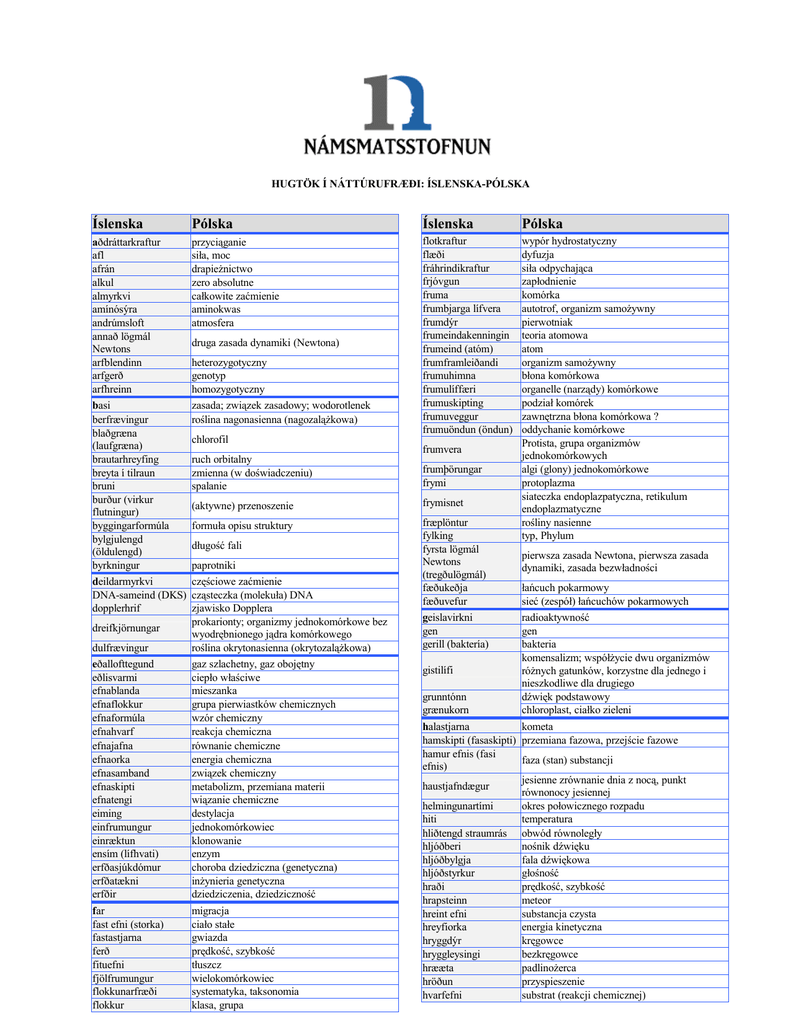 HUGTÖK Í NÁTTÚRUFRÆÐI: ÍSLENSKA-PÓLSKA Íslenska Pólska Íslenska Pólska aðdráttarkraftur afl afrán alkul almyrkvi amínósýra andrúmsloft annað lögmál Newtons arfblendinn arfgerð arfhreinn basi berfrævingur blaðgræna (laufgræna) brautarhreyfing breyta í tilraun bruni burður (virkur flutningur) byggingarformúla bylgjulengd (öldulengd) byrkningur deildarmyrkvi DNA-sameind (DKS) dopplerhrif przyciąganie siła, moc drapieżnictwo zero absolutne całkowite zaćmienie aminokwas atmosfera flotkraftur flæði fráhrindikraftur frjóvgun fruma frumbjarga lífvera frumdýr frumeindakenningin frumeind (atóm) frumframleiðandi frumuhimna frumulíffæri frumuskipting frumuveggur frumuöndun (öndun) wypór hydrostatyczny dyfuzja siła odpychająca zapłodnienie komórka autotrof, organizm samożywny pierwotniak teoria atomowa atom organizm samożywny błona komórkowa organelle (narządy) komórkowe podział komórek zawnętrzna błona komórkowa ? oddychanie komórkowe Protista, grupa organizmów jednokomórkowych algi (glony) jednokomórkowe protoplazma siateczka endoplazpatyczna, retikulum endoplazmatyczne rośliny nasienne typ, Phylum dreifkjörnungar dulfrævingur eðallofttegund eðlisvarmi efnablanda efnaflokkur efnaformúla efnahvarf efnajafna efnaorka efnasamband efnaskipti efnatengi eiming einfrumungur einræktun ensím (lífhvati) erfðasjúkdómur erfðatækni erfðir far fast efni (storka) fastastjarna ferð fituefni fjölfrumungur flokkunarfræði flokkur druga zasada dynamiki (Newtona) heterozygotyczny genotyp homozygotyczny zasada; związek zasadowy; wodorotlenek roślina nagonasienna (nagozalążkowa) chlorofil ruch orbitalny zmienna (w doświadczeniu) spalanie frumvera frumþörungar frymi (aktywne) przenoszenie frymisnet formuła opisu struktury fræplöntur fylking fyrsta lögmál Newtons (tregðulögmál) fæðukeðja fæðuvefur geislavirkni gen gerill (baktería) długość fali paprotniki częściowe zaćmienie cząsteczka (molekuła) DNA zjawisko Dopplera prokarionty; organizmy jednokomórkowe bez wyodrębnionego jądra komórkowego roślina okrytonasienna (okrytozalążkowa) gaz szlachetny, gaz obojętny ciepło właściwe mieszanka grupa pierwiastków chemicznych wzór chemiczny reakcja chemiczna równanie chemiczne energia chemiczna związek chemiczny metabolizm, przemiana materii wiązanie chemiczne destylacja jednokomórkowiec klonowanie enzym choroba dziedziczna (genetyczna) inżynieria genetyczna dziedziczenia, dziedziczność migracja ciało stałe gwiazda prędkość, szybkość tłuszcz wielokomórkowiec systematyka, taksonomia klasa, grupa gistilífi grunntónn grænukorn pierwsza zasada Newtona, pierwsza zasada dynamiki, zasada bezwładności łańcuch pokarmowy sieć (zespół) łańcuchów pokarmowych radioaktywność gen bakteria komensalizm; współżycie dwu organizmów różnych gatunków, korzystne dla jednego i nieszkodliwe dla drugiego dźwięk podstawowy chloroplast, ciałko zieleni halastjarna kometa hamskipti (fasaskipti) przemiana fazowa, przejście fazowe hamur efnis (fasi faza (stan) substancji efnis) jesienne zrównanie dnia z nocą, punkt haustjafndægur równonocy jesiennej helmingunartími okres połowicznego rozpadu hiti temperatura hliðtengd straumrás obwód równoległy hljóðberi nośnik dźwięku hljóðbylgja fala dźwiękowa hljóðstyrkur głośność hraði prędkość, szybkość hrapsteinn meteor hreint efni substancja czysta hreyfiorka energia kinetyczna hryggdýr kręgowce hryggleysingi bezkręgowce hrææta padlinożerca hröðun przyspieszenie hvarfefni substrat (reakcji chemicznej) Íslenska Pólska Íslenska Pólska hvatberi hýsill innri reikistjörnur jafnheitt dýr jafnskipting (mítósa) jafnstraumur jarðmiðjukenningin jarðskin jónir keðjuverkun kenning kjarnahimna kjarnaklofnun kjarnakorn kjarni kjarnorka kjarnsýra kjörbýli (búsvæði) knýr (spyrna) kolefni koltvíoxíð kraftur kvarki kvartilaskipti kynblendingur kynbætur kynhreinn kynlaus æxlun kynlitningur kyntengdur kynæxlun langsbylgja leysikorn litagreining litningur litróf líffélag líffærakerfi líffæri lífrænt efnasamband lífvera ljósár ljósbrot ljóseind ljóstillífun lofthjúpur loftmótstaða loftsteinn lofttegund (gas) lotukerfið lotur lyftikraftur lögmál lögmál Arkimedesar lögmál Bernoullis massatala massi málmar melting metrakerfi Miklihvellur misheitt dýr mitochondria żywiciel (pasożyta) planety wewnętrzne Układu Słonecznego zwierzę stałocieplne mitoza, podział średni komórki prąd stały teoria geocentryczna światło Słońca odbite od Ziemi jony reakcja łańcuchowa teoria powłoka jądra komórki rozszczepienie jądra atomowego jąderko jądro energia jądrowa (atomowa) kwas nukleinowy naturalne siedlisko, środowisko ciąg, siła ciągu węgiel dwutlenek węgla siła kwark fazy (księżyca) mieszaniec, hybryd udoskonalanie struktury genetycznej homozygotyczny rozmnażanie bezpłciowe chromosom płciowy związany z płcią rozmnażanie drogą płciową fala podłużna lizosomy kolorymetria, analiza kolorymetryczna chromosom spektrum, widmo biocenoza system (zespół) organów wewnętrznych organ, narząd ziwązek organiczny organizm rok świetlny refrakcja, załamanie (promieniowania) foton fotosynteza atmosfera opór powietrza meteoryt gaz układ okresowy (pierwiastków) okres siła wyporu, wypór (hydrostatyczny) prawo prawo Archimedesa twierdzenie Bernoulliego liczba masowa masa metale trawienie system metryczny Wielki Wybuch zwierzę zmiennocieplne myndefni möndull möndulsnúningur náttúruval neytandi nifteind nitur núningur næringarnám produkt (reakcji chemicznej) oś obrót wokół osi selekcja naturalna konsument neutron azot tarcie przyjmowanie pokarmu okfruma orka orkupíramídi osmósa oxun óðal ófrumbjarga lífvera ólífrænt efnasamband prótín raðtengd straumrás rafeind rafeindahýsing rafleiðni rafmagn raforka rafsegulbylgja rafsegulorka rafsegulróf