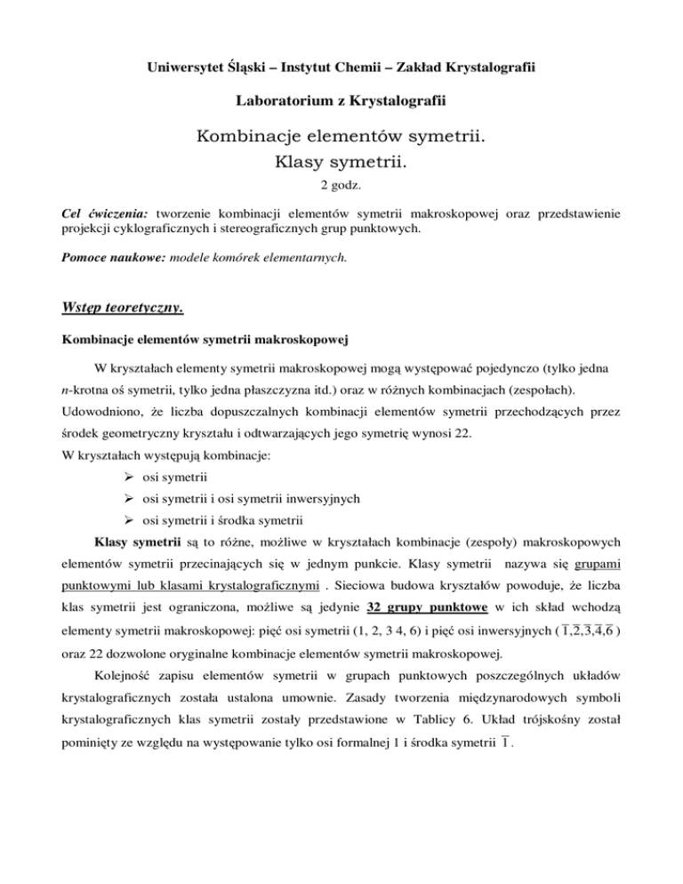 Uniwersytet Śląski – Instytut Chemii – Zakład Krystalografii Laboratorium z Krystalografii Kombinacje elementów symetrii. Klasy symetrii. 2 godz. Cel ćwiczenia: tworzenie kombinacji elementów symetrii makroskopowej oraz przedstawienie projekcji cyklograficznych i stereograficznych grup punktowych. Pomoce naukowe: modele komórek elementarnych. Wstęp teoretyczny. Kombinacje elementów symetrii makroskopowej W kryształach elementy symetrii makroskopowej mogą występować pojedynczo (tylko jedna n-krotna oś symetrii, tylko jedna płaszczyzna itd.) oraz w różnych kombinacjach (zespołach). Udowodniono, że liczba dopuszczalnych kombinacji elementów symetrii przechodzących przez środek geometryczny kryształu i odtwarzających jego symetrię wynosi 22. W kryształach występują kombinacje: osi symetrii osi symetrii i osi symetrii inwersyjnych osi symetrii i środka symetrii Klasy symetrii są to różne, możliwe w kryształach kombinacje (zespoły) makroskopowych elementów symetrii przecinających się w jednym punkcie. Klasy symetrii nazywa się grupami punktowymi lub klasami krystalograficznymi . Sieciowa budowa kryształów powoduje, że liczba klas symetrii jest ograniczona, możliwe są jedynie 32 grupy punktowe w ich skład wchodzą elementy symetrii makroskopowej: pięć osi symetrii (1, 2, 3 4, 6) i pięć osi inwersyjnych ( 1 ,2, 3,4,6 ) oraz 22 dozwolone oryginalne kombinacje elementów symetrii makroskopowej. Kolejno ść zapisu elementów symetrii w grupach punktowych poszczególnych układów krystalograficznych została ustalona umownie. Zasady tworzenia międzynarodowych symboli krystalograficznych klas symetrii zostały przedstawione w Tablicy 6. Układ trójskośny został pominięty ze względu na występowanie tylko osi formalnej 1 i środka symetrii 1 . Kombinacje osi symetrii Istnieje 6 dopuszczalnych trójek przecinających się osi właściwych: Tablica 1. Grupy osi symetrii i kąty między poszczególnymi osiami Lp. Układ X Y Z X^Y X^Z Y^Z krystalograficzny 1 rombowy 2 2 2 900 900 900 2 trygonalny 3 2 2 900 900 600 3 tetragonalny 4 2 2 900 900 450 4 heksagonalny 6 2 2 900 900 300 5 regularny 4 3 2 54044’ 450 35016’ 6 regularny 2 3 3 54044’ 54044’ 70032’ Kombinacje osi symetrii i osi inwersyjnych Dopuszczalne kombinacje osi symetrii właściwych z osiami inwersyjnymi otrzymuje się przez zamianę dwóch parzystokrotnych osi symetrii na osie inwersyjne. W rezultacie otrzymujemy 7 nowych kombinacji elementów symetrii. Tablica 2. Grupy elementów symetrii powstałe z kombinacji osi symetrii i osi inwersyjnych Lp. Układ Kombinacje osi symetrii krystalograficzny Kombinacje osi symetrii i osi inwersyjnych 1 rombowy 222 mm2 ( 2 2 2) 2 trygonalny 32 3m (3 2 ) 3 tetragonalny 422 4mm (4 2 2 ) 4 tetragonalny 422 4 2m ( 4 2 2 ) 5 heksagonalny 622 6mm (6 2 2 ) 6 heksagonalny 622 6 m2 ( 6 2 2) 7 regularny 432 4 3m ( 4 3 2 ) Kombinacje osi symetrii i środka symetrii I. Jeżeli środek symetrii leży na osiach parzystokrotnych, to przez ten środek symetrii muszą przechodzić również płaszczyzny symetrii prostopadłe do tych osi. Tablica 3. Kombinacje parzystokrotnych osi symetrii i środka symetrii Lp. Układ krystalograficzny Oś symetrii Kombinacje parzystokrotnych osi symetrii i środka symetrii 2 1 jednoskośny 2 2 tetragonalny 4 3 heksagonalny 6 m 4 m 6 m II. Jeżeli środek symetrii leży na osiach nieparzystokrotnych, to osie te staną się osiami inwersyjnymi. W tej kombinacji nie uzyskuje się oryginalnych zespołów elementów symetrii. Tablica 4. Kombinacje nieparzystokrotnych osi symetrii i środka symetrii Lp. Układ krystalograficzny Oś symetrii Kombinacje nieparzystokrotnych osi symetrii i środka symetrii 1 2 trójskośny trygonalny 1 3 1 3 III. Jeżeli środek symetrii doda się do punktu przecięcia osi symetrii w dozwolonych kombinacjach trójek osi, to w stosunku do osi parzystokrotnych musi wystąpić prostopadła płaszczyzna symetrii, osie 3 staną się osiami inwersyjnymi. Tablica 5. Kombinacje zespołu osi symetrii i środka symetrii Lp. Układ krystalograficzny Kombinacje osi symetrii Kombinacje zespołu osi symetrii i środka symetrii 1 rombowy 222 2 2 2 (mmm)* mmm 2 trygonalny 32 3 2 ( 3 m) m * 3 tetragonalny 422 4 2 2 4 ( mm) mmm m 4 heksagonalny 622 6 2 2 6 ( mm) mmm m 5 regularny 432 4 2 3 m m 6 regularny 23 W nawiasach podano skrócone symbole grup punktowych! (m3m) 2 3 (m3) m Tablica 6. Zasady tworzenia międzynarodowych symboli krystalograficznych klas symetrii Układ krystalograficzny Grupa punktowa Jednoskośny 2 2 ║do osi Y m m ⊥ do osi Y 2/m 2 ║ i m ⊥ do osi Y 222 Rombowy Tetragonalny Heksagonalny Trygonalny Regularny Pozycja w symbolu 2 3 2 ║ do osi X 2 ║ do osi Y 2 ║ do osi Z mm2 m ⊥ do osi X m ⊥ do osi Y 2 ║ do osi Z 2/m2/m2/m 2 ║ i m ⊥ do osi X 2 ║ i m ⊥ do osi Y 2 ║ i m ⊥ do osi Z 4 4 ║ do osi Z 4 4 ║ do osi Z 4/m 4 ║ i m ⊥ do osi Z 422 4 ║ do osi Z dwie osie 2 ║ do osi X, Y dwie osie 2 ║ do <110> 4mm 4 ║ do osi Z dwie m ⊥ do osi X, Y dwie m ⊥ do <110> 4 2m 4 ║ do osi Z dwie osie 2 ║ do osi X, Y dwie m ⊥ do <110> 4/m2/m2/m 4 ║ i m ⊥ do osi Z dwie osie 2 ║ i dwie m ⊥ do osi X, Y dwie osie 2 ║ i dwie m ⊥ do <110> 6 6 ║ do osi Z 6 6 ║ do osi Z 6/m 6 ║ i m ⊥ do osi Z 622 6 ║ do osi Z trzy 2 ║ do osi X, Y ,U trzy osie 2 ║ do <110> 6mm 6 ║ do osi Z trzy m ⊥ do osi X, Y, U trzy m ⊥ do <110> 6m2 6 ║ do osi Z trzy m ⊥ do osi X, Y, U trzy osie 2 ║ do <110> 6/m2/m2/m 6 ║ i m ⊥ do osi Z trzy osie 2 ║ i trzy m ⊥ do osi X, Y, U trzy osie 2 ║ i trzy m ⊥ do <110> 3 3 ║ do osi Z 3 3 ║ do osi Z 32 3 ║ do osi Z trzy 2 ║ do osi X, Y ,U 3m 3 ║ do osi Z trzy m ⊥ do osi X, Y, U 3 2/m 3 ║ do osi Z trzy osie 2 ║ i trzy m ⊥ do osi X, Y, U 432 trzy osie 4 ║ do osi X, Y, Z cztery osie 3 ║ do <111> sześć osi 2 ║ do <110> 4 3m trzy osie 4 ║ do osi X, Y, Z cztery osie 3 ║ do <111> sześć m ⊥ do