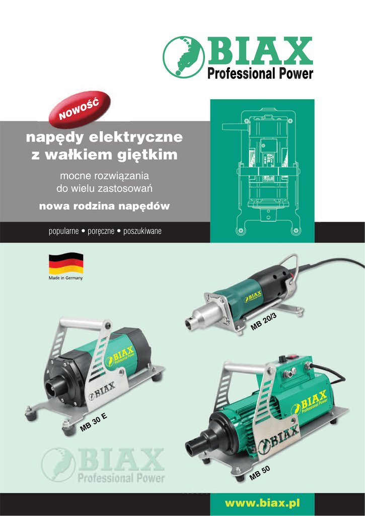 ŚĆ O W NO napędy elektryczne z wałkiem giętkim mocne rozwiązania do wielu zastosowań nowa rodzina napędów popularne · poręczne · poszukiwane MB MB 30 /3 20 E MB 50 www.biax.pl wysokoobrotowy kompaktowy napęd do precyzyjnych prac nowy napęd MB 20/3 W oparciu o nasze blisko trzydziestoletnie doświadczenia ze sprawdzonymi i udanymi poprzednimi modelami napędów elektrycznych z wałkiem giętkim, wprowadzamy na rynek nowy atrakcyjny model MB 20/3 jako ulepszonego następcę modelu MB 20/2. Model ten jest przeznaczony szczególnie do wytwarzania (wykańczania) form, oprzyrządowania i do mechaniki precyzyjnej, np. w narzędziowniach czy wydziałach remontowych i utrzymania ruchu. Wyróżnia się korzystną ceną oraz niskimi kosztami obsługi i eksploatacji. najlepszy napęd MB 20 jaki kiedykolwiek był; co w nim nowego? MB 20/3 • wyższe obroty: do 34.000 obr/min do dokładniejszej, wydajniejszej obróbki • silnik elektryczny zatrzymuje się samoczynnie przy przeciążeniu • ponowne uruchomienie silnika przy zapewnieniu wysokiego bezpieczeństwa pracy. Zabezpieczenie przed samoczynnym uruchomieniem silnika po ustaniu zaniku zasilania • wydłużona trwałość silnika dzięki optymalnemu zabezpieczeniu przed pyłem i kurzem • nowa bardziej kompaktowa konstrukcja, lżejsza o ok. 0,3 kg dzięki nowej obudowie korzystny w zakupie i eksploatacji - bezpieczny w obsłudze poprawianie − kształtowanie spawów • korzystny cenowo, wszechstronny napęd w solidnej obudowie z tworzywa sztucznego • automatyczne odcięcie zasilania w przypadku zużycia szczotek silnika • „soft start” – płynny, łagodny rozruch silnika • stopień ochrony: IP 20, klasa ochrony: II specjalnie przeznaczony do różnorodnych zastosowań przy wykonywaniu form • stałe obroty pod obciążeniem • możliwość zastosowania różnych szybkowymiennych końcówek roboczych do frezowania, szlifowania, polerowania, szczotkowania, fazowania czy piłowania usuwanie osadu, nagaru i innych nalotów • urządzenie może pracować w pozycji wolnostojącej albo wiszącej szybkowymienne końcówki robocze do MB 20/3 i MB 30 E niwelacja śladów (rowków) po frezowaniu końcówka prosta końcówka kątowa 45° końcówka kątowa 90° KGS 27 – 020 017 610 W 627−45 – 020 000 615 W 627 – 020 000 610 opis zakres obrotów, [obr/min] moc (wejściowa/użyteczna), [W] masa (bez wałka i końcówki), [kg] zasilanie [V/Hz] podłączenie wałka gratowanie − fazowanie pasujące wałki giętkie* MB 20/3 zmienne 13.000 ÷ 34.000 710/430 2,6 230/50−60 kwadrat HW 27 (030 097 100), rdzeń Ø6 mm, długość 1,5 m * inne wałki giętkie, końcówki robocze i akcesoria – na życzenie potężny i wszechstronny nowy napęd MB 30 E Frezowanie, szlifowanie, szczotkowanie, polerowanie czy piłowanie – a wszystko w jednym urządzeniu! Ten niezwykle mocny napęd Multi-BIAX zapewnia najlepsze wyniki prac w różnych zastosowaniach. Oprócz niskich kosztów eksploatacji, urządzenie wyróżnia się najwyższym stopniem komfortu i bezpieczeństwa pracy. Przeznaczone jest niemal dla wszystkich gałęzi przemysłu najlepsze wyniki prac dzięki cyfrowej elektronice sterującej (bez czujników), która zapewnia: MB 30 E na stoliku • stały, wysoki moment obrotowy w zakresie 5.000 ÷ 15.000 obr/min • stałe obroty przy zmiennym obciążeniu • odzyskiwanie rezerw mocy; przy maksymalnym obciążeniu, dostarczanie nawet do 1,5 kW mocy szczytowej. • powyżej 1,5 kW - dzięki elektronicznemu zabezpieczeniu przed przeciążeniem urządzenie zostaje samoczynnie zatrzymane • brak pulsacji obrotów w niskim zakresie • zapewnia gładszą, równą powierzchnię obrabianą niskie koszty eksploatacji i brak niepotrzebnych przestojów • ochrona silnika przed przeciążeniem poprzez automatyczne wyłączenie • automatyczne odcięcie zasilania w przypadku zużycia szczotek silnika frezowanie • brak przekładni - mniejsze zużycie części mechanicznych • całkowicie zabudowana bezczujnikowa elektronika w pełni zabezpieczona przed brudem, pyłem i wiórami • ogranicznik prądu rozruchowego zapobiega przepięciom i chroni silnik najwyższy osiągalny poziom bezpieczeństwa i komfortu pracy • tylko 75 dB (A) (zgodnie z EN 60745) jest znacznie cichszy niż porównywalne urządzenia. W wielu przypadkach eliminuje to konieczność ochrony słuchu • bardzo niska masa w tej klasie urządzeń, co zwiększa mobilność czy łatwość przenoszenia i obsługi • możliwość zastosowania różnych szybkowymiennych końcówek roboczych do frezowania, szlifowania, polerowania, szczotkowania, fazowania czy piłowania • urządzenie może pracować w pozycji wolnostojącej albo wiszącej • „soft start” – płynny, łagodny rozruch silnika • stopień ochrony: IP 20, klasa ochrony: II szybkowymienne końcówki robocze do MB 20/3 i MB 30 E końcówka taśmowa pilarka HB 1527 – 020 014 810 FR 5−827 – 020 000 730 opis obroty, [obr/min] MB 30 E zmienne 5.000 ÷ 15.000 moc (wejściowa/użyteczna), [W] 1300/900 masa (bez wałka i końcówki), [kg] 5,2 zasilanie [V/Hz] podłączenie wałka pasujące wałki giętkie* 230/50−60 M10 / 30 połączenie gwintowe DV 6 (032 004 200−1), rdzeń Ø6 mm, długość 1,5 m * inne wałki giętkie, końcówki robocze i akcesoria – na życzenie szczotkowanie największy napęd do ekstremalnych zastosowań nowy napęd MB 50 przeznaczony do umiarkowanego i zgrubnego/ciężkiego i frezowania przy wytwarzaniu narzędzi i form, również do oczyszczania i szczotkowania odlewów, produkcji zbiorników, beczek (np. kegów do piwa), konstrukcji stalowych oraz w mechanicznych. szlifowania gratowania, pojemników, warsztatach najlżejsze kompaktowe urządzenie w swojej klasie, przeznaczone do najpoważniejszych i najtrudniejszych zadań • najlepszy stosunek mocy do masy 1,9 kW przy 21,7 kg • bardzo mocny, trwały silnik asynchroniczny („continuous runner”) o wysokiej sprawno