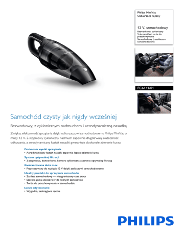 Philips MiniVac Odkurzacz ręczny 12 V, samochodowy Bezworkowy, cykloniczny 5 akcesoriów i torba do przechowywania Samochodowy (z zasilaczem samochodowym) FC6141/01 Samochód czysty jak nigdy wcześniej Bezworkowy, z cyklonicznym nadmuchem i aerodynamiczną nasadką Zwiększ efektywność sprzątania dzięki odkurzaczowi samochodowemu Philips MiniVac o mocy 12 V. 2-stopniowy cykloniczny nadmuch zapewnia długotrwałą skuteczność odkurzania, a aerodynamiczny kształt nasadki gwarantuje doskonałe zbieranie kurzu. Doskonałe wyniki sprzątania • Aerodynamiczny kształt nasadki zapewnia lepsze zbieranie kurzu System optymalnej filtracji • 2-stopniowa, bezworkowa komora cykloniczna zapewnia optymalną filtrację Gwarantowana duża moc • Przystosowany do napięcia 12 V dzięki zasilaczowi samochodowemu Idealny produkt do sprzątania samochodu • Zasilacz samochodowy — nieograniczony czas pracy • Szeroka gama akcesoriów do różnych zastosowań • Torba do przechowywania w samochodzie Łatwe użytkowanie • Wygodna, zaokrąglona rączka FC6141/01 Odkurzacz ręczny 12 V, samochodowy Bezworkowy, cykloniczny, 5 akcesoriów i torba do przechowywania, Samochodowy (z zasilaczem samochodowym) Zalety 2-stopniowy, bezworkowy, cykloniczny wyposażony w zasilacz samochodowy, dzięki któremu można odkurzać nawet najtrudniej dostępne miejsca w aucie bez konieczności ładowania urządzenia. W związku z tym odkurzacz jest zawsze gotowy do użycia! Wygodny uchwyt Dane techniczne Wzornictwo • Kolor: Głęboka czerń ze srebrnymi dodatkami • Stylistyka: Przezroczysta komora na kurz Wydajność • • • • • Poziom hałasu (Lc IEC): 81 dB Nadmuch (maks.): 840 l/min Moc wejściowa (maks.): 120 W Moc ssania (maks.): 22 W Podciśnienie (maks.): 4,2 kPa Filtracja • System filtracji: 2-stopniowy, cykloniczny nadmuch • Pojemność na kurz: 0,5 l Cykloniczny nadmuch odkurzacza bezworkowego zatrzymuje kurz wewnątrz urządzenia oraz zapewnia dużą moc ssania i długotrwałą skuteczność sprzątania. Dwustopniowy system filtracji uniemożliwia wydostawanie się kurzu z powrotem na zewnątrz. Pierwszy filtr zatrzymuje większość brudu, a drugi filtr wyłapuje jego mniejsze cząsteczki. Aerodynamiczny kształt nasadki Parametry użytkowe • Funkcje specjalne: Wskaźnik ładowania, Miękki w dotyku uchwyt Nasadki i akcesoria Miniodkurzacz firmy Philips ma rączkę w kształcie pętli, która zapewnia pewny uchwyt. Miniodkurzacz można chwycić w dowolny sposób. Delikatna gumowa powłoka umożliwia mocny uchwyt. Szeroka gama akcesoriów Aerodynamiczny kształt nasadki odkurzacza Philips MiniVac został stworzony z myślą o dokładnym zbieraniu nawet najmniejszych cząsteczek kurzu. Ergonomiczna nasadka pomaga czyścić nawet bardzo trudno dostępne miejsca. Czyszczenie wszystkich miejsca w samochodzie Do odkurzacza Philips MiniVac dołączono szeroką gamę akcesoriów, dzięki którym można przy minimalnym wysiłku posprzątać domu i samochód. Odkurzacz jest wyposażony w małą i dużą szczotkę, małą i dużą szczelinówkę oraz długą rurę, które doskonale sprawdzają się podczas odkurzania nawet trudno dostępnych miejsc. Jest to idealne połączenie do sprzątania w domu i w samochodzie! Torba Odkurzacz Philips MiniVac nadaje się idealnie do sprzątania w samochodzie, ponieważ jest Torba do przechowywania umożliwia trzymanie wszystkich akcesoriów i zasilacza samochodowego w jednym miejscu, aby w każdej chwili mieć pod ręką narzędzia potrzebne do wyczyszczenia samochodu! Data wydania 2014-05-30 © 2014 Koninklijke Philips N.V. Wszelkie prawa zastrzeżone. Wersja: 9.1.1 Dane techniczne mogą ulec zmianie bez powiadomienia. Znaki towarowe są własnością Koninklijke Philips N.V. lub własnością odpowiednich firm. EAN: 08 71010 35880 16 www.philips.com • Akcesoria: Szczelinówka, Szczotka, Duża szczotka, Długa szczelinówka • Pozostałe akcesoria: Elastyczny wąż, Zasilacz samochodowy, Torba •
