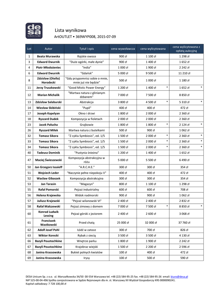 Lista wynikowa ArtOUTLET • 369WYP008, 2015-07-09 cena wylicytowana z opłatą aukcyjną Lot Autor Tytuł i opis cena wywoławcza cena wylicytowana 1 Beata Murawska Rajskie owoce 900 zł 1 100 zł 1 298 zł 3 Edward Dwurnik "Duże ogórki, małe dynie" 900 zł 1 400 zł 1 652 zł 4 Piotr Młodożeniec "India" 1 000 zł 1 900 zł 2 242 zł 6 Edward Dwurnik "Gdańsk" 5 000 zł 9 500 zł 11 210 zł 8 Zdzisław (Otello) Horodecki "Gdy przypomnisz sobie o mnie, mnie już nie będzie" 500 zł 1 000 zł 1 180 zł 11 Jerzy Truszkowski "Good Mistic Power Energy" 1 200 zł 1 400 zł 12 Marian Michalik "Martwa natura z glinianym dzbanem" 7 000 zł 7 500 zł 13 Zdzisław Salaburski Abstrakcja 3 800 zł 4 500 zł 14 Wiesław Skibiński "Pupil" 400 zł 400 zł 472 zł 17 Joseph Kapelyan Okno i drzwi 1 800 zł 2 000 zł 2 360 zł 18 Ryszard Dudek Kompozycja w fioletach 2 000 zł 2 000 zł 2 360 zł 23 Jacek Pałucha Grajkowie 1 800 zł 1 800 zł 26 Ryszard Miłek Martwa natura z butelkami 500 zł 900 zł 32 Tomasz Sikora "Z cyklu Symbiosis", ed. 1/5 1 500 zł 2 000 zł * 2 360 zł * 33 Tomasz Sikora "Z cyklu Symbiosis", ed. 1/5 1 500 zł 2 000 zł * 2 360 zł * 34 Tomasz Sikora "Z cyklu Symbiosis", ed. 1/5 1 500 zł 2 000 zł * 2 360 zł * 40 Tadeusz Dominik "Pustynia śnieżna" 1 200 zł 1 400 zł 1 652 zł 47 Maciej Świeszewski Kompozycja abstrakcyjna w różu 5 000 zł 5 500 zł 6 490 zł 50 Jan Grzegorz Issaieff "A.R.C.H.E." 300 zł 300 zł 354 zł 51 Wojciech Leder "Naczynie pełne niepokoju V" 400 zł 400 zł 472 zł 52 Wacław Gibaszek Kompozycja abstrakcyjna 300 zł 300 zł 354 zł 53 Jan Tarasin "Magazyn" 800 zł 1 100 zł 1 298 zł 55 Rafał Pomorski Pejzaż industrialny 600 zł 600 zł 708 zł 56 Helena Krajewska Widok nadmorski 900 zł 900 zł 1 062 zł 57 Juliusz Krajewski "Pejzaż wilanowski VI" 2 400 zł 2 400 zł 2 832 zł 58 Rafał Malczewski Pejzaż zimowy z domem 7 000 zł 7 500 zł 60 Konrad Ludwik Lessing Pejzaż górski z jeziorem 2 400 zł 2 600 zł 3 068 zł 61 Franciszek Wastkowski Przed chatą 25 000 zł 32 000 zł 37 760 zł 62 Adolf Josef Pohl Łódź w zatoce 300 zł 700 zł 826 zł 63 Wiktor Korecki Rybak z siecią 3 500 zł 3 500 zł 4 130 zł 66 Bazyli Poustochkine Wnętrze parku 1 800 zł 1 900 zł 2 242 zł 67 Bazyli Poustochkine Krajobraz wiejski 1 500 zł 2 200 zł 2 596 zł 68 Janina Krassowska Bukiet polnych kwiatów 100 zł 400 zł 472 zł 69 Janina Krassowska Irysy 100 zł 500 zł 590 zł * 1 652 zł * 8 850 zł * * 5 310 zł 2 124 zł * * 1 062 zł * 8 850 zł DESA Unicum Sp. z o.o. ul. Marszałkowska 34/50 00-554 Warszawa tel. +48 (22) 584-95-25 fax. +48 (22) 584-95-26 email: [email protected] NIP 525-00-04-496 Spółka zarejestrowana w Sądzie Rejonowym dla m. st. Warszawy XII Wydział Gospodarczy KRS 0000090241. Kapitał zakładowy: 7 728 100,00 zł * Lista wynikowa ArtOUTLET • 369WYP008, 2015-07-09 72 Malarz zachodnioeuropejski Oblężenie Sewastopola, epizod z wojny krymskiej 1853–1856 10 000 zł 10 000 zł 74 Nieznany Scena orientalna 300 zł 500 zł 77 Zygmunt Schreter Autoportret przy sztaludze 8 000 zł 8 500 zł 81 Irena Weissowa (Aneri) "Dziewczynka na błękitnym tle" 2 400 zł 2 600 zł * 11 800 zł * 590 zł * 10 030 zł * 3 068 zł 83 Wlastimil Hofman Dwoje dzieci (szkic) 1 000 zł 1 000 zł * 1 180 zł * 86 Zdzisław Suchodolski Martwa natura z dzbanem 2 800 zł 2 800 zł * 3 304 zł * 88 Feliks Franicz Szwoleżer 2 400 zł 2 600 zł 3 068 zł 94 Aldolf Zawadowski Siedząca kobieta 100 zł 150 zł 177 zł Akt na krześle 200 zł 200 zł 236 zł Chłopcy okradający sad 400 zł 700 zł 826 zł 95 96 Stanisław Sawiczewski Według George'a Morlanda 98 Jerzy Hoppen Katedra wileńska 300 zł 500 zł 590 zł 101 Nieznany Pejzaż z drogą 100 zł 300 zł 354 zł 102 Louis Neillot Most w Bellevue - Meudon 25 000 zł 26 000 zł 106 Anders AndersenLundby Skaliste nadbrzeże 6 000 zł 6 000 zł 107 Roman Kazimierz Kochanowski Sianokosy 8 000 zł 8 500 zł 113 Dzban na wodę 2 200 zł 2 400 zł 2 832 zł 115 Puszka na herbatę 400 zł 600 zł 708 zł Puchar w formie winnego grona 5 000 zł 6 000 zł 7 080 zł 120 Łyżeczka do pruszu herbacianego 100 zł 300 zł 354 zł 121 Łyżeczka do soli 100 zł 100 zł 118 zł Wazonik 700 zł 700 zł 826 zł Para łyżeczek do przypraw 100 zł 300 zł 354 zł Pudełko na tabakę 2 400 zł 5 000 zł 5 900 zł 128 Puderniczka 200 zł 200 zł 236 zł 129 Pudełko na zapałki 200 zł 200 zł 236 zł 131 Łopatka do szparagów 200 zł 200 zł 236 zł 133 Widelec 'wzór egipski' 100 zł 100 zł 118 zł 134 Popielniczka w stylu art deco 500 zł 700 zł 826 zł 139 Lampa podłogowa w typie projektów Edgara Brandta (1880 - 1960) 1 000 zł 1 200 zł 1 416 zł 141 Cztery kinkiety w typie Księstwa Warszawskiego 700 zł 700 zł 826 zł Kubek kiduszowy 300 zł 300 zł 354 zł Popielniczka z figurą Mefista 200 zł 300 zł 354 zł 119 122 Johannes Claus Aage Weimar 125 126 Iwan Pietrowicz Chlebnikov 142 143 A. Titze * 30 680 zł * 7 080 zł * 10 030 zł DESA Unicum Sp. z o.o. ul. Marszałkowska 34/50 00-554 Warszawa tel. +48 (22) 584-95-25 fax. +48 (22) 584-95-26 email: [email protected] NIP 525-00-04-496 Spółka zarejestrowana w Sądzie Rejonowym dla m. st. Warszawy XII Wydział Gospodarczy KRS 0000090241. Kapitał zakładowy: 7 728 100,00 zł * Lista wynikowa ArtOUTLET • 369WYP008, 2015-07-09 149 Misa 100 zł 100 zł 118 zł 152 Szabla polska podoficerska wz. 21/22 5 000 zł 6 500 zł 7 670 zł 161 Gerydon - kwietnik 300 zł 300 zł * 354 zł * 162 Biurko eklektyczne 600 zł 600 zł * 708 zł * 163 Szafka narożna 1 400 zł 1 400 zł * 1 652 zł * 164 Biurko eklektyczne 1 500 zł 1 500 zł * 1 770 zł * 168 Stolik 700 zł 700 zł 826 zł 172 Serwantka w typie biedermeier 300 zł 600 zł 708 zł 173 Serwantka w typie biedermeier 300 zł 300 zł * 354 zł * 180 Figurka - baletnica 400 zł 400 zł * 472 zł * 201 Patera 100 zł 100 zł 118 zł 208 Plakieta upamiętniająca 100 rocznicę urodzin Włodzimierza Lenina 300 zł