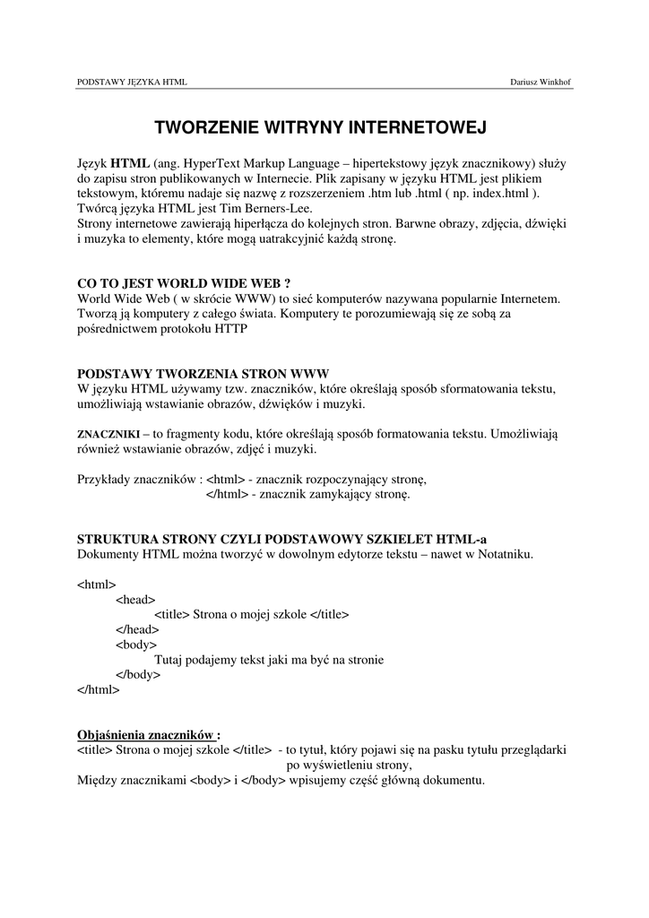 PODSTAWY JĘZYKA HTML Dariusz Winkhof TWORZENIE WITRYNY INTERNETOWEJ Język HTML (ang. HyperText Markup Language – hipertekstowy język znacznikowy) służy do zapisu stron publikowanych w Internecie. Plik zapisany w języku HTML jest plikiem tekstowym, któremu nadaje się nazwę z rozszerzeniem .htm lub .html ( np. index.html ). Twórcą języka HTML jest Tim Berners-Lee. Strony internetowe zawierają hiperłącza do kolejnych stron. Barwne obrazy, zdjęcia, dźwięki i muzyka to elementy, które mogą uatrakcyjnić każdą stronę. CO TO JEST WORLD WIDE WEB ? World Wide Web ( w skrócie WWW) to sieć komputerów nazywana popularnie Internetem. Tworzą ją komputery z całego świata. Komputery te porozumiewają się ze sobą za pośrednictwem protokołu HTTP PODSTAWY TWORZENIA STRON WWW W języku HTML używamy tzw. znaczników, które określają sposób sformatowania tekstu, umożliwiają wstawianie obrazów, dźwięków i muzyki. ZNACZNIKI – to fragmenty kodu, które określają sposób formatowania tekstu. Umożliwiają również wstawianie obrazów, zdjęć i muzyki. Przykłady znaczników : <html> - znacznik rozpoczynający stronę, </html> - znacznik zamykający stronę. STRUKTURA STRONY CZYLI PODSTAWOWY SZKIELET HTML-a Dokumenty HTML można tworzyć w dowolnym edytorze tekstu – nawet w Notatniku. <html> <head> <title> Strona o mojej szkole </title> </head> <body> Tutaj podajemy tekst jaki ma być na stronie </body> </html> Objaśnienia znaczników : <title> Strona o mojej szkole </title> - to tytuł, który pojawi się na pasku tytułu przeglądarki po wyświetleniu strony, Między znacznikami <body> i </body> wpisujemy część główną dokumentu. Uwaga : Jeśli plikowi nadasz właściwe rozszerzenie .html przy zapisywaniu swojej pracy, taki dokument będzie można oglądać za pomocą przeglądarki internetowej. Aby dalej poprawiać wygląd strony lub wprowadzać do niej zmiany, należy w otwartym oknie przeglądarki wywołać polecenie WIDOK/ŹRÓDŁO i rozpocząć dalszą pracę. Należy pamiętać, że strony przeglądają użytkownicy pracujący w różnych systemach operacyjnych i korzystający z różnych przeglądarek. W związku z tym aby polski litery (ą,ę…) były poprawnie wyświetlane, należy umieścić między znacznikami <head> i </head> zapis : <meta http-equiv = ‘Content-Type’ Content=’text/html; char set=ISO-8859-2’> PODSUMOWANIE czyli NAJWAŻNIEJSZE INFORMACJE : World Wide Web (w skrócie WWW) to sieć komputerów nazywana popularnie Internetem. Informacje dostępne są w Internecie w postaci dokumentów HTML zwanych stronami WWW. Strony WWW umieszczane są na specyficznych komputerach zwanych serwerami. Aby przeglądać strony WWW, konieczne jest nawiązanie połączenia z Internetem – za pośrednictwem modemu lub łącza stałego – i uruchomienie specjalnego programu, który nazywa się przeglądarką. URL – to skrót od Uniform Resource Locator, co można przetłumaczyć jako „uniwersalny identyfikator zasobów”. Jego postać jest mniej więcej taka: http://www.dobrastrona.com/. Adres ten określa ulokowanie strony WWW i jest podawany w polu adresu przeglądarki. Dane, które trafiły do Twojej przeglądarki, są zakodowane w specjalny sposób – są zapisane w języku HTML. Język HTML informuje przeglądarkę jak ma obsłużyć pobrane dane – informacje te są zawarte w znacznikach . Znaczniki to polecenia języka HTML umieszczone w nawiasach kątowych. Ich postać jest następująca: <znacznik otwierający>, </znacznik zamykający>. Znaczniki nie są wrażliwe na wielkość liter. Dokument HTML otwiera znacznik <html>, a zamyka znacznik </html>. Elementy strony umieszczane są między tymi znacznikami. Podstawowe elementy strony WWW to obszar nagłówka i obszar treści (sekcja head i sekcją body). Obszar nagłówka wyznaczają znaczniki <head> i </head>. Zawartość strony WWW – tekst obrazy, połączenia, itp. – jest umieszczana między znacznikami <body>, </body>. One właśnie wyznaczają drugi element strony WWW – obszar treści. Element head zawiera ogólne informacje na temat dokumentu. Umieszczane są one między innymi w znaczniku <meta>. Najczęściej są to informacje przydatne przeglądarkom lub słowa kluczowe wykorzystywane przez serwisy wyszukujące. W znaczniku <meta> można na przykład umieścić adres url, pod który przeglądarka ma się skierować, aby wyświetlić nową wersję strony WWW, lub opis dokumentu. Można także umieścić nowy adres url, pod który użytkownik zostanie automatycznie skierowany po określonym czasie. Stronę kodową ISO-8859-2 (polskie litery!) definiuje się w elemencie meta: <meta http-equiv="content-type" content="text/html; charset=ISO-8859-2">. Dariusz Winkhof