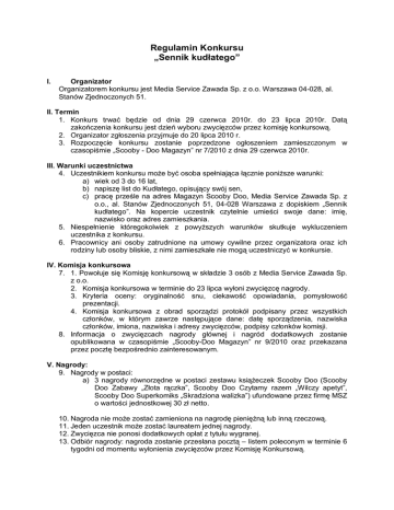 Regulamin Konkursu „Sennik kudłatego” I. Organizator Organizatorem konkursu jest Media Service Zawada Sp. z o.o. Warszawa 04-028, al. Stanów Zjednoczonych 51. II. Termin 1. Konkurs trwać będzie od dnia 29 czerwca 2010r. do 23 lipca 2010r. Datą zakończenia konkursu jest dzień wyboru zwycięzców przez komisję konkursową. 2. Organizator zgłoszenia przyjmuje do 20 lipca 2010 r. 3. Rozpoczęcie konkursu zostanie poprzedzone ogłoszeniem zamieszczonym w czasopiśmie „Scooby - Doo Magazyn” nr 7/2010 z dnia 29 czerwca 2010r. III. Warunki uczestnictwa 4. Uczestnikiem konkursu może być osoba spełniająca łącznie poniższe warunki: a) wiek od 3 do 16 lat, b) napiszę list do Kudłatego, opisujący swój sen, c) pracę prześle na adres Magazyn Scooby Doo, Media Service Zawada Sp. z o.o., al. Stanów Zjednoczonych 51, 04-028 Warszawa z dopiskiem „Sennik kudłatego”. Na kopercie uczestnik czytelnie umieści swoje dane: imię, nazwisko oraz adres zamieszkania. 5. Niespełnienie któregokolwiek z powyższych warunków skutkuje wykluczeniem uczestnika z konkursu. 6. Pracownicy ani osoby zatrudnione na umowy cywilne przez organizatora oraz ich rodziny lub osoby bliskie, z nimi zamieszkałe nie mogą uczestniczyć w konkursie. IV. Komisja konkursowa 7. 1. Powołuje się Komisję konkursową w składzie 3 osób z Media Service Zawada Sp. z o.o. 2. Komisja konkursowa w terminie do 23 lipca wyłoni zwycięzcę nagrody. 3. Kryteria oceny: oryginalność snu, ciekawość opowiadania, pomysłowość prezentacji. 4. Komisja konkursowa z obrad sporządzi protokół podpisany przez wszystkich członków, w którym zawrze następujące dane: datę sporządzenia, nazwiska członków, imiona, nazwiska i adresy zwycięzców, podpisy członków komisji. 8. Informacja o zwycięzcach nagrody głównej i nagród dodatkowych zostanie opublikowana w czasopiśmie „Scooby-Doo Magazyn” nr 9/2010 oraz przekazana przez pocztę bezpośrednio zainteresowanym. V. Nagrody: 9. Nagrody w postaci: a) 3 nagrody równorzędne w postaci zestawu książeczek Scooby Doo (Scooby Doo Zabawy „Złota rączka”, Scooby Doo Czytamy razem „Wilczy apetyt”, Scooby Doo Superkomiks „Skradziona walizka”) ufundowane przez firmę MSZ o wartości jednostkowej 30 zł netto. 10. Nagroda nie może zostać zamieniona na nagrodę pieniężną lub inną rzeczową. 11. Jeden uczestnik może zostać laureatem jednej nagrody. 12. Zwycięzca nie ponosi dodatkowych opłat z tytułu wygranej. 13. Odbiór nagrody: nagroda zostanie przesłana pocztą – listem poleconym w terminie 6 tygodni od momentu wyłonienia zwycięzców przez Komisję Konkursową.