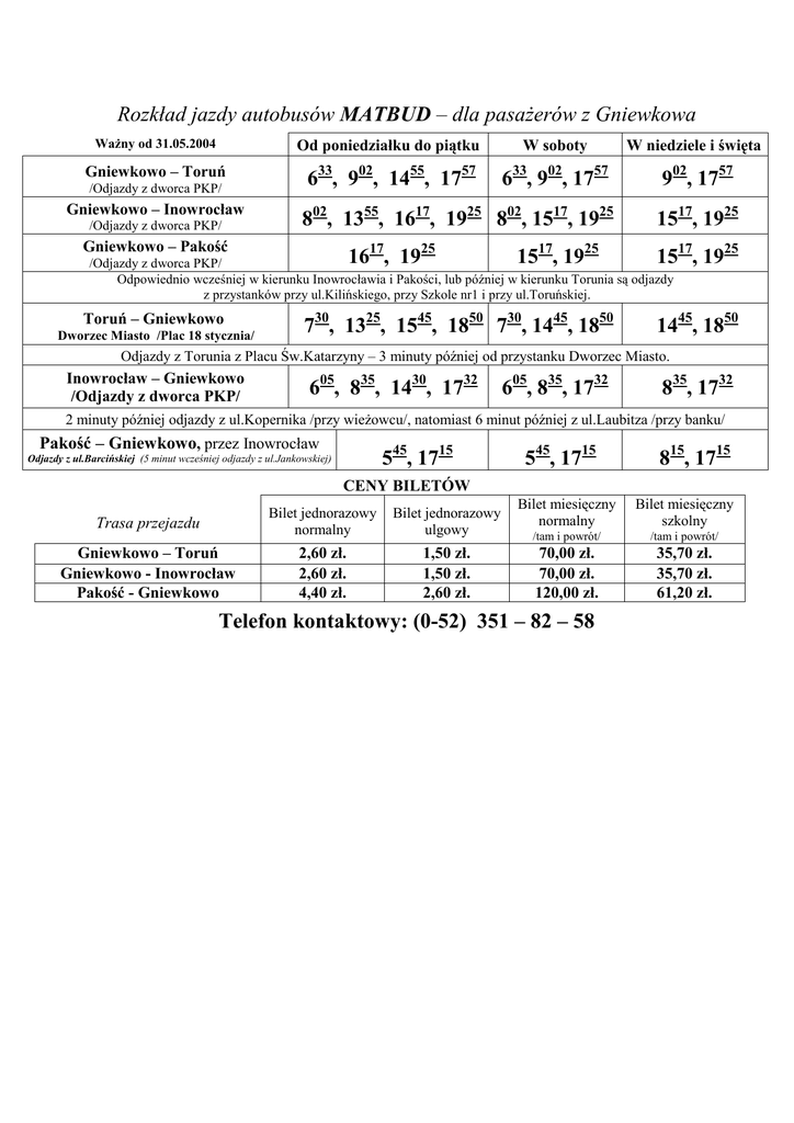 Rozkład jazdy autobusów MATBUD – dla pasaŜerów z Gniewkowa