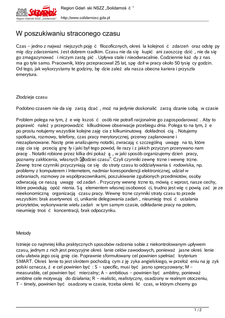 Region Gda ski NSZZ „Solidarno http://www.solidarnosc.gda.pl W poszukiwaniu straconego czasu Czas ‒ jedno z najwa niejszych poj filozoficznych, okre la kolejno zdarze oraz odst py mi dzy zdarzeniami. Jest dobrem rzadkim. Czasu nie da si kupi ani zaoszcz dzi , nie da si go zmagazynowa i niczym zast pi . Upływa stale i nieodwracalnie. Codziennie ka dy z nas ma go tyle samo. Pracownik, który przepracował 25 lat, sp dził w pracy około 50 tysi cy godzin. Od tego, jak wykorzystamy te godziny, b dzie zale ała nasza obecna kariera i przyszła emerytura. Złodzieje czasu Podobno czasem nie da si zarz dza , mo na jedynie doskonali zarz dzanie sob w czasie Problem polega na tym, e wi kszo osób nie potrafi racjonalnie go zagospodarowa . Aby to poprawi nale y przeprowadzi kilkudniowe obserwacje przebiegu dnia. Polega to na tym, e po prostu notujemy wszystkie kolejne zaj cia z kilkuminutow dokładno ci . Notujemy spotkania, rozmowy, telefony, czas pracy merytorycznej, przerwy zaplanowane i niezaplanowane. Nast pnie analizujemy notatki, zwracaj c szczególn uwag na to, które zaj cia si przeci gn ły i jaki był tego powód, ile razy i z jakich przyczyn przerywano nam prac . Notatki robione przez kilka dni poka , w jaki sposób organizujemy dzie pracy, poznamy zakłócenia, własnych „złodziei czasu . Czyli czynniki zewn trzne i wewn trzne. Zewn trzne czynniki przyczyniaj ce si do straty czasu to oddziaływania rodowiska, np. problemy z komputerem i Internetem, nadmiar korespondencji elektronicznej, udział w zebraniach, rozmowy ze współpracownikami, poszukiwanie zgubionych przedmiotów, osoby odwracaj ce nasz uwag od zada . Przyczyny wewn trzne to, mówi c wprost, nasze cechy, które powoduj opó nienia. S elementem własnej osobowo ci, trudno jest wi c powi za je ze nieekonomiczn organizacj czasu pracy. Wewn trzne czynniki straty czasu to przede wszystkim: brak asertywno ci, unikanie delegowania zada , nieumiej tno ustalania priorytetów, wykonywanie wielu zada w tym samym czasie, odkładanie pracy na potem, nieumiej tno koncentracji, brak odpoczynku. Metody Istnieje co najmniej kilka praktycznych sposobów radzenia sobie z niekontrolowanym upływem czasu, jednym z nich jest precyzyjne okre lanie celów zawodowych, poniewa jasne okre lenie celu ułatwia jego osi gni cie. Poprawnie sformułowany cel powinien spełnia kryterium SMART. Okre lenie to jest skrótem pochodz cym z j zyka angielskiego, w przeło eniu na j zyk polski oznacza, e cel powinien by : S ‒ specific, musi by jasno sprecyzowany; M ‒ measurable, cel powinien by mierzalny; A ‒ ambitious ‒ powinien by ambitny, poniewa ambitne cele motywuj do działania; R ‒ realistic, realistyczny, osadzony w realnym otoczeniu, T ‒ timely, powinien by osadzony w czasie, trzeba okre li czas, w którym chcemy go 1/2 Region Gda ski NSZZ „Solidarno http://www.solidarnosc.gda.pl zrealizowa . Cele wyznaczone za pomoc metody SMART dobrze sprawdzaj si przy celach krótko- i rednioterminowych, cele długoterminowe na ogół nie spełniaj kryteriów metody. Szukanie priorytetów, czyli odró nianie rzeczy wa nych od pilnych Umiej tno odró niania rzeczy wa nych od pilnych pomaga w ustalaniu priorytetów wykonywanych zada i podwy sza efektywno pracy. Jedn z metod wspomagaj cych ustalenie priorytetów jest zasada Pareto. Opracowana przez włoskiego ekonomist , głosi, e 80 procent wyników wypływa tylko z 20 procent przyczyn, to znaczy, e 80 procent produktywno ci pracownika jest wynikiem 20 procent dnia pracy. Wi kszo ludzi uwa a, e wszystkie przyczyny maj tak sam wag , e ka dy klient, produkt i kontakt jest tak samo wa ny i korzystny dla przedsi biorstwa. Tymczasem tylko kluczowe czynniki przyczyniaj si do powstania najkorzystniejszych wyników. W praktyce oznacza to, e: 20 procent produktów firmy daje jej 80 procent zysków, 20 procent klientów przynosi 80 procent warto ci sprzeda y. Aktywne słuchanie Wi kszo dnia pracy sp dzamy rozmawiaj c, ale czy rozumiemy si nawzajem? Przeprowadzone badania wskazuj , e 40‒70 procent czasu pracy sp dzamy na rozmowach. Umiej tno aktywnego słuchania przyczynia si znacznie do zmniejszenia strat czasu. Aktywne słuchanie pozwala wytworzy poczucie zaufania i akceptacji drugiej osoby Pomaga rozmówcy na dokładne zanalizowanie i organizacj wypowiedzi, tak by prze ledzi tok rozumowania rozmówcy. Techniki stosowane w treningu umiej tno ci aktywnego słuchania to: parafraza, czyli powtórzenie wypowiedzi naszego rozmówcy, ale w innej formie; klaryfikacja, tj. pro ba o rozwini cie tematu, który nie został całkowicie przez nas zrozumiany, mo na tutaj poprosi o podanie jakich przykładów; zadawanie pyta , które pozwol rozmówcy na szersze wypowiedzenie si i zach c do dalszej rozmowy; odzwierciedlanie uczu , polegaj ce na u wiadomieniu rozmówcy jego uczu . Racjonalne zarz dzanie czasem nie jest sztuk tak trudn , aby wi kszo z nas nie mogła jej opanowa . Przeszkody, które pojawiaj si w trakcie wypracowania tej umiej tno ci, raczej s wynikiem słabej samomotywacji ni nadmiaru zada . Przedstawione wybrane metody mog stanowi wst p do rozwini cia umiej tno ci zarz dzania czasem. W praktyce funkcjonuje wi cej metod słu cych doskonaleniu tego przymiotu. Rozwijaj one umiej tno planowania i organizowania czasu pracy, zwi kszaj samomotywacj do wykonywania zada i, aby były skuteczne, powinny by dopasowane do osobistych predyspozycji, bran y i zajmowanego stanowiska. Renata Tkaczyk [email protected] 2/2 Powered by TCPDF (www.tcpdf.org)