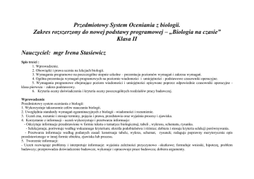 Przedmiotowy System Oceniania z biologii. Zakres rozszerzony do nowej podstawy programowej – „Biologia na czasie” Klasa II Nauczyciel: mgr Irena Stasiewicz Spis treści : 1. Wprowadzenie. 2. Obowiązki i prawa ucznia na lekcjach biologii. 3. Wymagania programowe na poszczególne stopnie szkolne – prezentacja poziomów wymagań i zakresu wymagań. 4. Ogólna prezentacja wymagań programowych na poziomie wiadomości i umiejętności - podstawowe czasowniki operacyjne. 5. Wymagania programowe obejmujące poziom wiadomości i umiejętności opisywane poprzez odpowiednie czasowniki operacyjne klasa pierwsza – zakres podstawowy. 6. Kryteria oceny doświadczenia i kryteria oceny poszczególnych rozdziałów pracy badawczej. Wprowadzenie Przedmiotowy system oceniania z biologii: 1. Wykorzystuje taksonomie celów nauczania biologii. 2. Uwzględnia standardy wymagań egzaminacyjnych z biologii - wiadomości i rozumienie. 3. Uczeń zna, rozumie i stosuje terminy, pojęcia i prawa, przedstawia oraz wyjaśnia procesy i zjawiska. 4. Korzystanie z informacji - uczeń wykorzystuje i przetwarza informacje: - Odczytuje informacje przedstawione w formie tekstu o tematyce biologicznej; tabeli , wykresu, schematu, rysunku. - Selekcjonuje, porównuje według wskazanego kryterium; określa podobieństwa i różnice; dobiera i stosuje kryteria selekcji porównywania. - Przetwarza informacje według podanych zasad: konstruuje tabele, wykres, schemat, rysunek; redaguje poprawny merytorycznie opis przedstawionego w innej formie obiektu, zjawiska lub procesu. 5. Tworzenie informacji: - Uczeń rozwiązuje problemy i interpretuje informacje: wyjaśnia zależności przyczynowo –skutkowe; formułuje wnioski, hipotezę, problem badawczy; przeprowadza doświadczenie badawcze, wykonuje i opracowuje prace badawcza; dobiera argumenty. Obowiązki ucznia na lekcjach biologii zgodne z Szkolnym System Oceniania Przedstawiam przykładowe wymagania programowe obejmujące poziom wiadomości i umiejętności opisywane poprzez odpowiednie czasowniki operacyjne dla poziomu podstawowego i rozszerzonego, oczekiwany zakres odpowiedzi w zależności od czasownika operacyjnego w oparciu o wybrane przykłady, kryteria oceny doświadczenia i kryteria oceny poszczególnych rozdziałów pracy badawczej. Obowiązki i prawa ucznia na lekcjach biologii – KOTRAKT Z UCZNIEM 1. Informacje o terminie, formie i zakresie planowanych sprawdzianów podawane są z tygodniowym wyprzedzeniem. 2. Stosowaną formą sprawdzenia bieżących wiadomości jest kartkówka zapowiedziana ( obejmuje trzy ostatnie lekcje) i kartkówka niezapowiedziana ( ostatnia lekcja). 3. Oceny z kartkówek i odpowiedzi podlegają poprawie. 4. Uczeń, który z ważnych przyczyn nie był obecny za sprawdzianie pisemnym ma prawo napisać sprawdzian do dwóch tygodni od terminu oddania sprawdzianów. 5. Uczeń może poprawić ocenę ze sprawdzianu w ciągu dwóch tygodni od rozdania prac. 6. Ocena z poprawy sprawdzianu jest oceną ostateczną wpisaną obok oceny niedostatecznej z tego sprawdzianu. 7. Na koniec semestru uczeń, który chce podwyższyć ocenę ( semestralną lub końcoworoczną ) pisze sprawdzian zaliczeniowy składający się z zadań i wiadomości obejmujących dany semestr. Termin pisania sprawdzianu uczeń uzgadnia z nauczycielem 8. Obowiązkiem ucznia jest prowadzenie zeszytu: każda kolejna lekcja musi mieć datę i numer. 9. Obowiązkiem ucznia jest samodzielne wykonywanie prac domowych, prowadzenie Karty Pracy Ucznia , prostych doświadczeń ( za co najmniej dwukrotne niewykonanie pracy domowej, brak samodzielności przy jej wykonaniu uczeń otrzymuje ocenę niedostateczną ). 10. Obowiązkiem ucznia jest zapoznanie się z wymaganiami na poszczególne stopnie szkolne, oraz przedstawionymi w pracowni materiałami dotyczącymi: - oczekiwanego zakresu odpowiedzi w zależności od rodzaju czasownika operacyjnego, - schematami realizacji typowych zadań . 11. Uczeń z orzeczeniem o nauczaniu indywidualnym ma dostosowany poziom nauczania i wymagania zgodnie z zaleceniami zawartymi w orzeczeniu. 12. Na lekcjach biologii ocenie podlegają – pisemne sprawdziany i kartkówki, odpowiedzi ustne , zadania domowe, karty pracy, aktywność , samodzielność i zaangażowanie w wykonywaniu i planowaniu doświadczeń. Oceny zapisywane są w dzienniku lekcyjnym. Wymagania programowe na poszczególne stopnie szkolne – prezentacja poziomów wymagań i zakresu wymagań Wymagania programowe to oczekiwane lub założone osiągnięcia uczniów Poziom podstawowy (P) to wymagania: Konieczne (K)- wiadomości i umiejętności pozwalające na uzyskanie oceny dopuszczającej Podstawowe (P) - wiadomości i umiejętności, które wraz z wiadomości i umiejętności na ocenę dopuszczającą pozwalają na uzyskanie oceny dostatecznej Poziom ponadpodstawowy (PP) to wymagania: Rozszerzające ( R )- to wiadomości i umiejętności, które wraz z wiadomości i umiejętności koniecznymi, podstawowymi i rozszerzonymi umożliwiają uzyskanie oceny dobrej Dopełniające ( D) - to wiadomości i umiejętności, które wraz z wiadomości i umiejętności koniecznymi, podstawowymi, rozszerzonymi i dopełniającymi umożliwiają uzyskanie oceny bardzo dobrej i celującej czyli: Ocena dopuszczająca = wymagania K Ocena dostateczna = wymagania K + wymagania P Ocena dobra = wymagania K+ wymagania P + wymagania R Ocena bardzo dobra = wymagania K+ wymagania P + wymagania R + wymagania D Ogólna prezentacja wymagań programowych na poziomie wiadomości i umiejętności - podstawowe czasowniki operacyjne Poziom wiadomości : Kategoria celu : Czasowniki operacyjne i wymaganie Znajomość A - zapamiętywanie Wymagania konieczne: wymienić, definiować, rozpoznać, wyliczyć, usunąć, umiejscowić, opowiadać, nazwać, identyfikować, podkreślić: 1.nazw, terminów, definicji, budowy organizmu, czynności fizjologicznych, 2. warunków życia organizmu 3. odtwórcza znajomość doświadczeń i ekspe