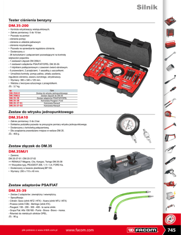 Silnik Tester ciśnienia benzyny DM.35-200 • Kontrola wtryskiwaczy wielopunktowych. • Zakres pomiarowy: 0 do 10 bar. • Pozwala na pomiar: - ciśnienia pompy - ciśnienia w układzie paliwowym - ciśnienia rezydualnego. • Pozwala na sprawdzanie regulatora ciśnienia. • Dostarczany z: - 26 końcówkami i połączeniami pozwalającymi na kontrolę większości pojazdów. - 1 zestawem złączek DM.35MJ1. - 1 zestawem adapterów PSA/FIAT/OPEL DM.35-39. - 1 trójnikiem podłączeniowym z zaworem ćwierć-obrotowym. - 5 przewodami, 2 przejściami, 1 saszetką z uszczelkami. • Umożliwia kontrolę: pompy paliwa, układu zasilania, regulatora ciśnienia, zaworu zwrotnego, wtryskiwaczy. • Wymiary: 360 x 340 x 125 mm. • Walizka z tworzywa sztucznego z przegródkami. D : 3,7 kg. F DM.35A10 DM.35MJ1 DM.35-39 DM.35-38 DM.35-37-01 DM.35-37-02 Opis Zestaw do wtrysku jednopunktowego Zestaw złączek do DM.35 Zestaw adaptorów PSA/FIAT/OPEL Końcówka Peugeot i Ford Końcówka Renault Końcówka Renault Zestaw do wtrysku jednopunktowego DM.35A10 • Zakres pomiarowy: 0 do 2 bar. • Dokładna podziałka pozwala na precyzyjne pomiary wtrysku jednopunktowego. • Dostarczany z końcówką połączeniową. • Dla urządzenia przewidziano miejsce w walizce DM.35. D : 400 g. Zestaw złączek do DM.35 DM.35MJ1 • Zawiera: DM.35-37-01 i DM.35-37-02 >> RENAULT Mégane, Clio, Kangoo, Twingo DM.35-38 >> Wszystkie typy, PEUGEOT 206, 1,1l i 1,4l, FORD Ka. • Dostarczany w kasecie plastikowej BP.100. • Wymiary: 200 x 110 x 40 mm. Zestaw adaptorów PSA/FIAT DM.35-39 • Zestaw 2 adaptorów: zewnętrzny i wewnętrzny. • Specyfikacja: - Citroën: Saxo (silnik NFZ i HFX) - Xsara (silnik NFU i KFX) - Picasso (silnik FZB) - Berlingo (silnik lFX). - Peugeot: 106 - 206 - 306 - 406 - te same silniki. - Grupa Fiat: Alfa 156/166 - Punto - Brava - Bravo - marea. - Również do niektórych silników OPEL. D : 90 g. plik pobrano z www.imbth.com.pl www.facom.com 745
