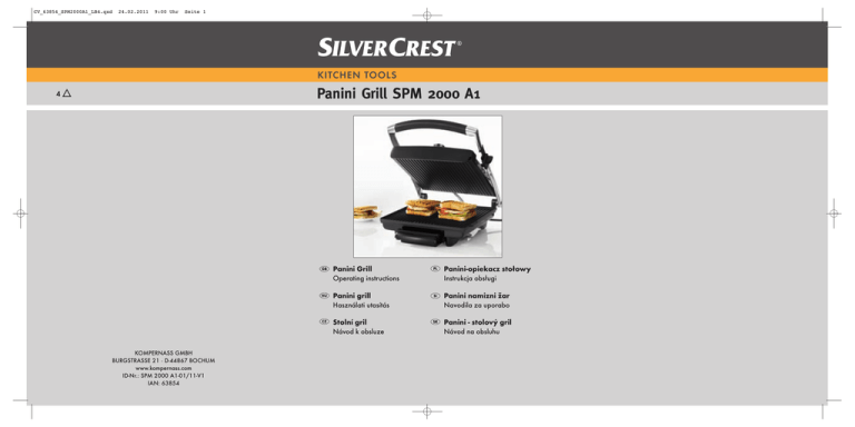 CV_63854_SPM2000A1_LB4.qxd 24.02.2011 9:00 Uhr Seite 1 KITCHEN TOOLS Panini Grill SPM 2000 A1 4 KOMPERNASS GMBH BURGSTRASSE 21 · D-44867 BOCHUM www.kompernass.com ID-Nr.: SPM 2000 A1-01/11-V1 IAN: 63854 Panini Grill Operating instructions Panini-opiekacz stołowy Instrukcja obsługi Panini grill Használati utasítás Panini namizni žar Navodila za uporabo Stolní gril Návod k obsluze Panini - stolový gril Návod na obsluhu CV_63854_SPM2000A1_LB4.qxd 24.02.2011 9:00 Uhr Seite 4 SPM 2000 A1 1 2 3 4 5 6 9 0 8 7 IB_63854_SPM2000A1_LB4 02.03.2011 10:12 Uhr CONTENT Seite 1 PAGE Intended Use 2 Safety instructions 2 Technical data 3 Items supplied 3 Description of the appliance 3 Commissioning 3 Operation 3 Tips and Tricks 4 Cleaning and Care 5 Storage 5 Recipes 5 Spinach & Cheese Panini . . . . . . . . . . . . . . . . . . . . . . . . . . . . . . . . . . . . . . . . . . . . . . . . . . . . .5 Chickenbreast Panini . . . . . . . . . . . . . . . . . . . . . . . . . . . . . . . . . . . . . . . . . . . . . . . . . . . . . . . . .6 Mustard Baguette . . . . . . . . . . . . . . . . . . . . . . . . . . . . . . . . . . . . . . . . . . . . . . . . . . . . . . . . . . .6 Disposal 7 Warranty and Service 7 Importer 8 Read the operating instructions carefully before using the appliance for the first time and preserve this booklet for later reference. Pass the manual on to whomsoever might acquire the appliance at a later date. -1- IB_63854_SPM2000A1_LB4 02.03.2011 10:12 Uhr PANINI GRILL Seite 2 • Arrange for defective power plugs and/or cables to be replaced at once by qualified technicians or our Customer Service Department. • Repairs may only be carried out by experienced specialists or workshops authorised to do so by the manufacturer. Intended Use This Panini Grill is intended for toasting small bread rolls and sandwiches or for grilling other foodstuffs. It is intended for domestic use only, it is not intended for use in commercial applications. How to avoid the risk of fire and injury • Place your Panini Maker on a flat, non-slip and heat-resistant surface and not on or close to other appliances that could emit a significant level of heat (e.g. toasters, kitchen ovens). • Do not operate the appliance close to easily flammable objects, such as curtains or next to rolls of paper towels. Safety instructions How to avoid the risks of an electrical shock • The Panini Maker may only be used in dry rooms indoors. Protect the appliance from spray water – even when it is switched off. • Use the appliance only if the local mains voltage complies with the rated voltage of the appliance. • Do not connect the appliance to a multiple connection power socket on which other electrical devices are operating at the same time; this could lead to an overload of the power circuit. • Switch the appliance off after every use. Additionally, disconnect the power plug. • When cleaning, ensure that water cannot permeate into the appliance. NEVER clean the appliance under running water. Even when used properly, some parts of the appliance become very hot (such as the top and bottom housing plates). After switching the appliance off, take care not to touch these surfaces until they have cooled down completely. • To avoid a dangerous overheating, ALWAYS unwind the full length of the power cable. • During use, the Panini Maker can be opened and closed without risk by using the heat-insulated grip. • This appliance is not intended for use by individuals (including children) with restricted physical, physiological or intellectual abilities or deficiences in experience and/or knowledge unless they are supervised by a person responsible for their safety or receive from this person instruction in how the appliance is to be used. • Children should be supervised to ensure that they do not play with the appliance. NEVER submerse the appliance in water or other liquids. • Protect the power cable from damage. Be careful not to pinch/squeeze it, and keep it away from hot objects. Do not allow the power cable to hang freely from a table or workcounter. • NEVER open the housing of the appliance. -2- IB_63854_SPM2000A1_LB4 02.03.2011 10:12 Uhr Commissioning • Do not operate this appliance by means of an external time switch or a separate remote control system. • After switching it off, allow the appliance to cool completely before cleaning and storing it. 1. Take the appliance out of the packaging. Remove all additional transport packing, e.g. plastic wrap or cable holders. 2. Before the first usage, check that all items have been delivered and there are no visible damages. 3. Read these operating instructions carefully. 4. Set up the appliance according to the safety instructions. 5. Open the safety lock 4 . 6. Clean the appliance with a damp cloth as described in "Cleaning and Care". 7. Close the appliance. 8. Insert the plug into a power socket and allow the appliance to heat up at its maximum temperature setting for approx. 5 minutes. You can thus prevent the appliance from being damaged • To avoid damaging the non-stick coating of the Sandwich Maker, remove your cooked foods only with a plastic or wooden spatula or some other suitable, non-metallic implement. • For the same reason, do not use abrasive cleaners and sharp objects to clean the appliance. Technical data Power rating: Power consumption : Note: 220-240 V, ~ 50 Hz 2000 W Due to manufacturing residues, this initial heating up could result in a light production of odour and smoke. This is completely normal and is not dangerous. Provide for sufficient ventilation, for example, open a window. Items supplied • • • • Seite 3 Panini Grill Grease catchment tray Cleaning scraper Operating Instructions 9. After being heated up, remove the plug from the wall socket and allow the appliance to cool down. 10. Clean the appliance once more with a damp cloth. Description of the appliance Operation 1 Heat level regulator 2 Red control lamp “Power
