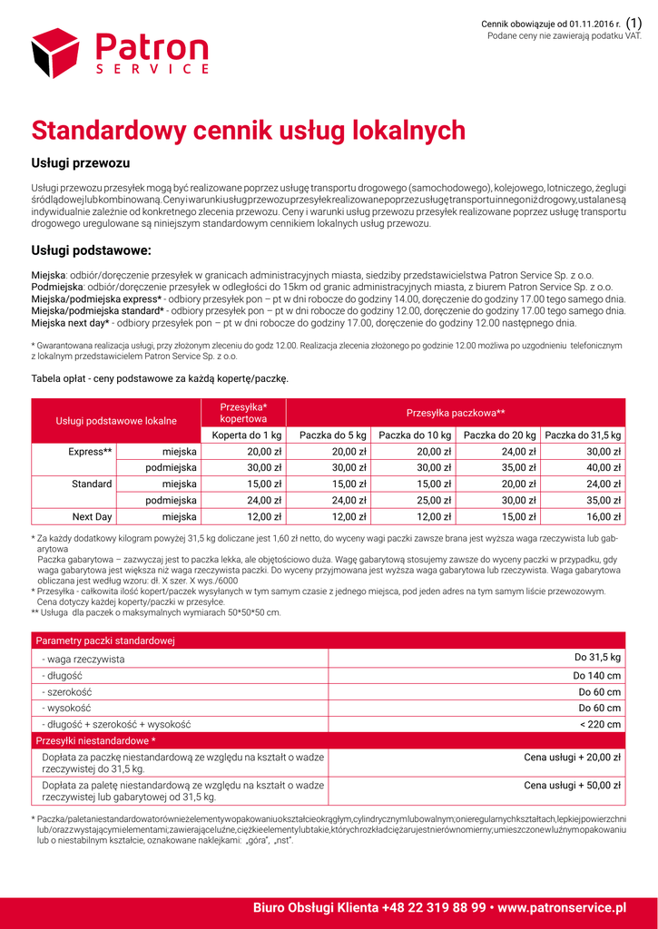 Cennik obowiązuje od 01.11.2016 r. (1) Podane ceny nie zawierają podatku VAT. Standardowy cennik usług lokalnych Usługi przewozu Usługi przewozu przesyłek mogą być realizowane poprzez usługę transportu drogowego (samochodowego), kolejowego, lotniczego, żeglugi śródlądowej lub kombinowaną. Ceny i warunki usług przewozu przesyłek realizowane poprzez usługę transportu innego niż drogowy, ustalane są indywidualnie zależnie od konkretnego zlecenia przewozu. Ceny i warunki usług przewozu przesyłek realizowane poprzez usługę transportu drogowego uregulowane są niniejszym standardowym cennikiem lokalnych usług przewozu. Usługi podstawowe: Miejska: odbiór/doręczenie przesyłek w granicach administracyjnych miasta, siedziby przedstawicielstwa Patron Service Sp. z o.o. Podmiejska: odbiór/doręczenie przesyłek w odległości do 15km od granic administracyjnych miasta, z biurem Patron Service Sp. z o.o. Miejska/podmiejska express* - odbiory przesyłek pon – pt w dni robocze do godziny 14.00, doręczenie do godziny 17.00 tego samego dnia. Miejska/podmiejska standard* - odbiory przesyłek pon – pt w dni robocze do godziny 12.00, doręczenie do godziny 17.00 tego samego dnia. Miejska next day* - odbiory przesyłek pon – pt w dni robocze do godziny 17.00, doręczenie do godziny 12.00 następnego dnia. * Gwarantowana realizacja usługi, przy złożonym zleceniu do godz 12.00. Realizacja zlecenia złożonego po godzinie 12.00 możliwa po uzgodnieniu telefonicznym z lokalnym przedstawicielem Patron Service Sp. z o.o. Tabela opłat - ceny podstawowe za każdą kopertę/paczkę. Usługi podstawowe lokalne Przesyłka* kopertowa Koperta do 1 kg Express** Przesyłka paczkowa** Paczka do 5 kg Paczka do 10 kg Paczka do 20 kg Paczka do 31,5 kg miejska 20,00 zł 20,00 zł 20,00 zł 24,00 zł 30,00 zł podmiejska 30,00 zł 30,00 zł 30,00 zł 35,00 zł 40,00 zł miejska 15,00 zł 15,00 zł 15,00 zł 20,00 zł 24,00 zł Standard podmiejska 24,00 zł 24,00 zł 25,00 zł 30,00 zł 35,00 zł miejska 12,00 zł 12,00 zł 12,00 zł 15,00 zł 16,00 zł Next Day * Za każdy dodatkowy kilogram powyżej 31,5 kg doliczane jest 1,60 zł netto, do wyceny wagi paczki zawsze brana jest wyższa waga rzeczywista lub gabarytowa Paczka gabarytowa – zazwyczaj jest to paczka lekka, ale objętościowo duża. Wagę gabarytową stosujemy zawsze do wyceny paczki w przypadku, gdy waga gabarytowa jest większa niż waga rzeczywista paczki. Do wyceny przyjmowana jest wyższa waga gabarytowa lub rzeczywista. Waga gabarytowa obliczana jest według wzoru: dł. X szer. X wys./6000 * Przesyłka - całkowita ilość kopert/paczek wysyłanych w tym samym czasie z jednego miejsca, pod jeden adres na tym samym liście przewozowym. Cena dotyczy każdej koperty/paczki w przesyłce. ** Usługa dla paczek o maksymalnych wymiarach 50*50*50 cm. Parametry paczki standardowej - waga rzeczywista Do 31,5 kg - długość Do 140 cm - szerokość Do 60 cm - wysokość Do 60 cm - długość + szerokość + wysokość < 220 cm Przesyłki niestandardowe * Dopłata za paczkę niestandardową ze względu na kształt o wadze rzeczywistej do 31,5 kg. Cena usługi + 20,00 zł Dopłata za paletę niestandardową ze względu na kształt o wadze rzeczywistej lub gabarytowej od 31,5 kg. Cena usługi + 50,00 zł * Paczka/paletaniestandardowatorównieżelementywopakowaniuokształcieokrągłym,cylindrycznymlubowalnym;onieregularnychkształtach,lepkiejpowierzchni lub/oraz z wystającymi elementami; zawierające luźne, ciężkie elementy lub takie, których rozkład ciężaru jest nierównomierny; umieszczone w luźnym opakowaniu lub o niestabilnym kształcie, oznakowane naklejkami: „góra”, „nst”. Biuro Obsługi Klienta +48 22 319 88 99 • www.patronservice.pl Cennik obowiązuje od 01.11.2016 r. (2) Podane ceny nie zawierają podatku VAT. Tabela opłat - ceny podstawowe za każdą paczkę/paletę. Palety są realizowane w usłudze lokalnej, miejskiej - next day. Odbiory przesyłek poniedziałek - piątek w dni robocze do godziny 17.00, doręczenia do godziny 17.00 następnego dnia roboczego. Zlecenia należy składać do godziny 13.00, w przeciwnym razie odbiór przesyłek nie jest gwarantowany w danym dniu. Pół-paleta do 200 kg 89,00 zł Paczka/paleta do 100 kg 120,00 zł Paczka/paleta do 200 kg 140,00 zł Paczka/paleta do 300 kg 160,00 zł Paczka/paleta do 500 kg 200,00 zł Paczka/paleta do 800 kg 250,00 zł Paleta standardowa to takia której maksymalna wysokość wynosi 180 cm o podstawie 120 cm na 80 cm Parametry palety niestandardowej podstawa 120x100 cena standardowa za paletę + 100 zł podstawa 120x120 cena standardowa za paletę + 100 zł Paleta niestrandardowa może osiągac wysokosć do 200 cm; suma wszystkich boków nie może przekroczyć 440 cm Parametry palety standardowej Do 800 kg waga długość Do 120 cm szerokość Do 80 cm wysokość Do 180 cm długość + szerokość + wysokość ≤ 380 cm W przypadku paczek: niestandardowych, gabarytowych, dłużyc przewóz następuje na odrębnym liście przewozowym dla każdej paczki. Ubezpieczenie przesyłki Deklaracja wartości przesyłki na liście przewozowym: w przypadku zadeklarowania wartości przesyłki (ubezpieczenia) obowiązkowe jest opisanie zawartości przesyłki na liście przewozowym. Do 500 zł Cena usługi + 0,50 zł Od 501 zł do 5000 zł Cena usługi + 1,00 zł Od 5001 zł do 20000 zł Cena usługi + 2,00 zł Od 20001 zł do 50000 zł Cena usługi + 3,00 zł Od 50001 zł do 100000 zł Cena usługi + 0,2 % deklarowanej wartości ubezpieczenia Usługi dodatkowe Zastrzeżenie godziny doręczenia przesyłki* - dostawa o godzinie: 13:00, 14:00, 15:00, 16:00. ROD Standard - zwrot podpisanych dokumentów. Zwrot dokumentów dołączonych do przesyłki w terminie do 5 dni roboczych, począwszy od dnia następnego po doręczeniu przesyłki. COD Standard – pobranie należności – maksymalna kwota pobrania do 6 500 zł na jednym liście przewozowym. Wpłata na 